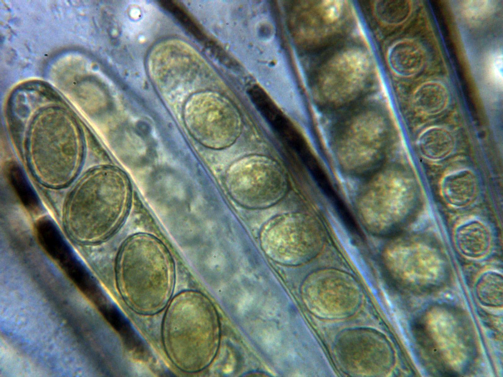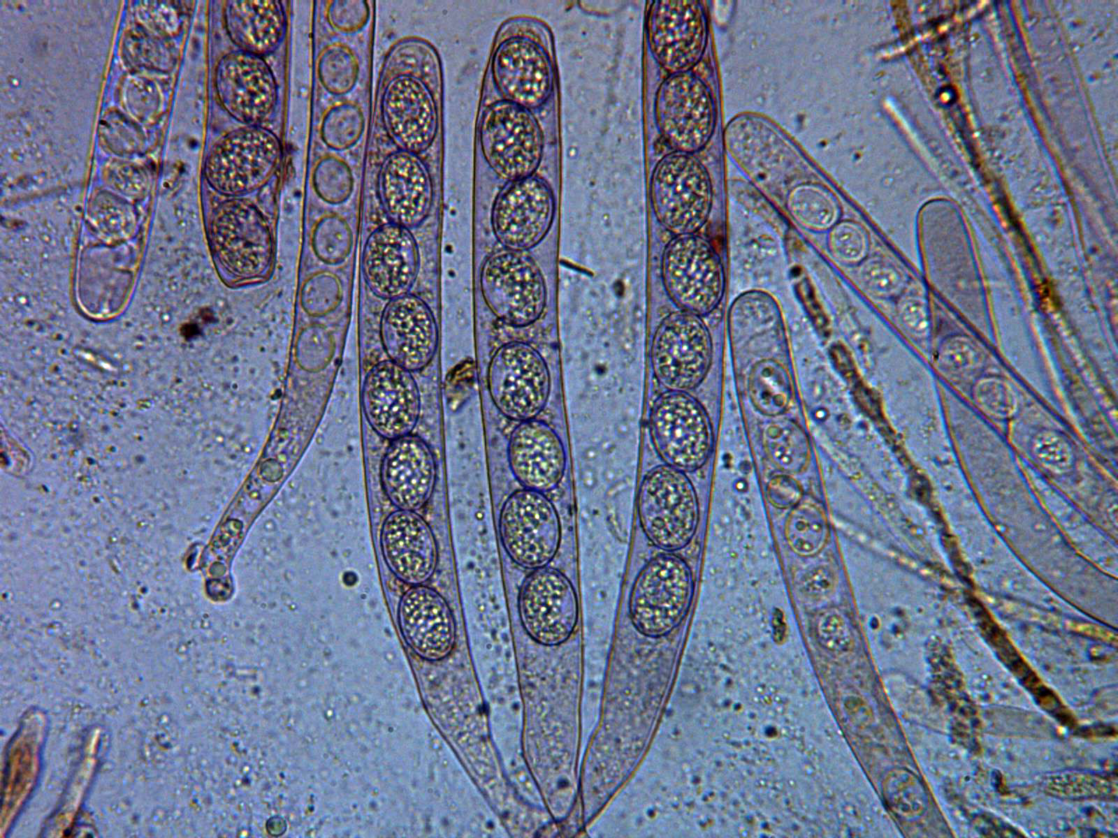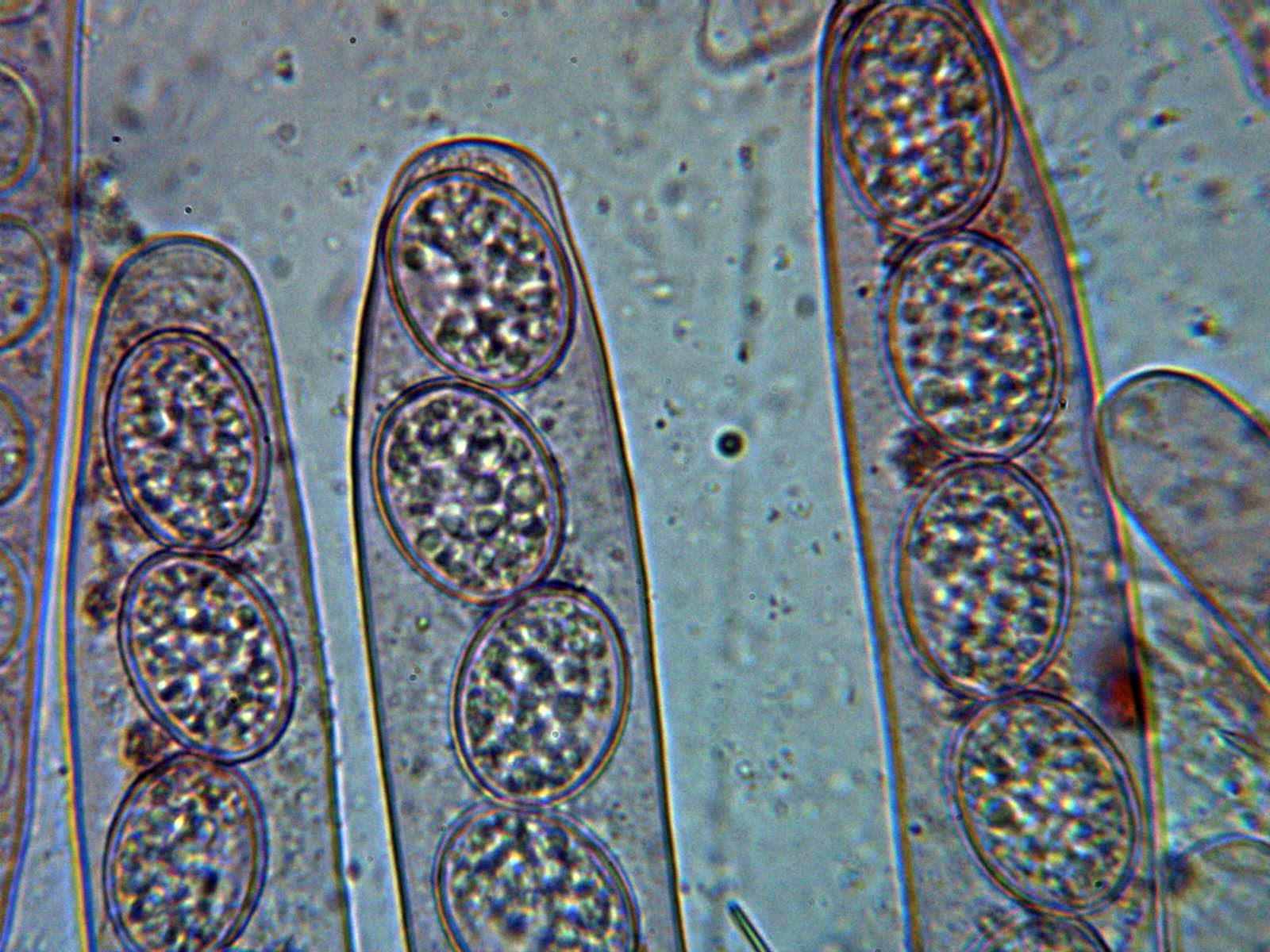 Ascas octospóricas, uniseriadas con unas medidas de 195 a 226 µm. de largo y una anchura de entre 21,6 a 24 µm. (según bibliografía de 170-240 x 21-25 µm.)