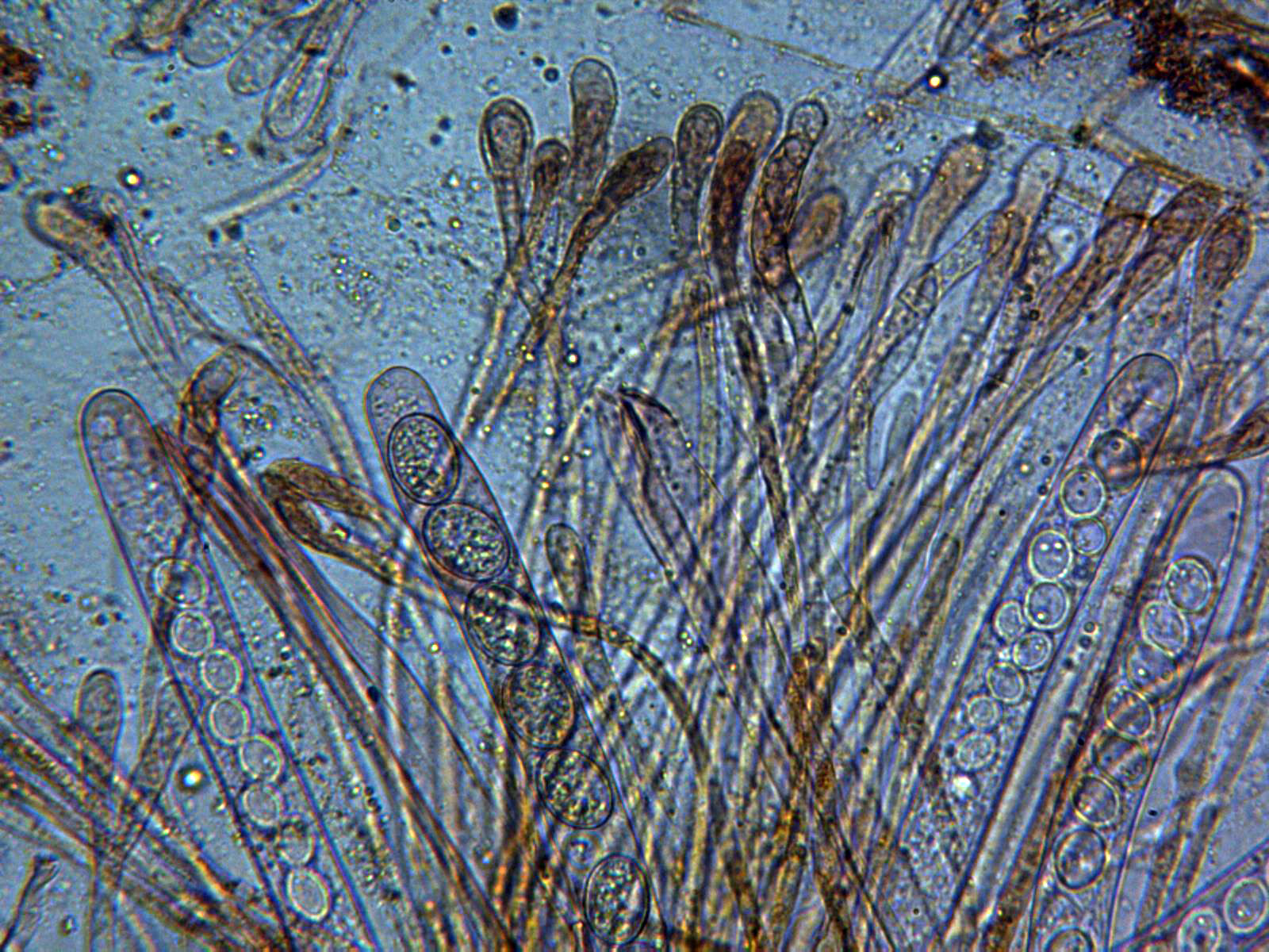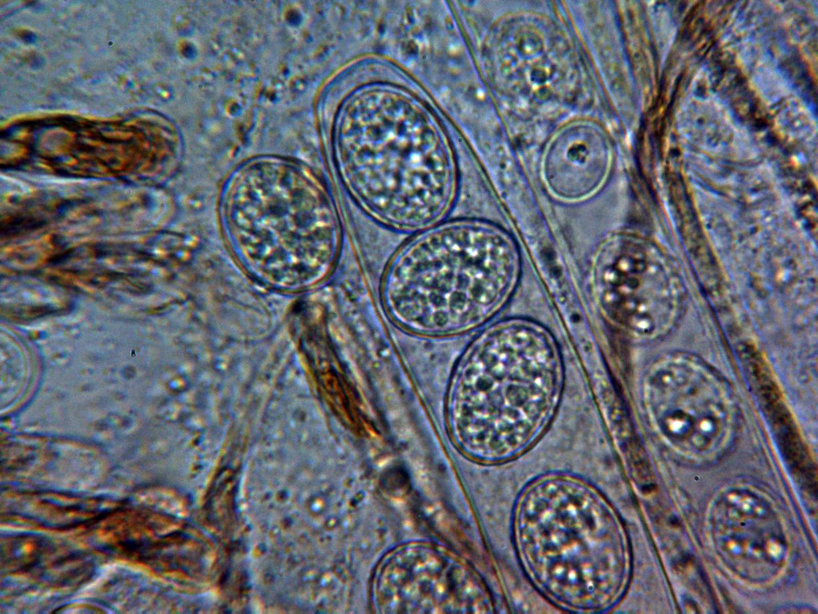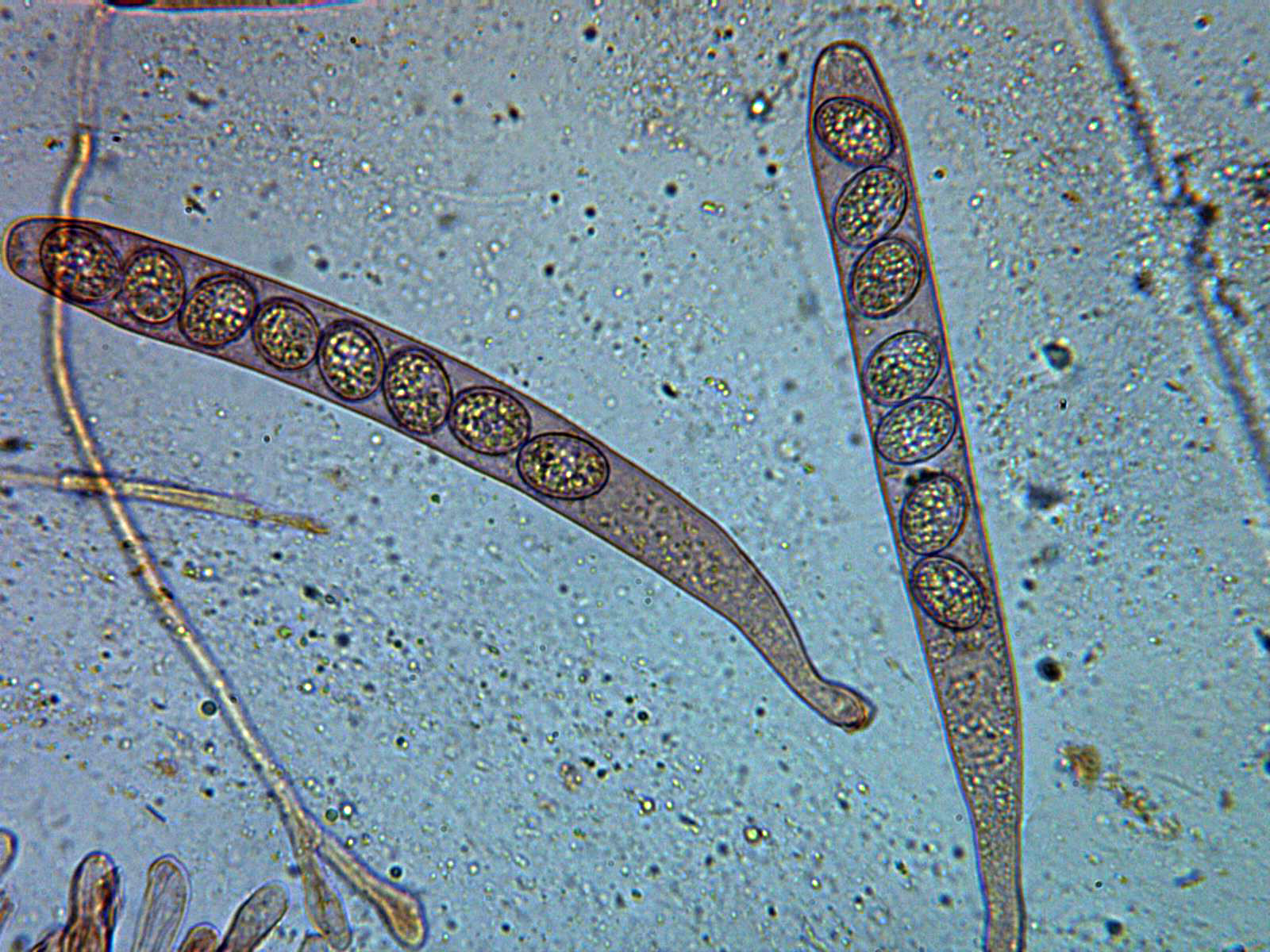 Ascas octospóricas, uniseriadas con unas medidas de 195 a 226 µm. de largo y una anchura de entre 21,6 a 24 µm. (según bibliografía de 170-240 x 21-25 µm.)
