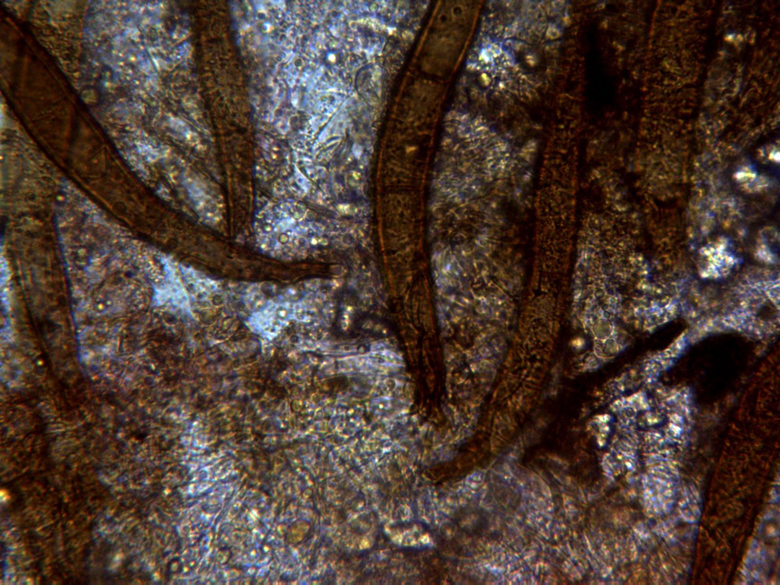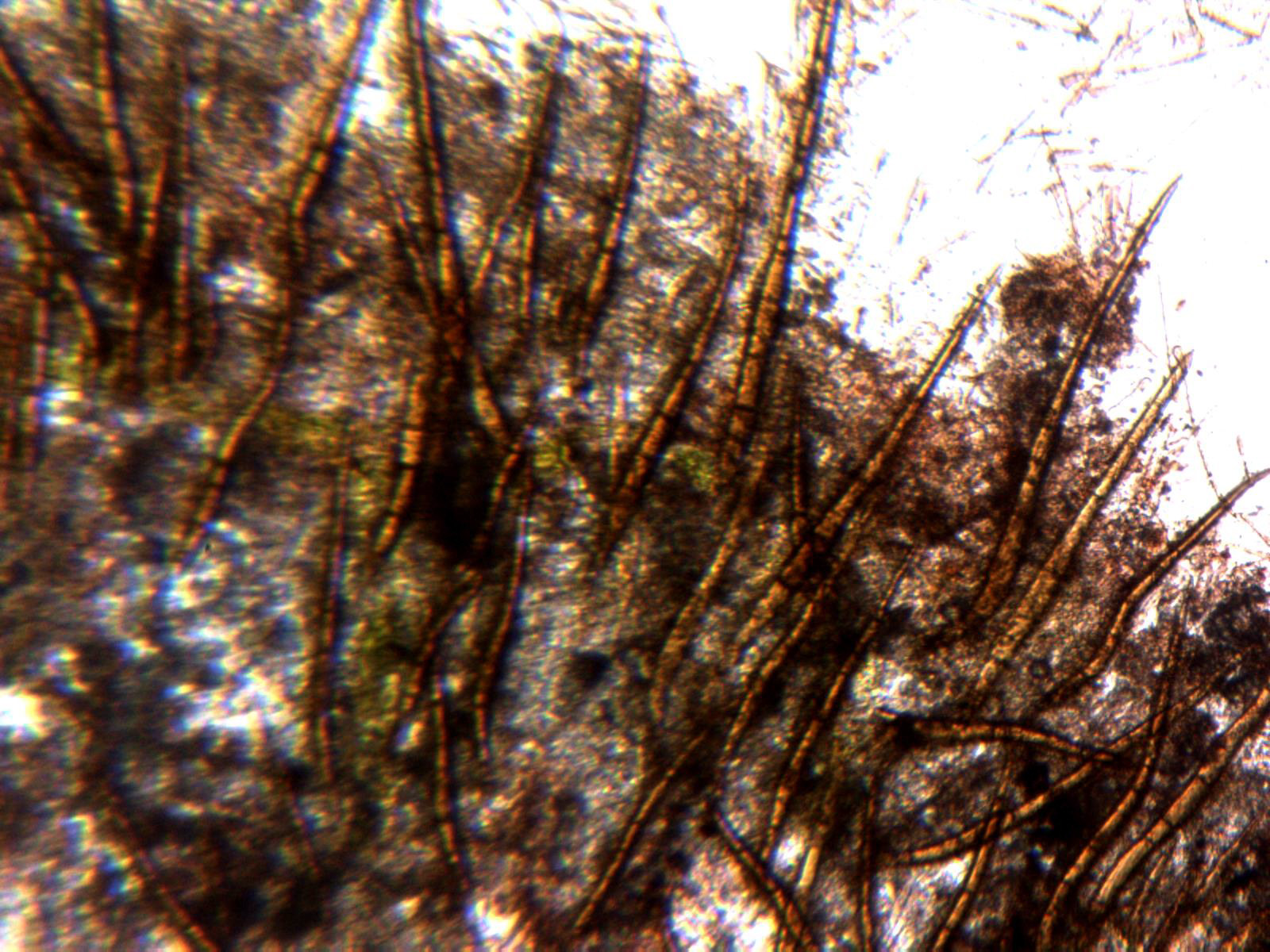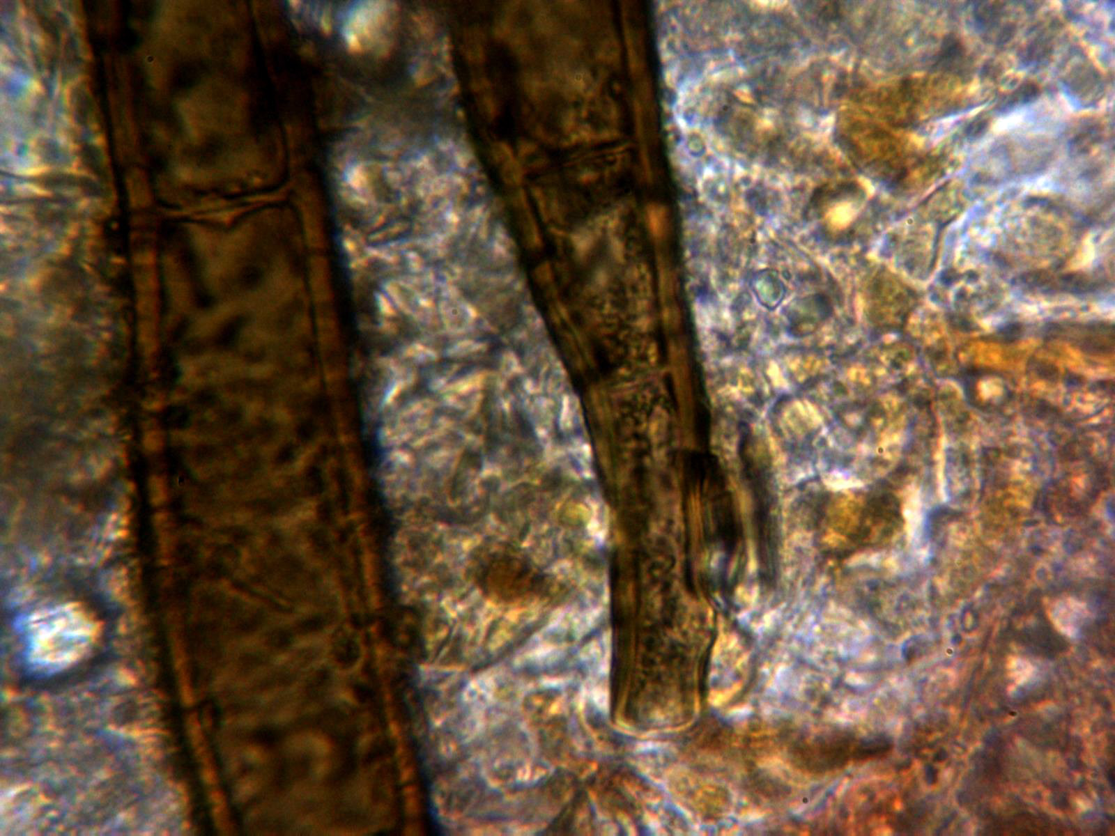 Pelos marginales con una longitud de de 280 a 350 µm. y con una anchura de entre 18 y 23 µm. (según bibliografía de 220-430 x 15-23 µm.) con la base simple o bifurcada, nunca trifurcada, de color marrón, terminados en forma puntiaguda de paredes gruesas y septados.