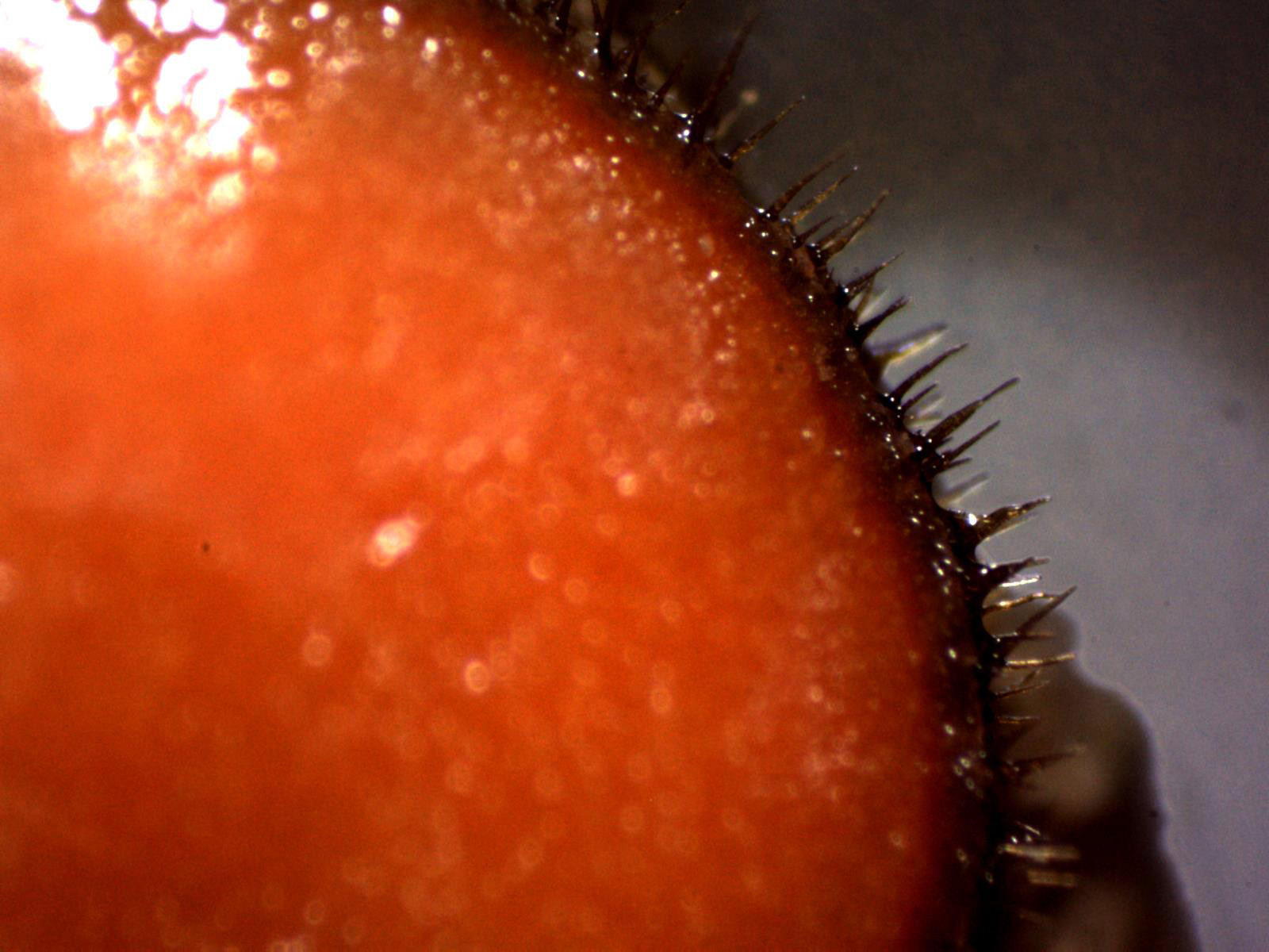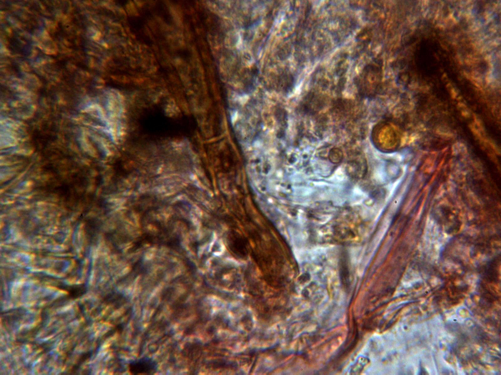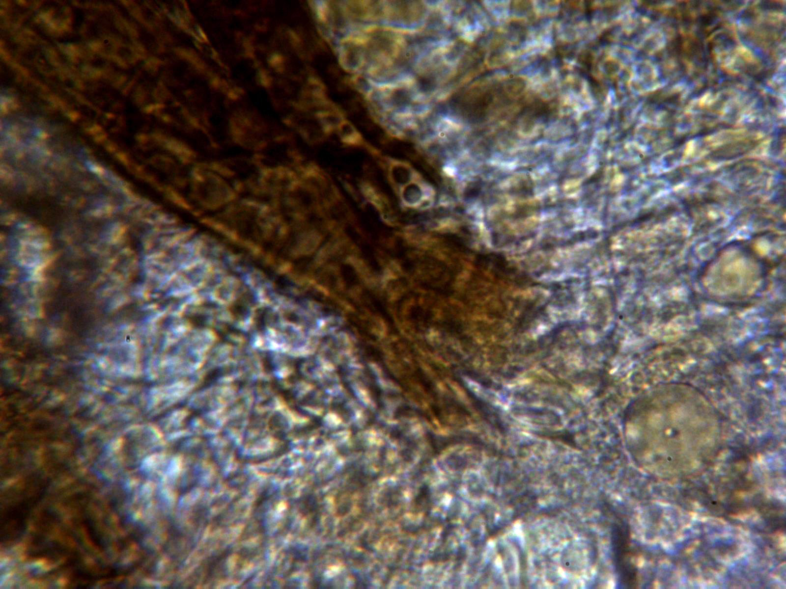 Pelos marginales con una longitud de de 280 a 350 µm. y con una anchura de entre 18 y 23 µm. (según bibliografía de 220-430 x 15-23 µm.) con la base simple o bifurcada, nunca trifurcada, de color marrón, terminados en forma puntiaguda de paredes gruesas y septados.