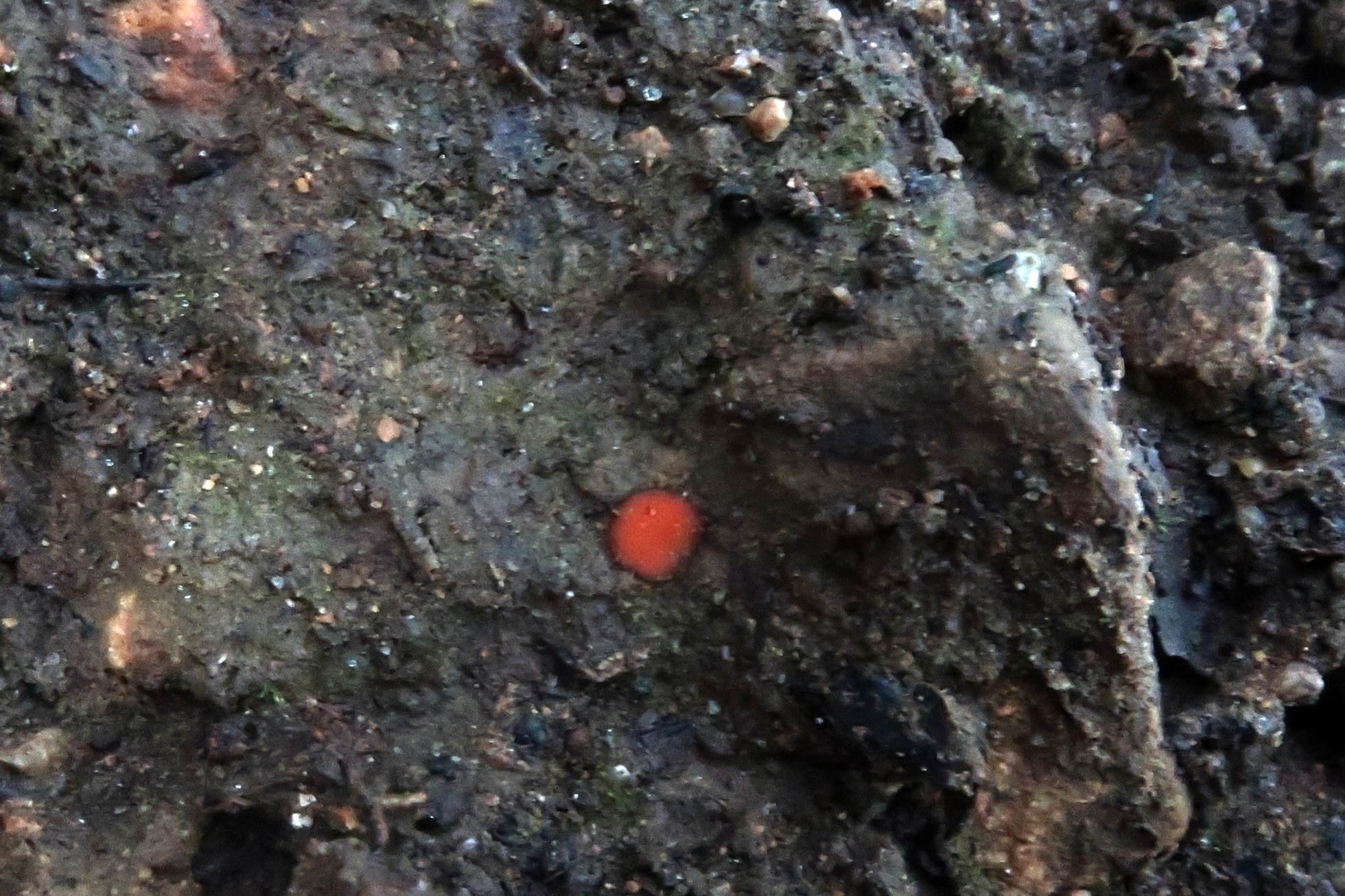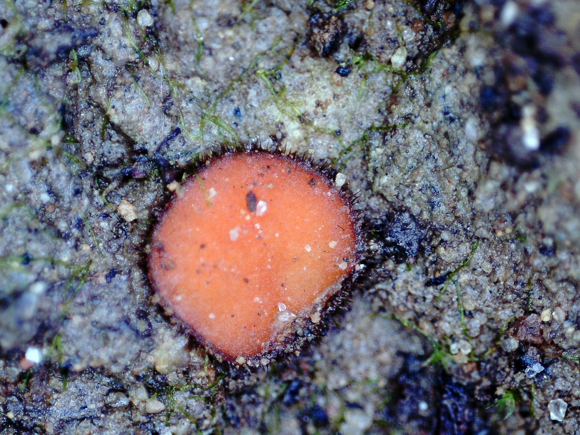Un solo apotecio de 3 mm. de diámetro (según bibliografía hasta 4 mm.) de color anaranjado y con el margen cubierto de pelos cortos, fotografiado el pasado domingo brotando en el suelo y cerca de una charca que sirve de abrevadero para los jabalíes.