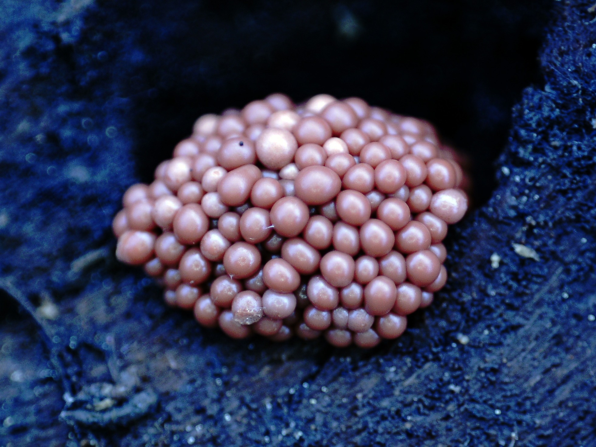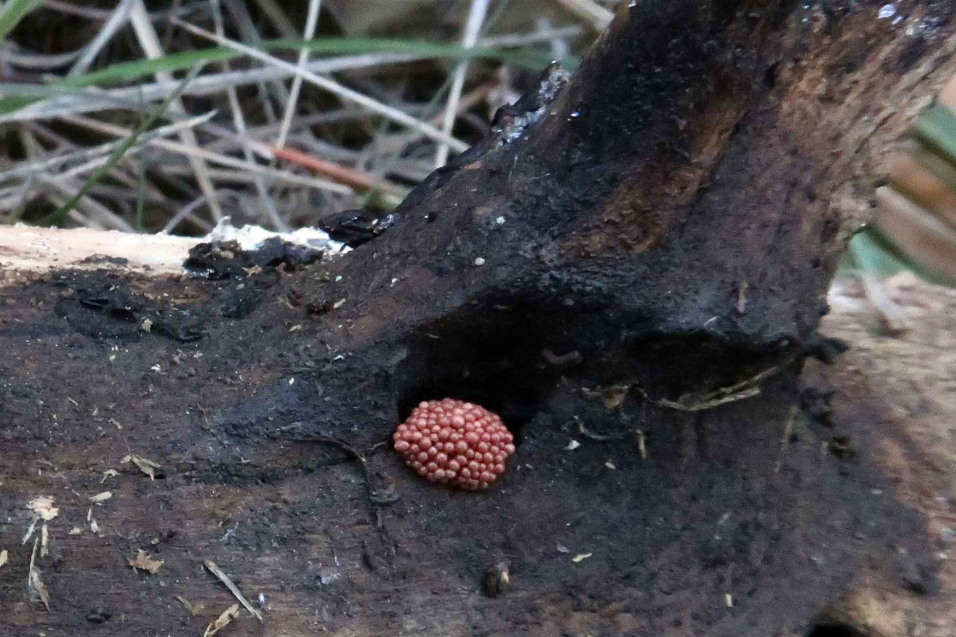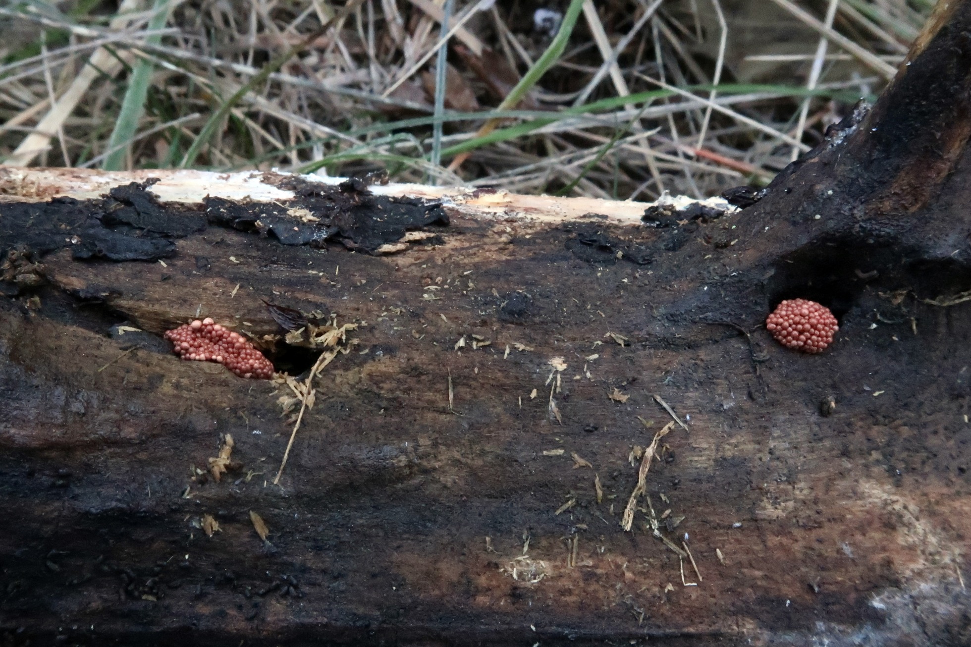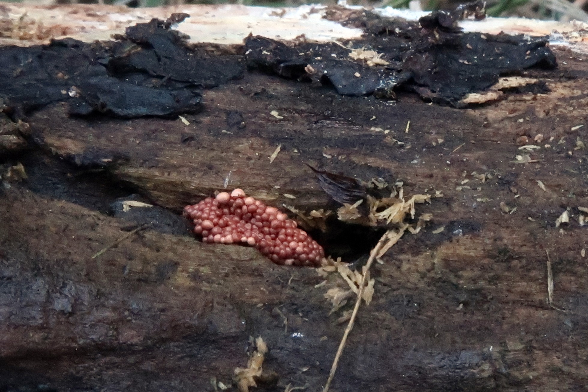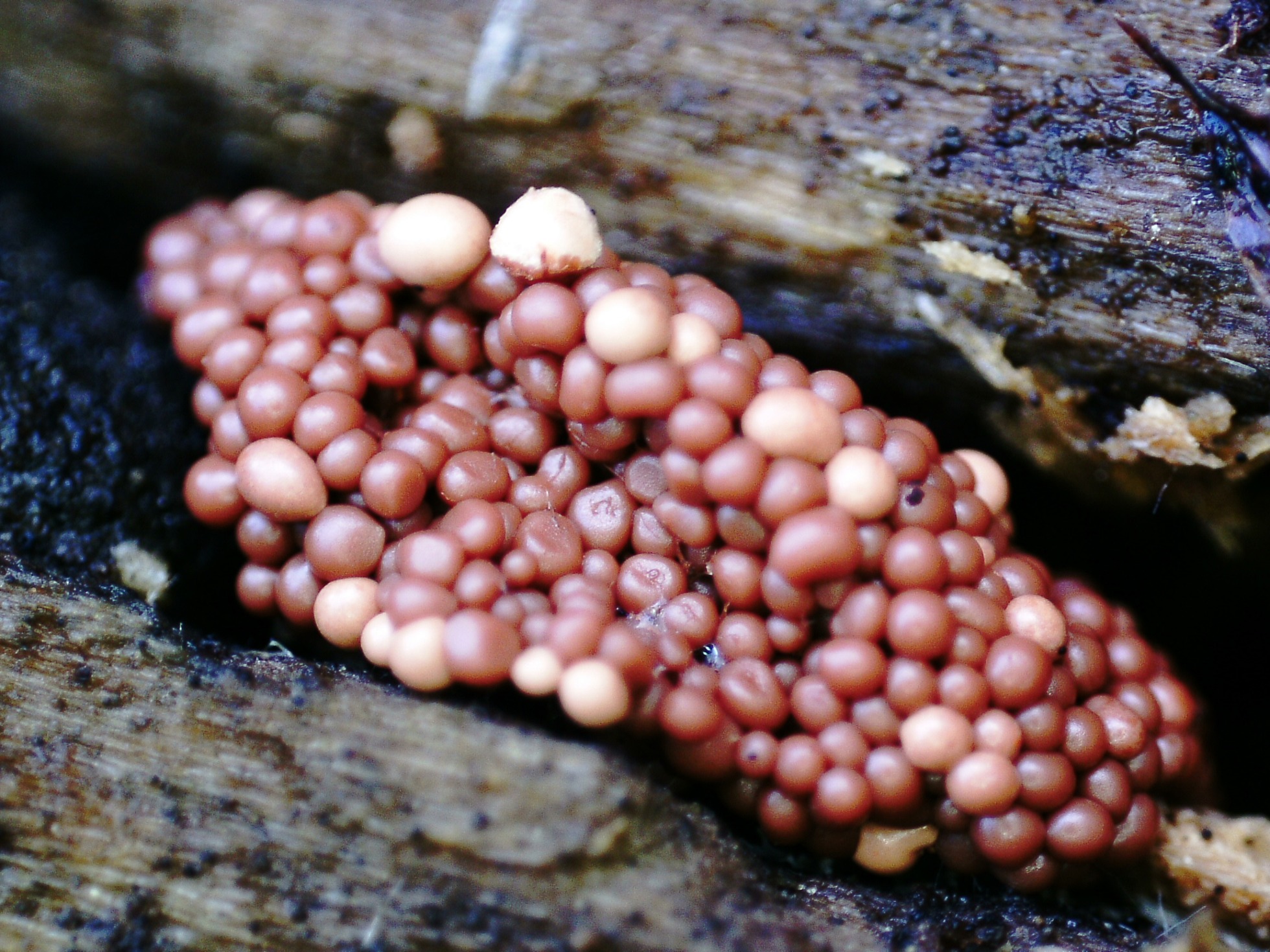 Un Mixomiceto poco común fotografiado el pasado domingo, en cauce fluvial, sobre la superficie de un tronco tumbado de planifolio, creciendo por la parte de debajo que está en contacto con el suelo.
