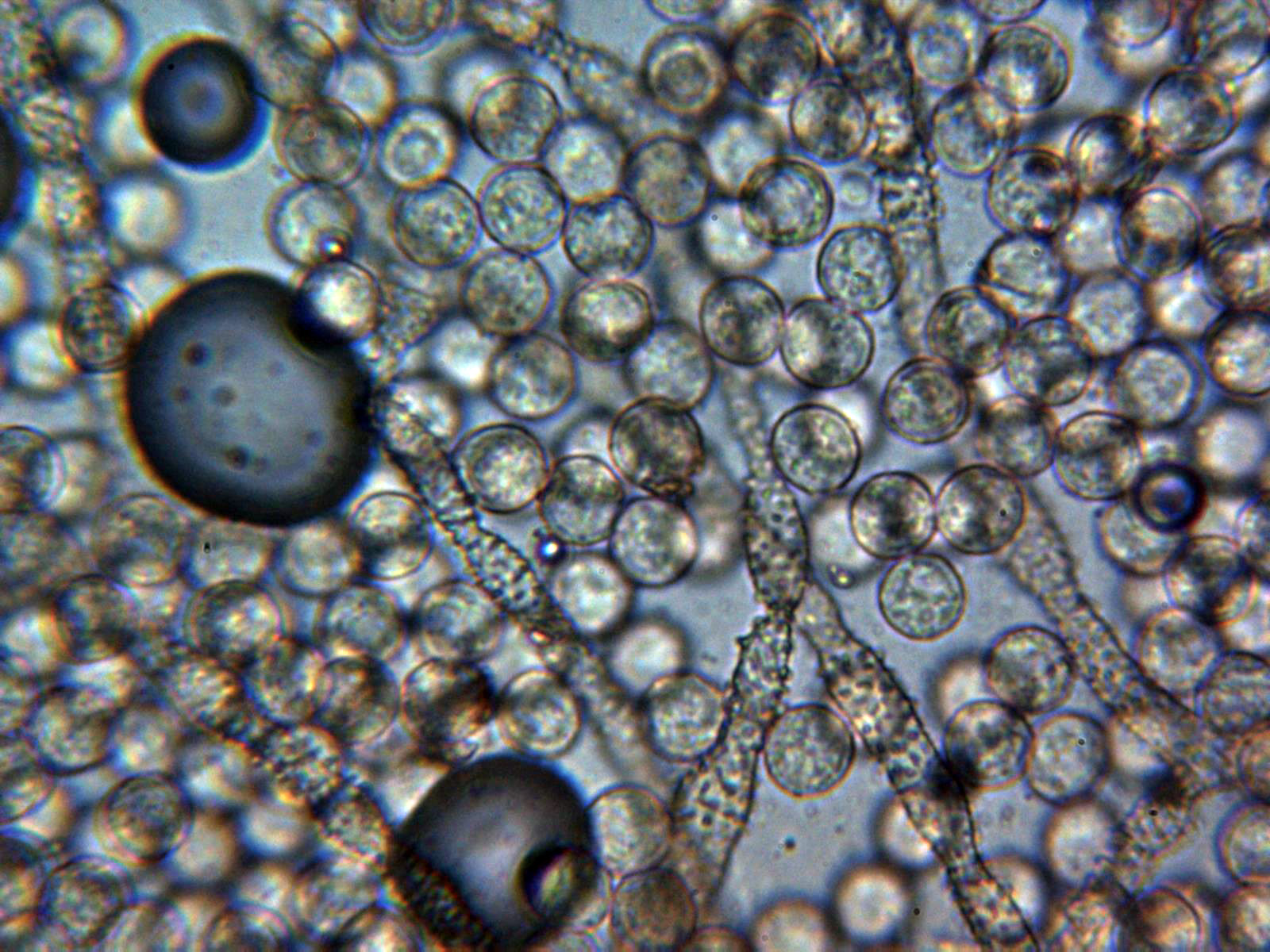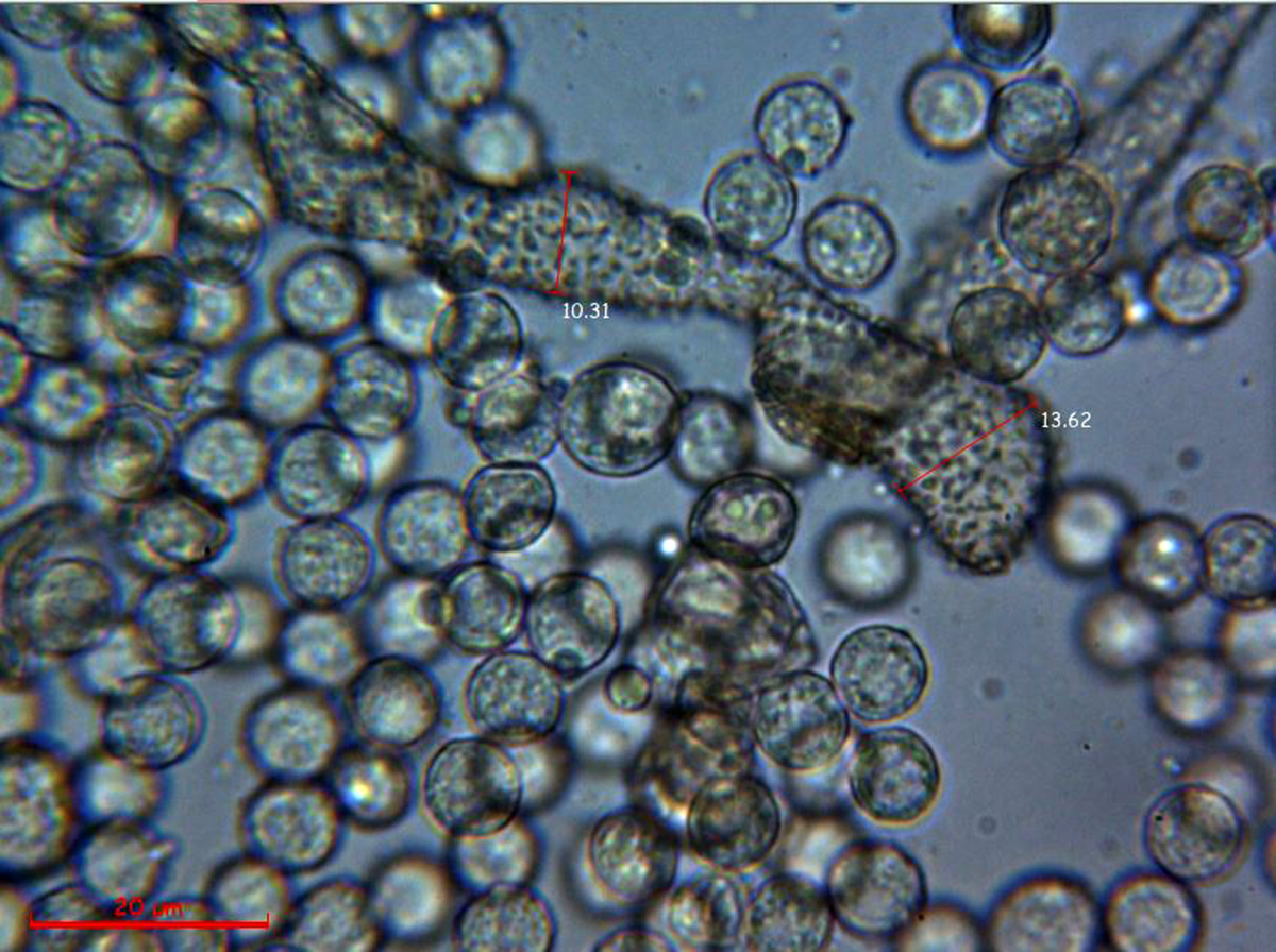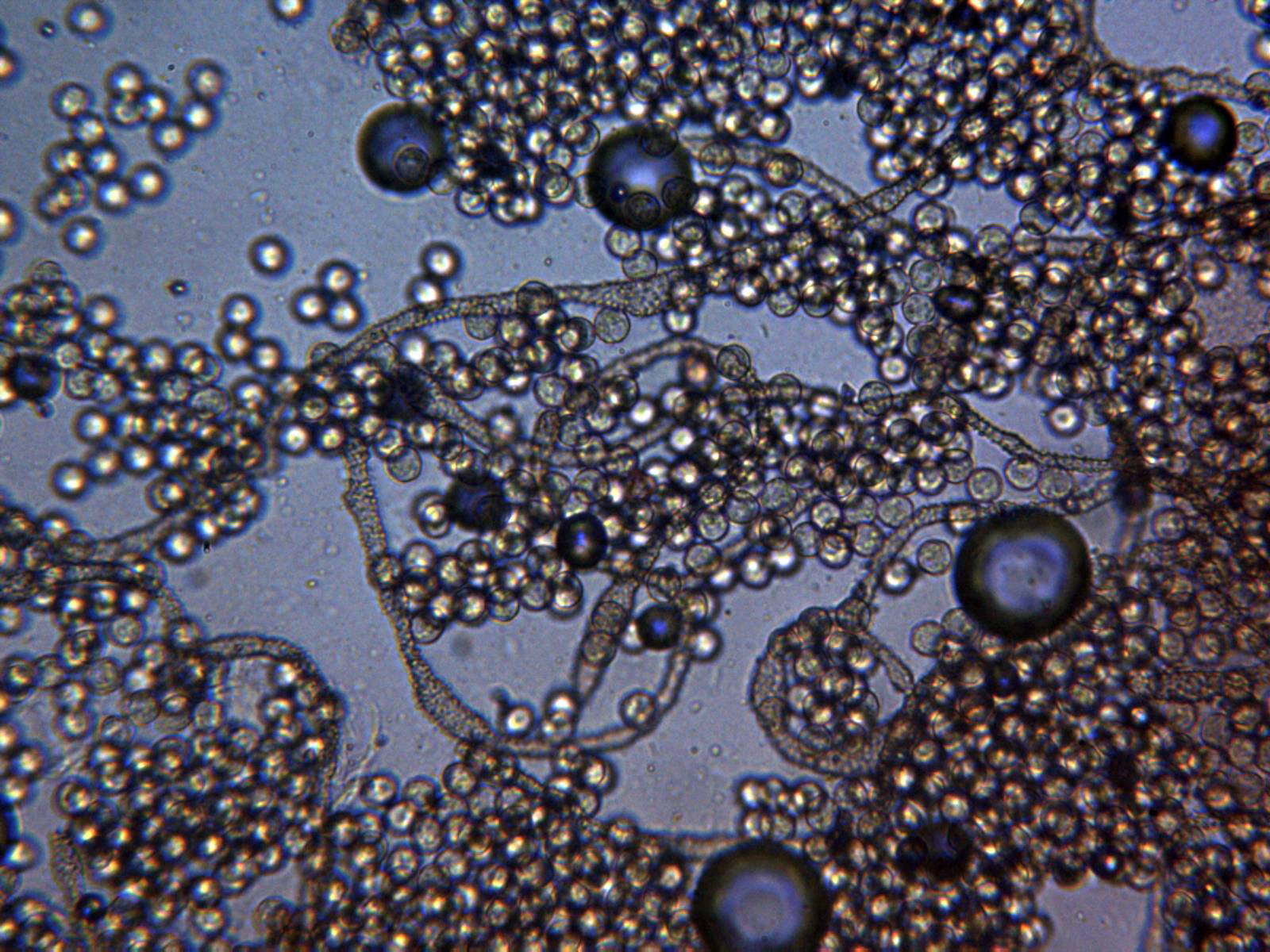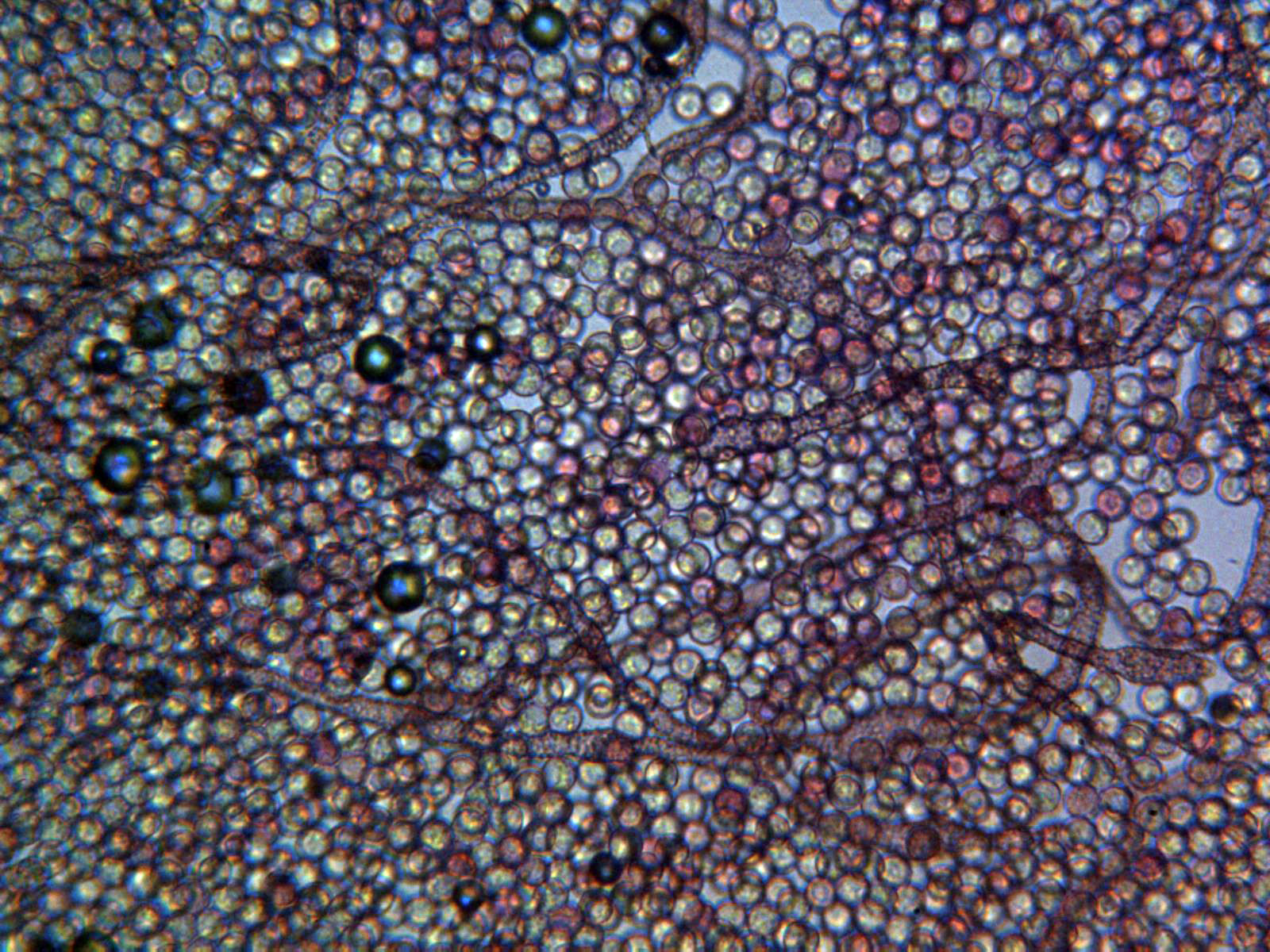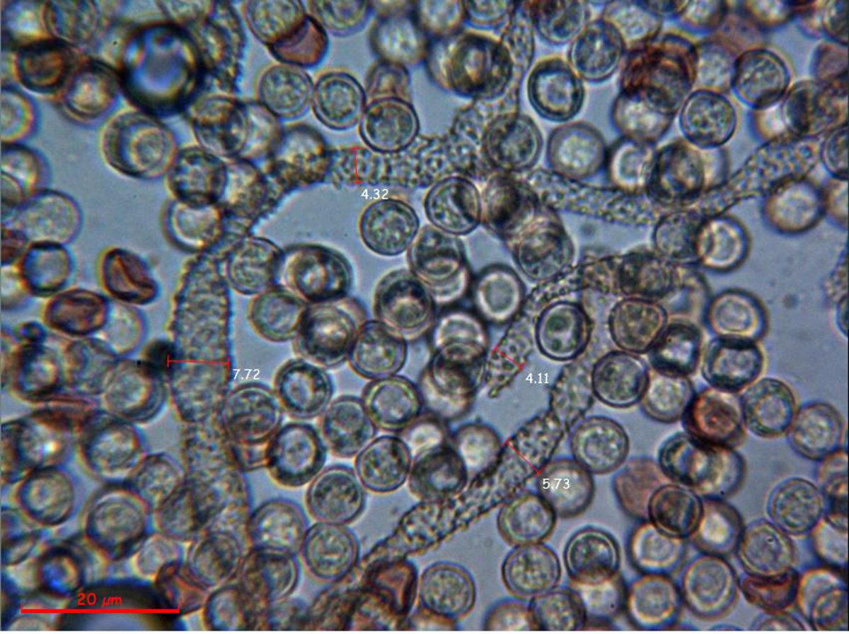 Capilicio no muy abundante, con túbulos de anchura irregular (en este caso entre 4,11 y 4,72 µm.), con inflamientos abundantes que pueden llegar hasta las 13,6 µm., la superficie de los túbulos completamente cubierta de verrugas y espinas, ramificados y en algunos casos formando alguna que otra red.