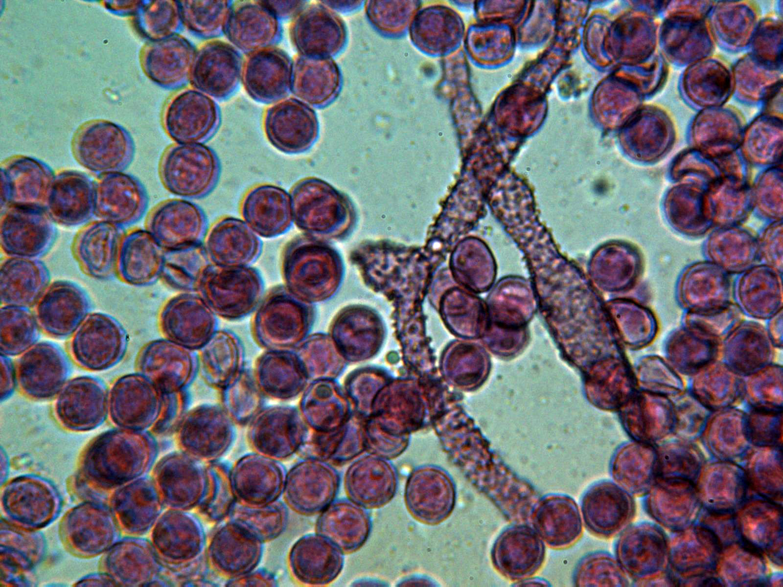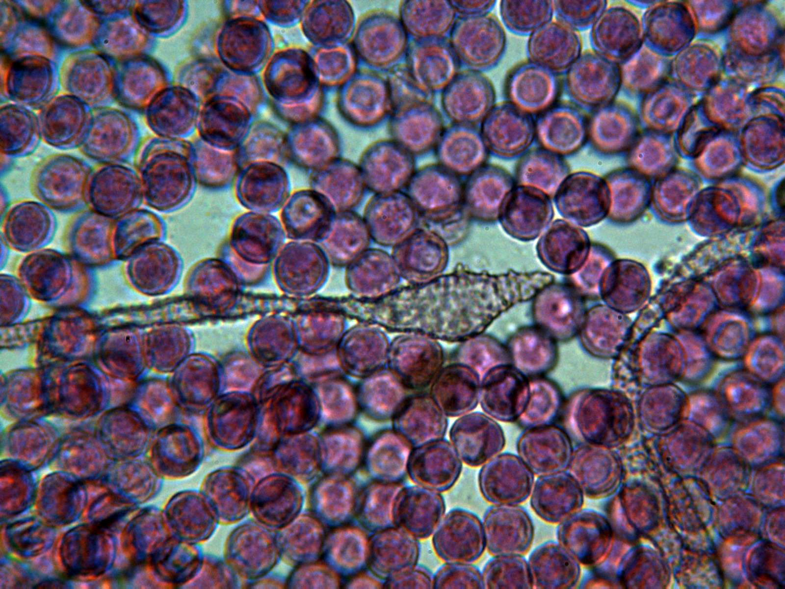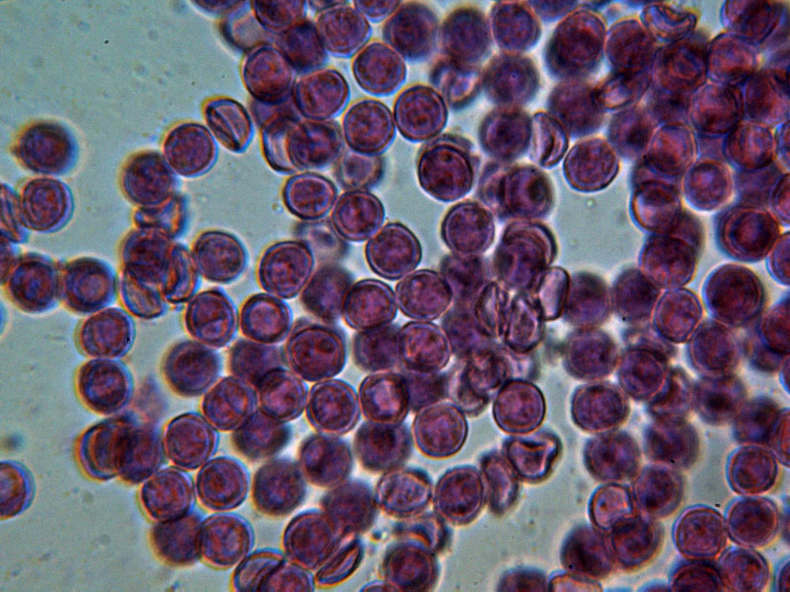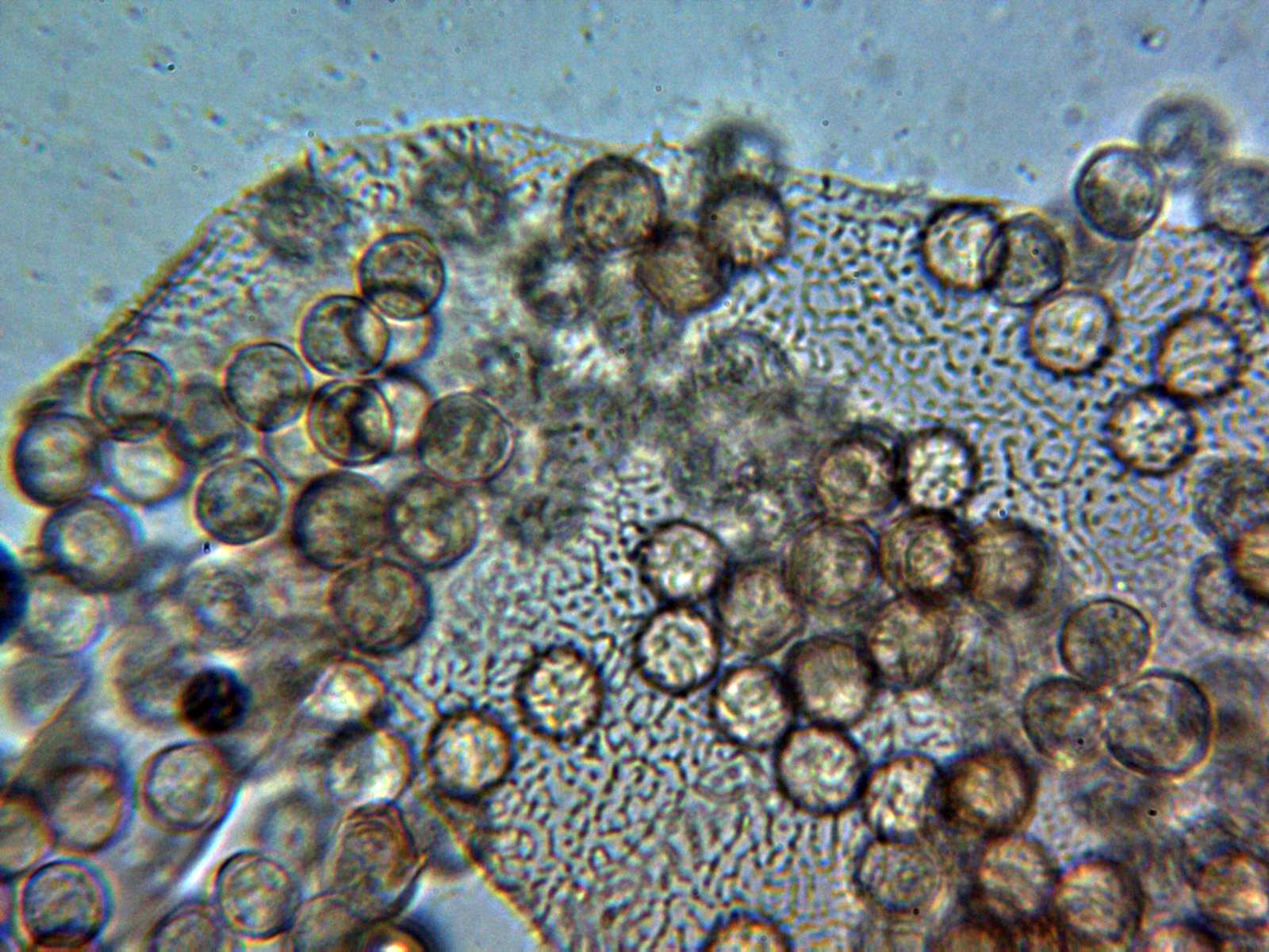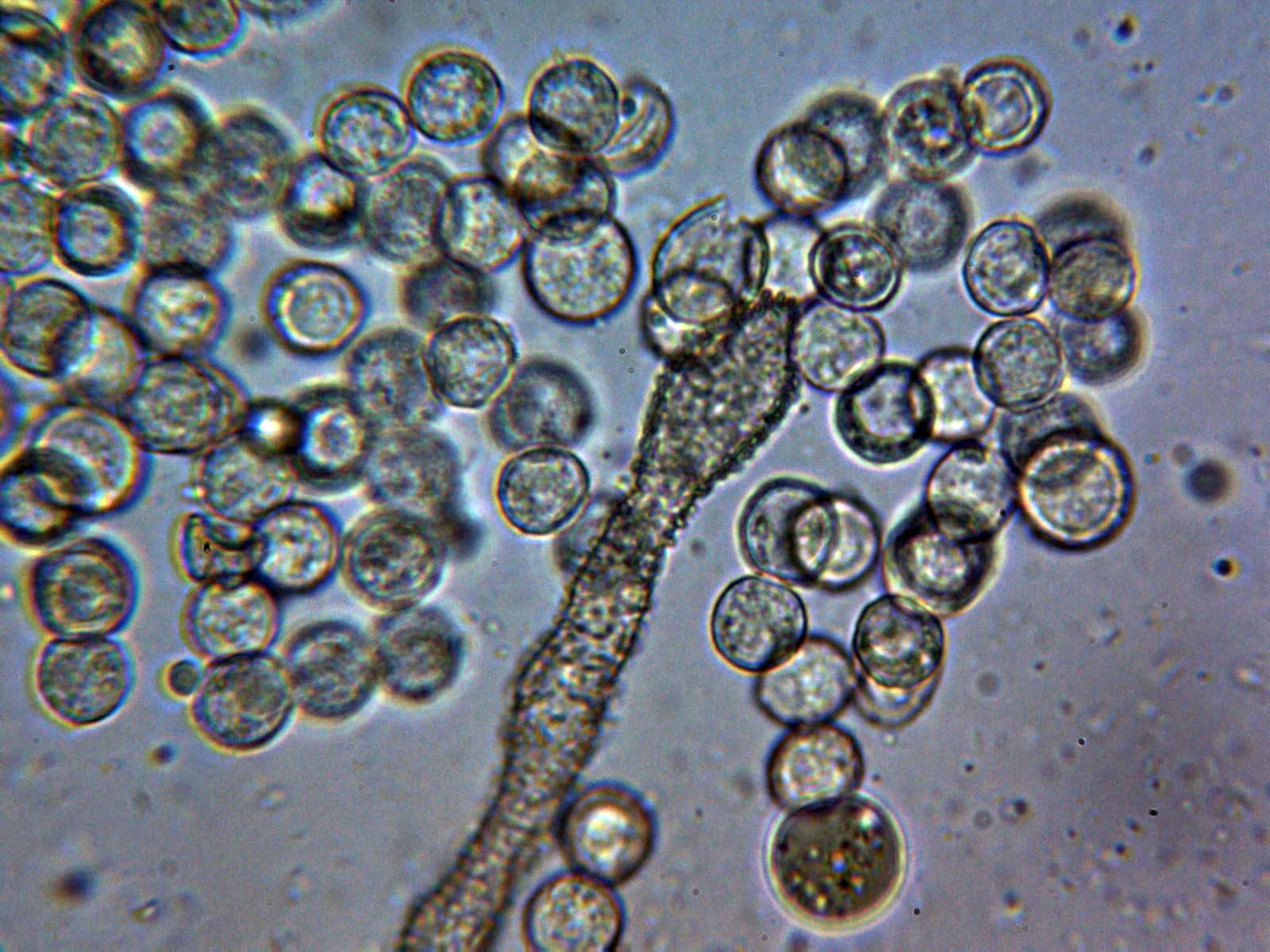 Esporotecas de forma globosa, con unas medidas de entre 0,39 y 0,68. mm., de color rosado en estado joven, para volverse amarillentas al alcanzar su desarrollo, esporada en masa de color claro, amarillenta.