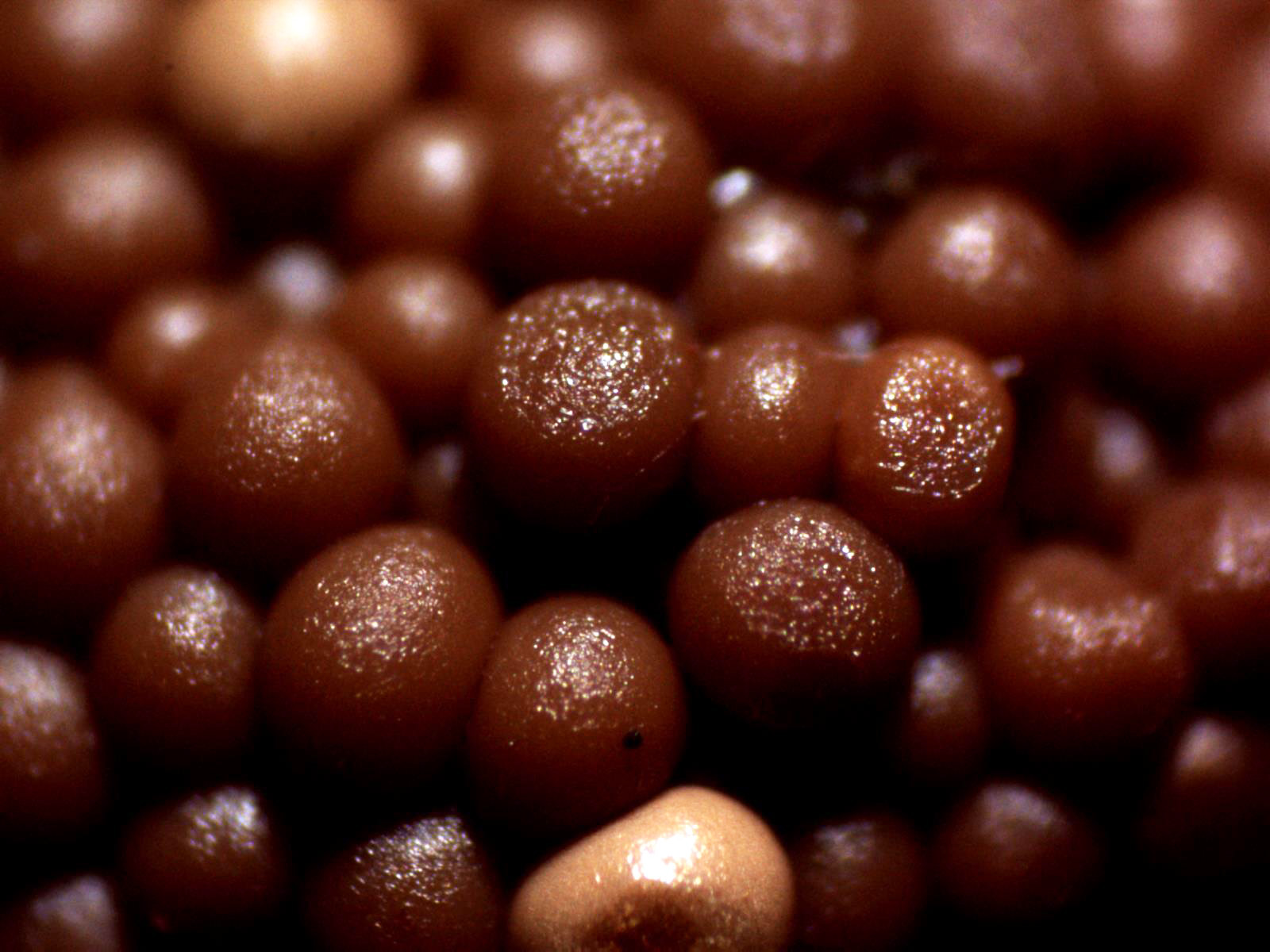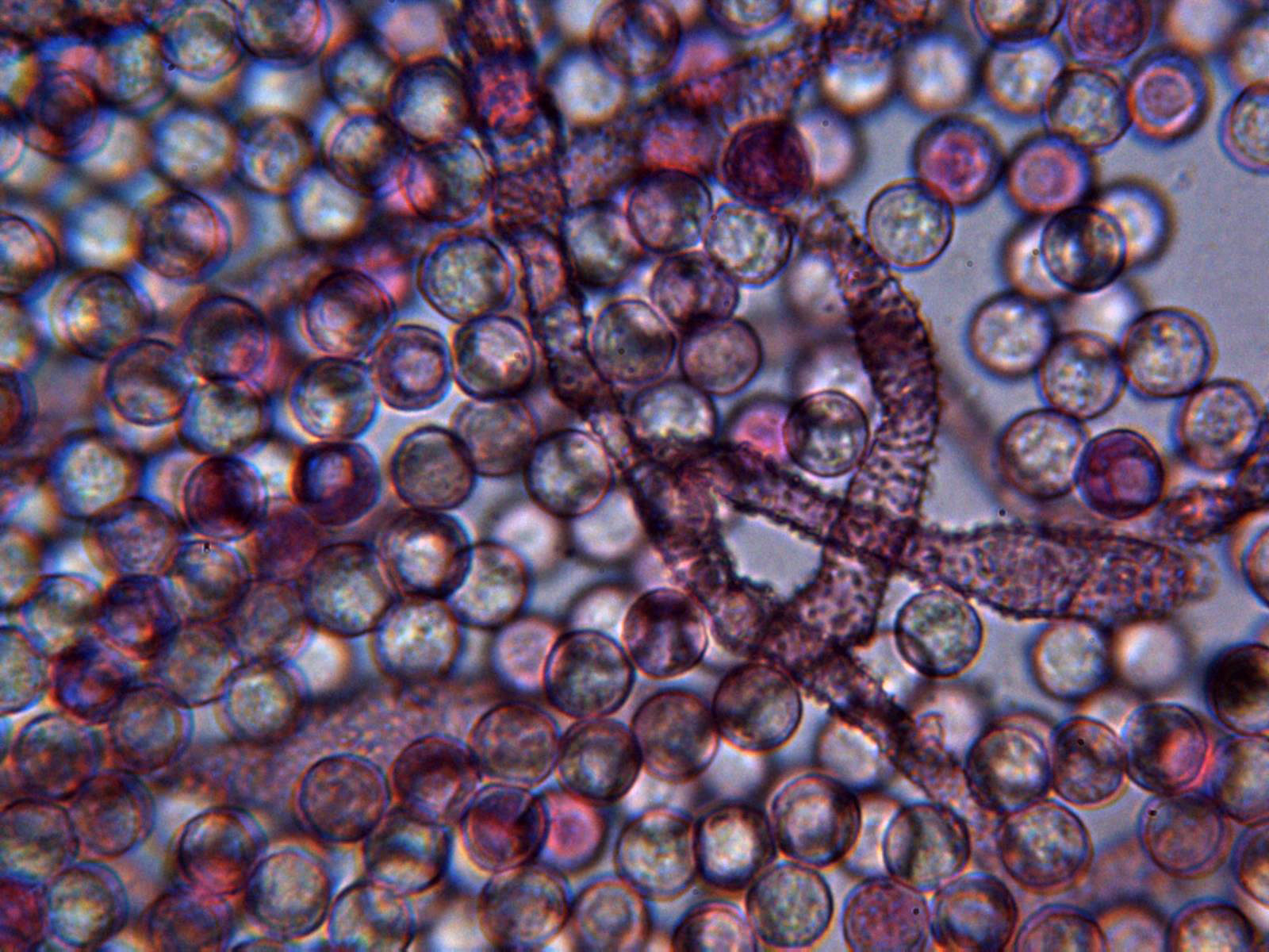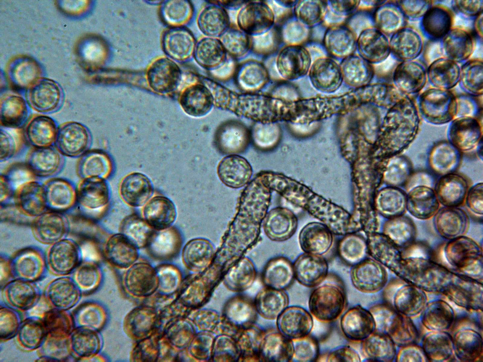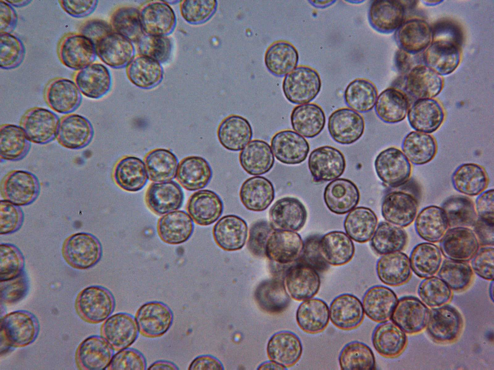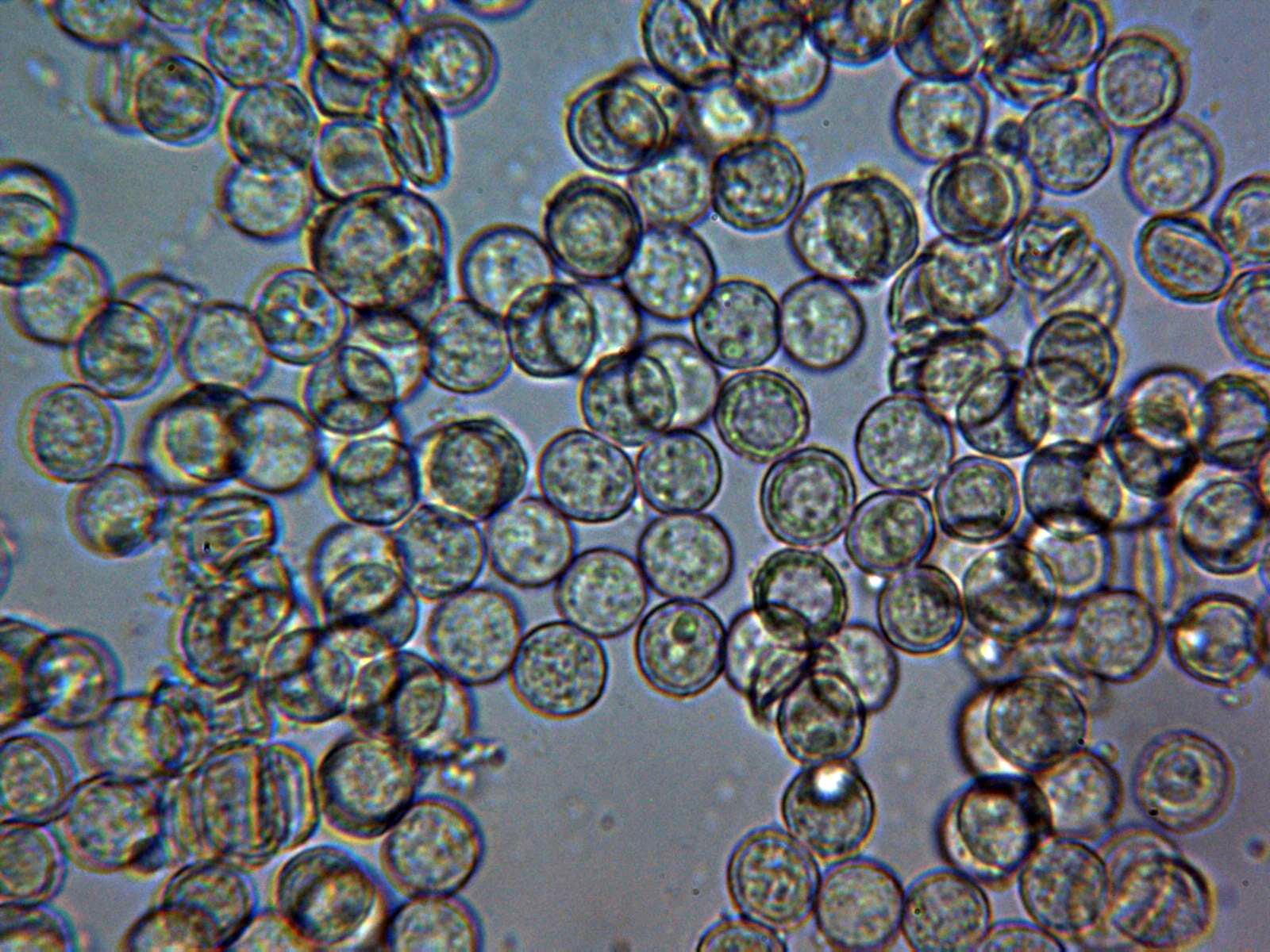 Esporotecas de forma globosa, con unas medidas de entre 0,39 y 0,68. mm., de color rosado en estado joven, para volverse amarillentas al alcanzar su desarrollo, esporada en masa de color claro, amarillenta.