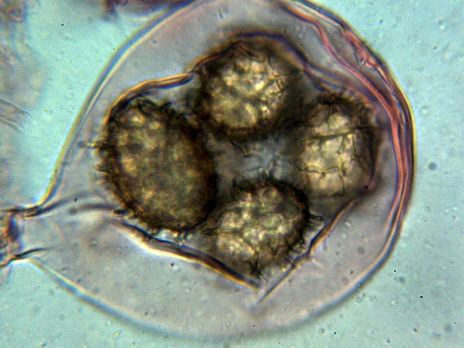 Una imágen a 100 aumentos donde se aprecia el colapso de las esporas: