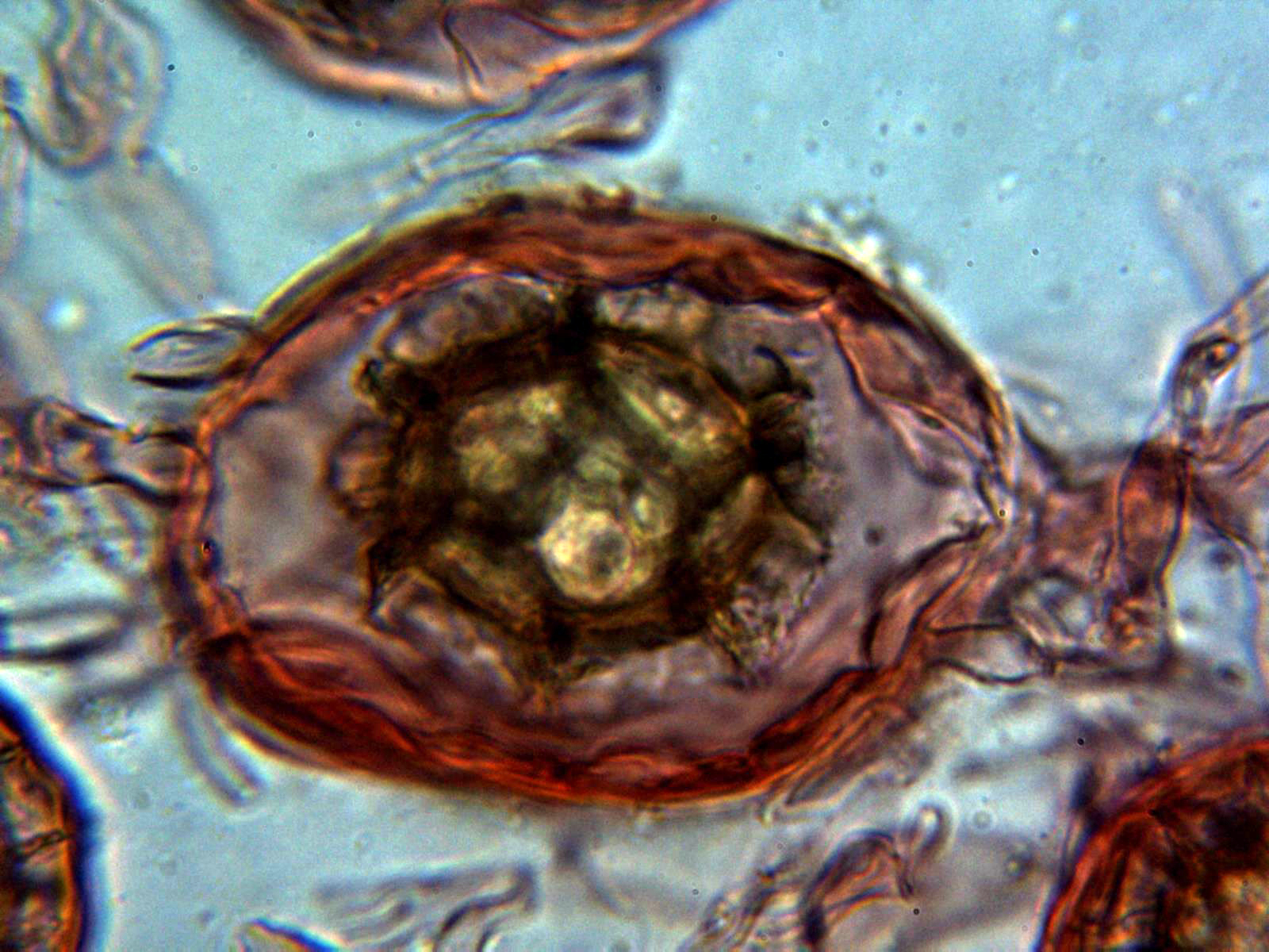 Y para terminar uno de un tamaño muy reducido, sobre una hoja de Malva neglecta , la Hydnocystis bombycina, hay que ver lo difícil que me lo puso para poder localizar un asca. El enlace de nuestra casa: