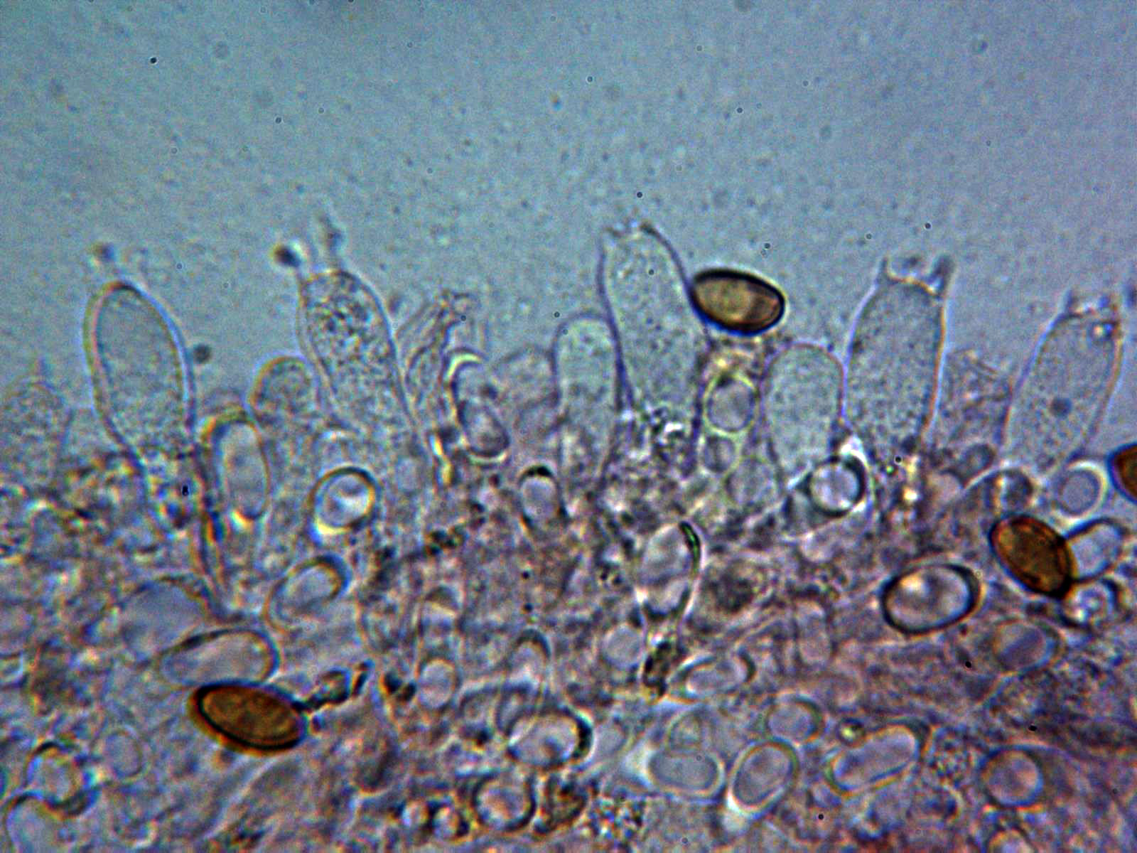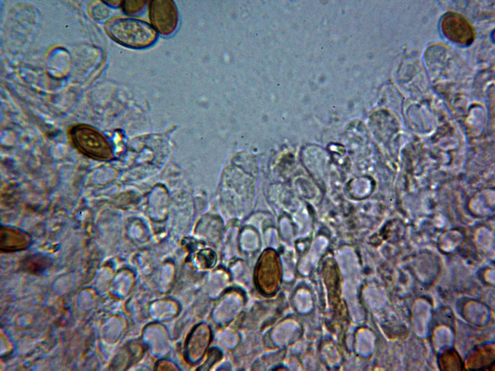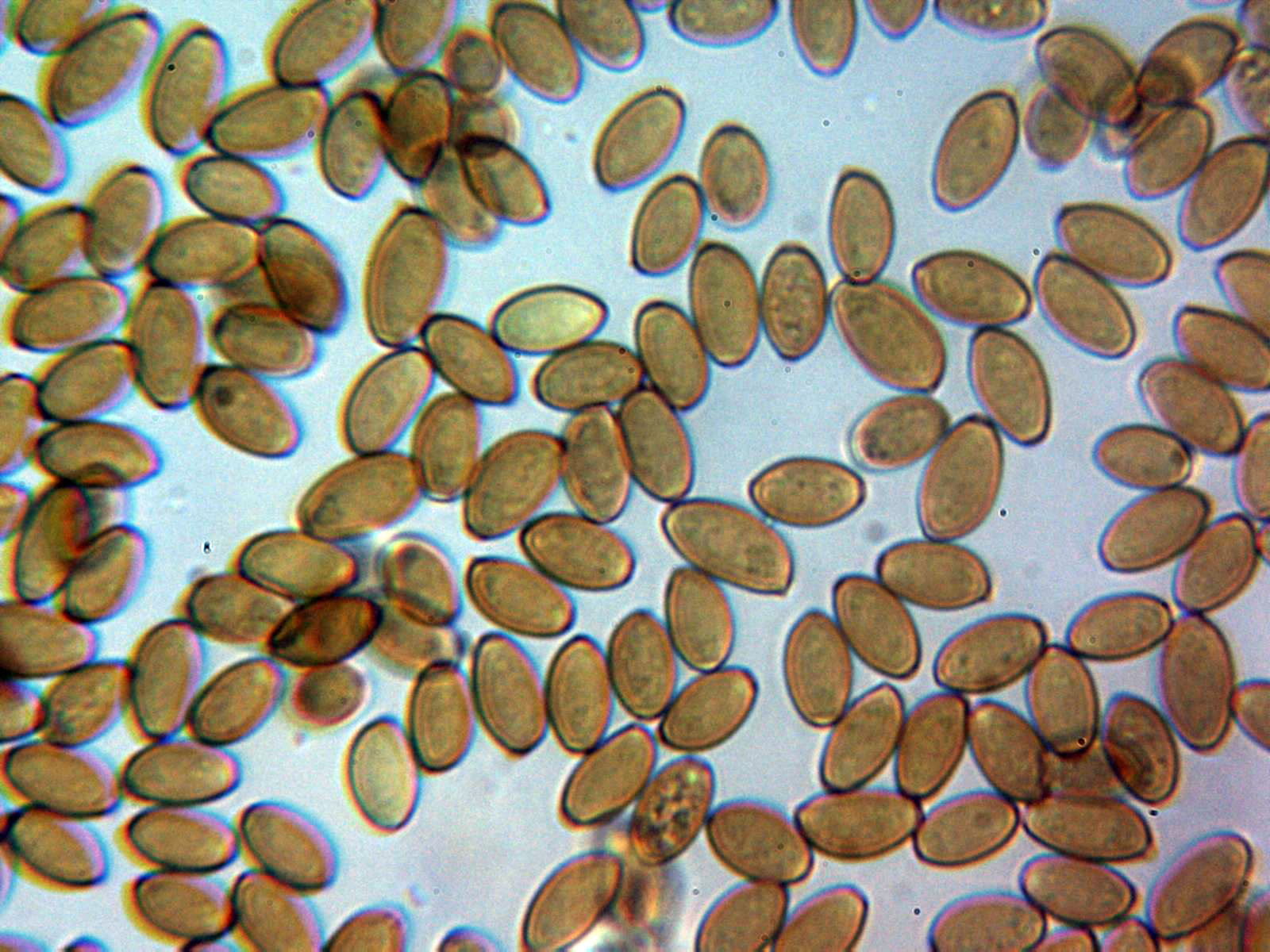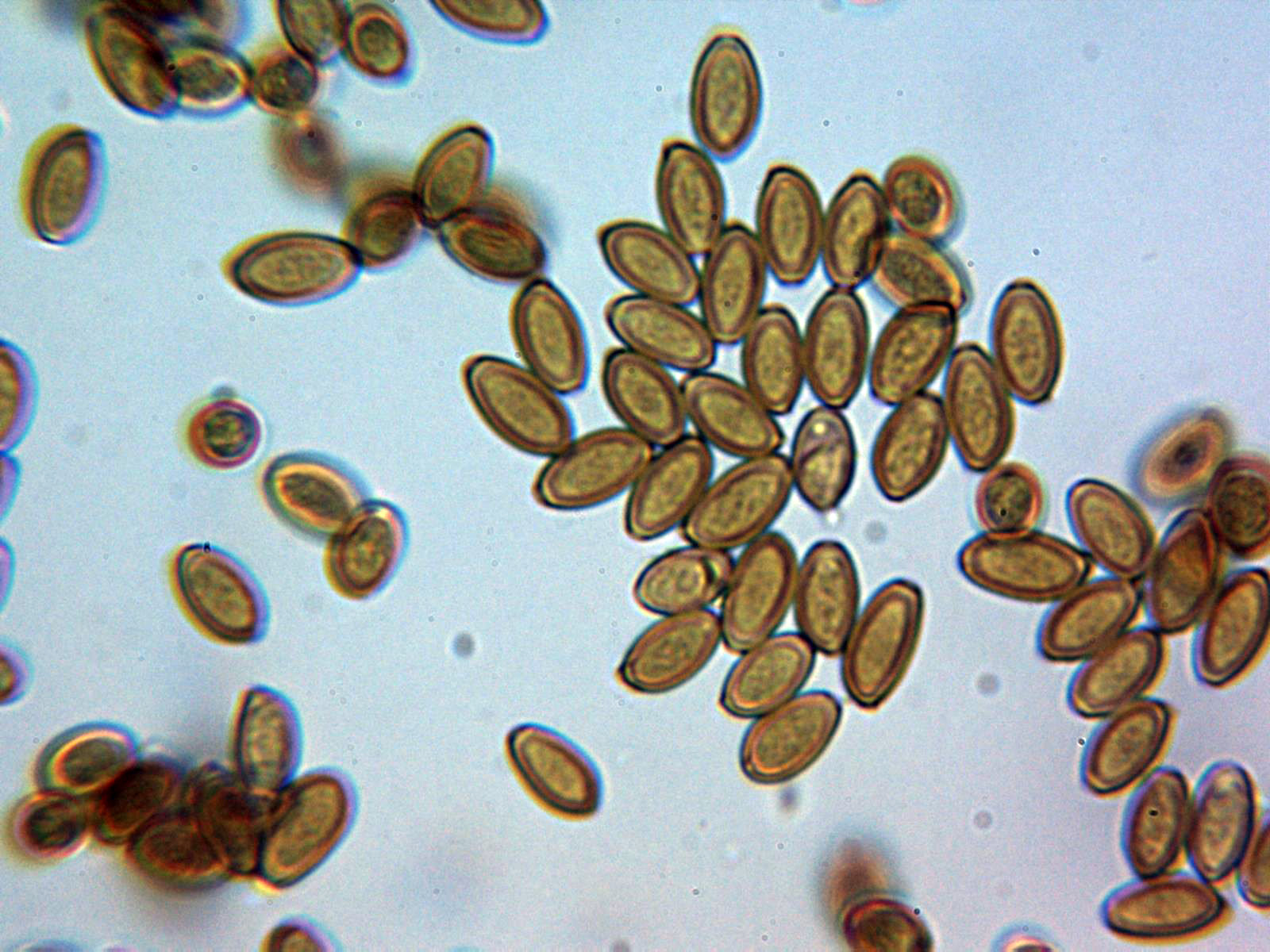 Esporas elipsoidales, algo almendradas, de color pardo en agua, con discreta apícula y un poro germinal bien definido, con unas medidas en agua de: