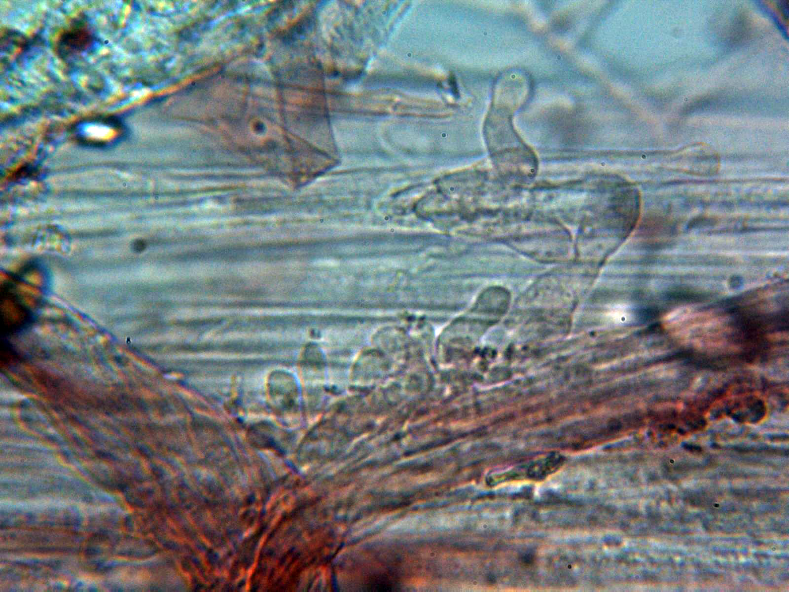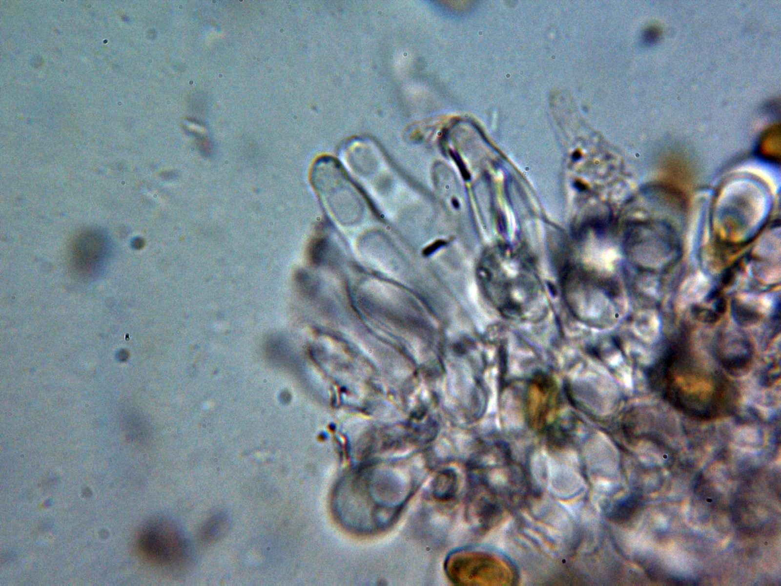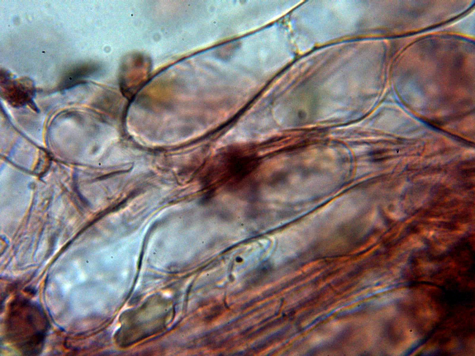 Pileipellis compuesta por hifas vesiculosas con unas medidas de 28.8 - 47,1 × 13.3 - 23.7 µm. y una media de 38.3 × 19 µm.