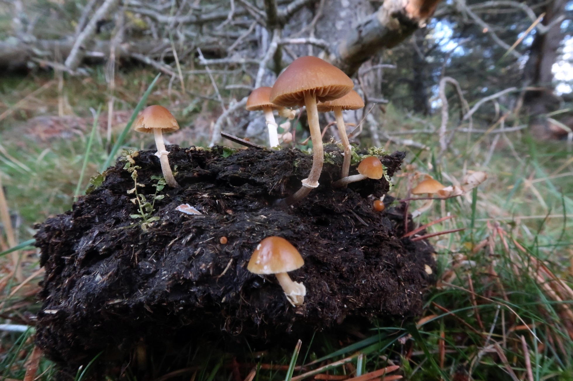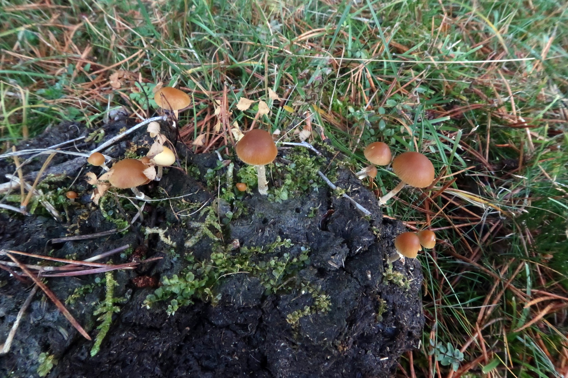 Un bonito grupo de hongos fotografiados el pasado 11 de Octubre, brotando sobre un trozo de humus del suelo, aunque no descarto que estuviera mezclado con excrementos de vacuno ya muy degradados.