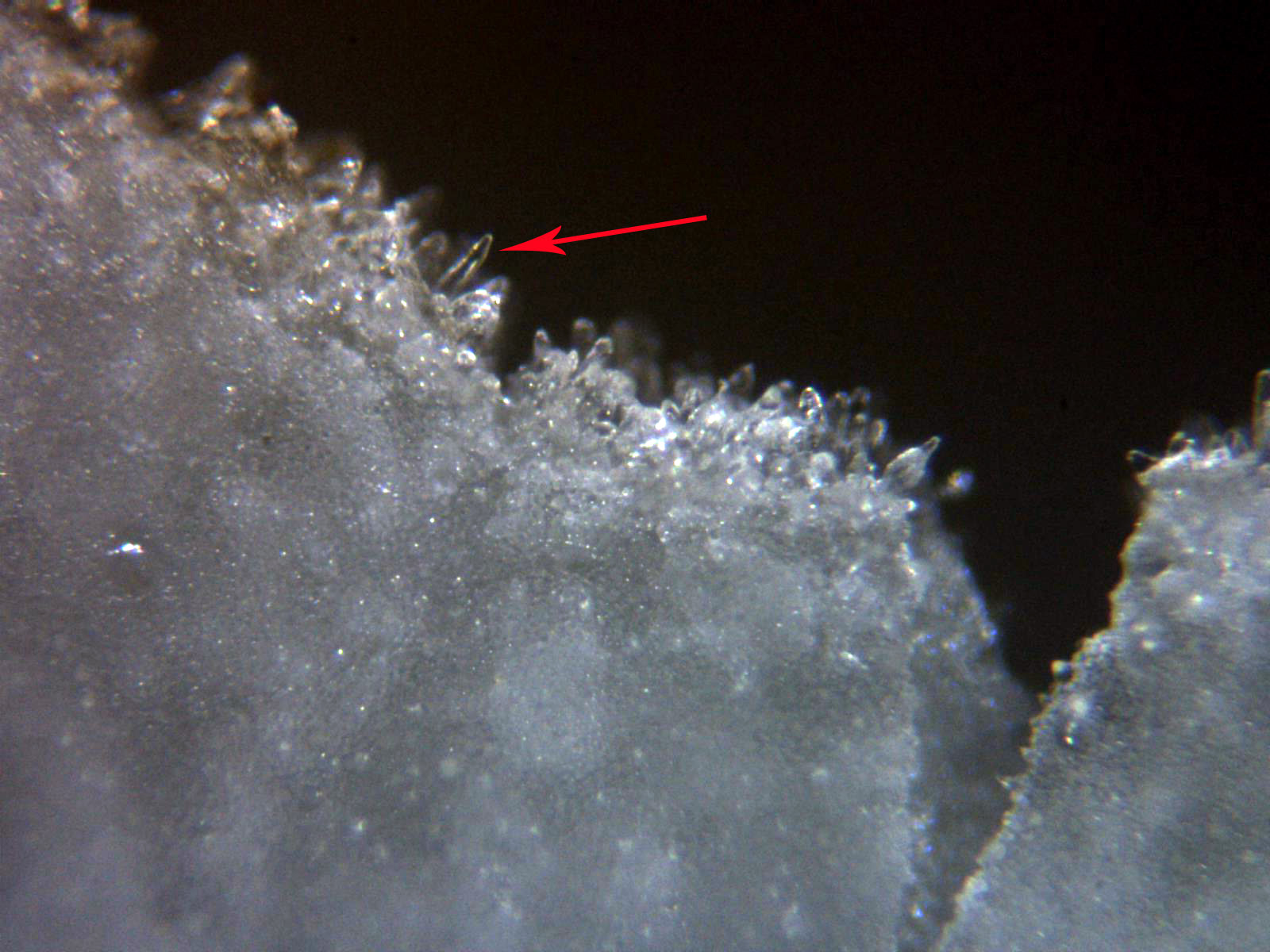 Ya en casa con el microscopio de sobremesa y utilizando luz indirecta a tan solo 40 aumentos ya se pueden observar sus abundantes y grandes queilocistidios en la arista laminar: