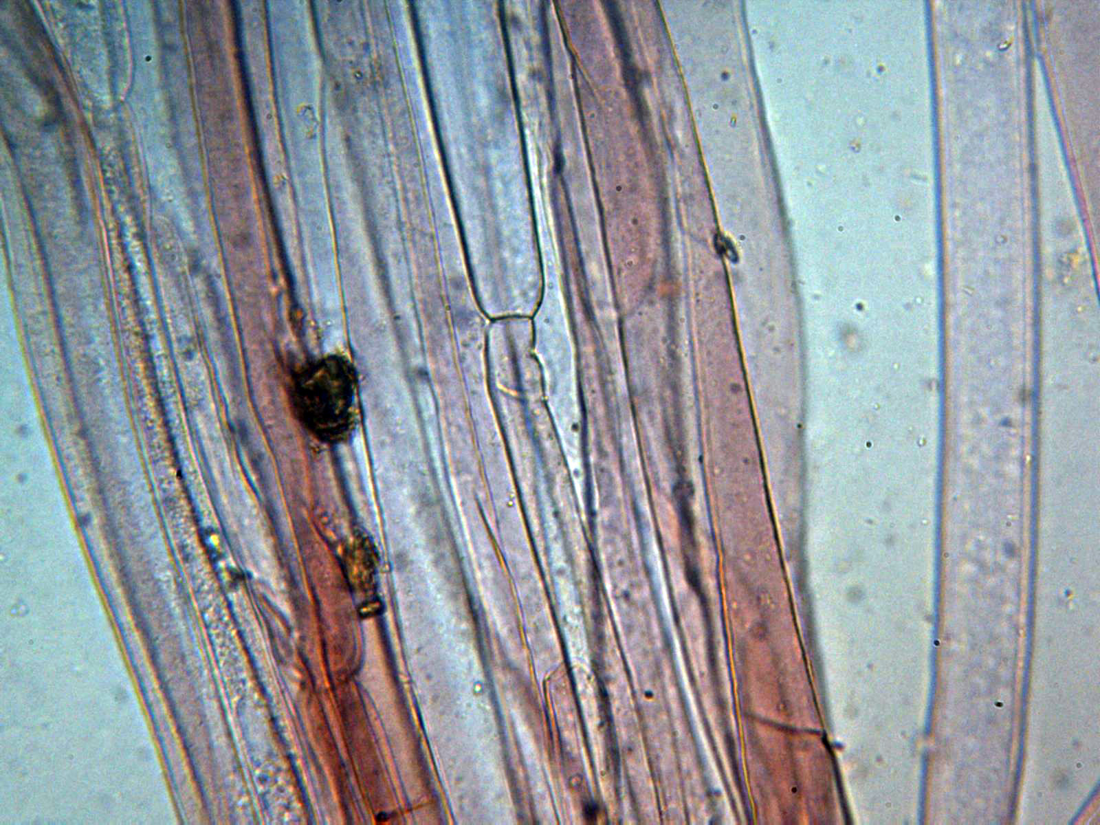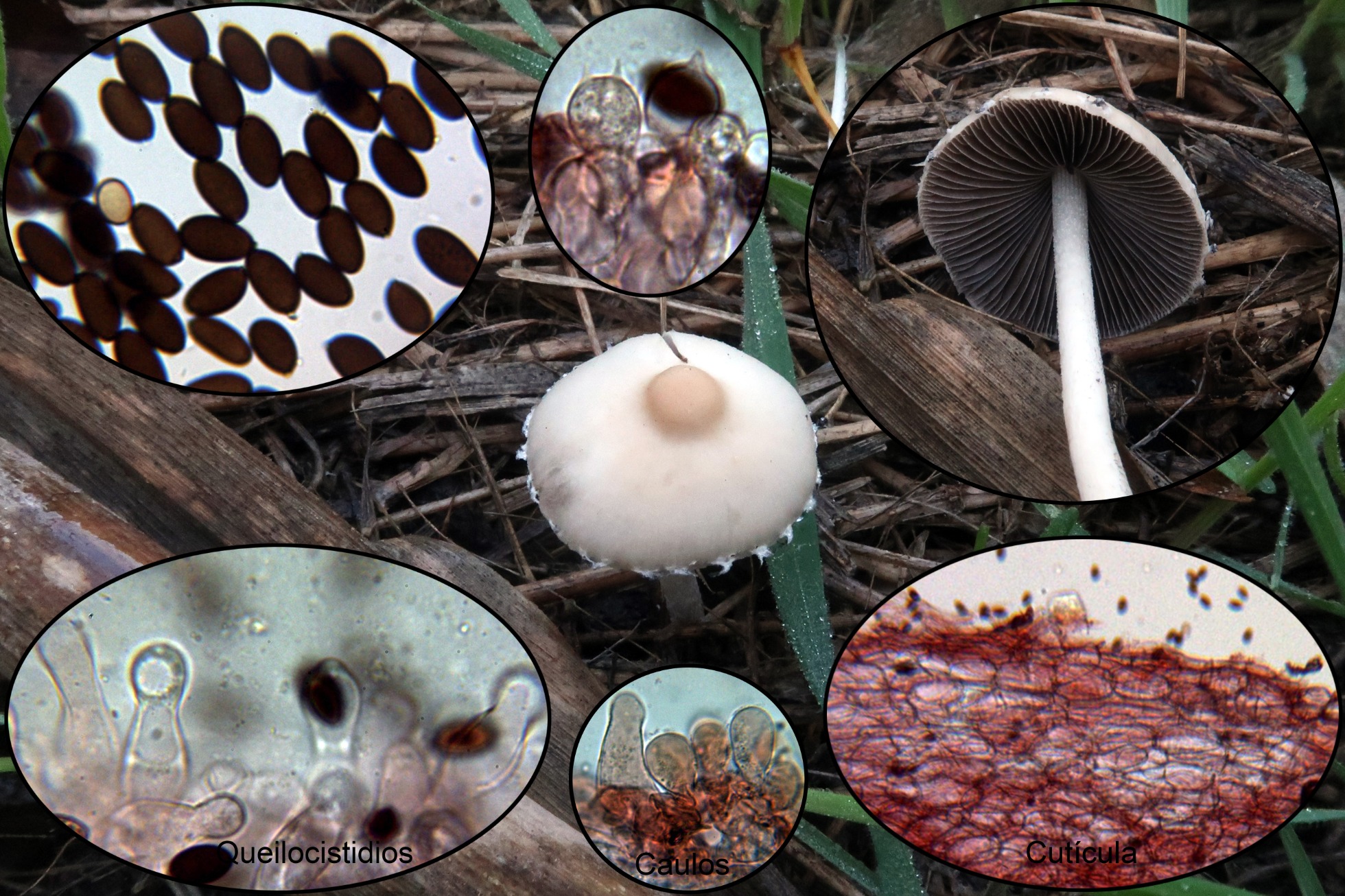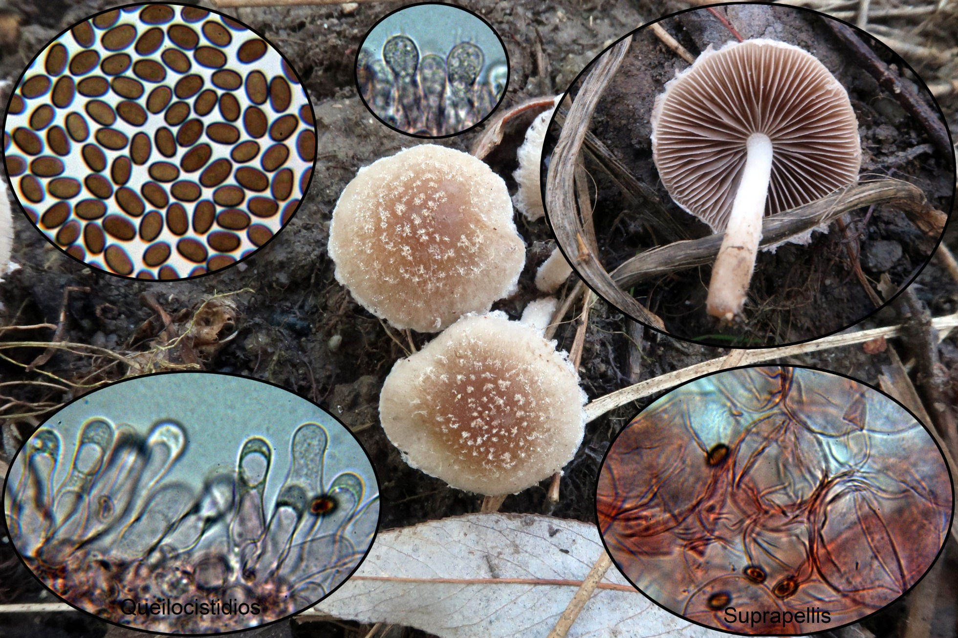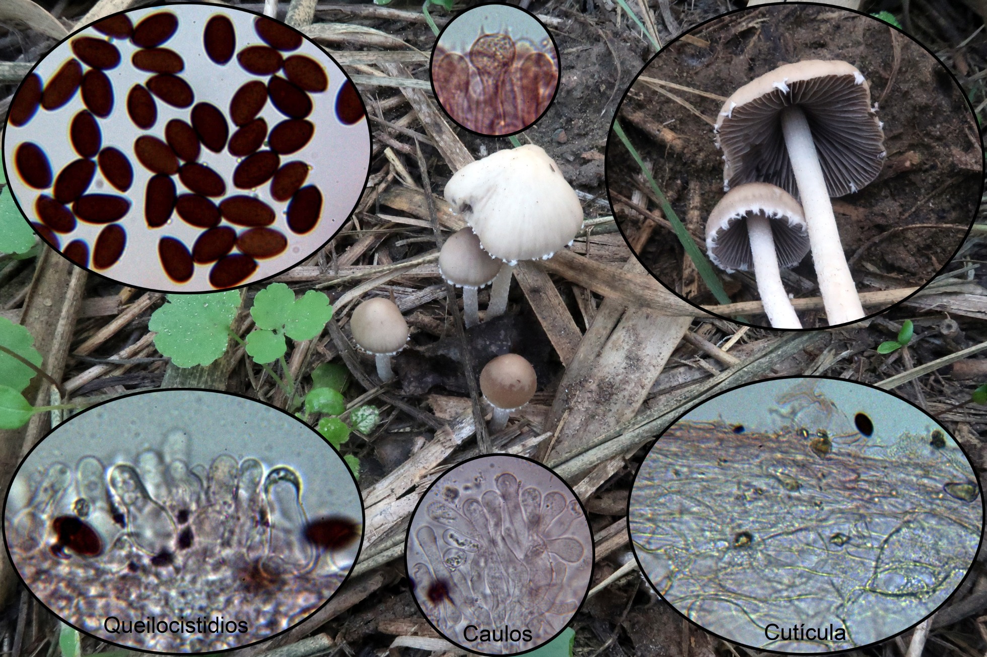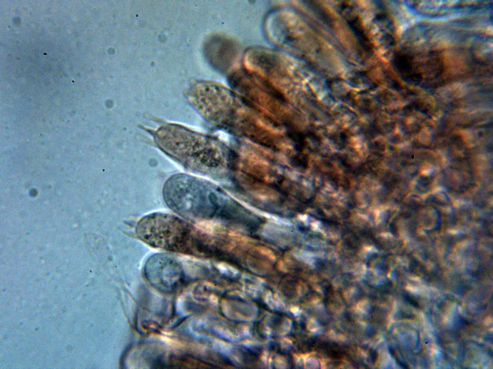Y la que habría apostado mi mano derecha por candolleana, me he encontrado con la sorpresa de un "cromo nuevo", con aspecto de candolleana pero con esporas de mayor longitud y dos tipos de hifas en la pileipellis, con una cutícula celulósica alternando con hifas filamentosas, la Psathyrella bivelata