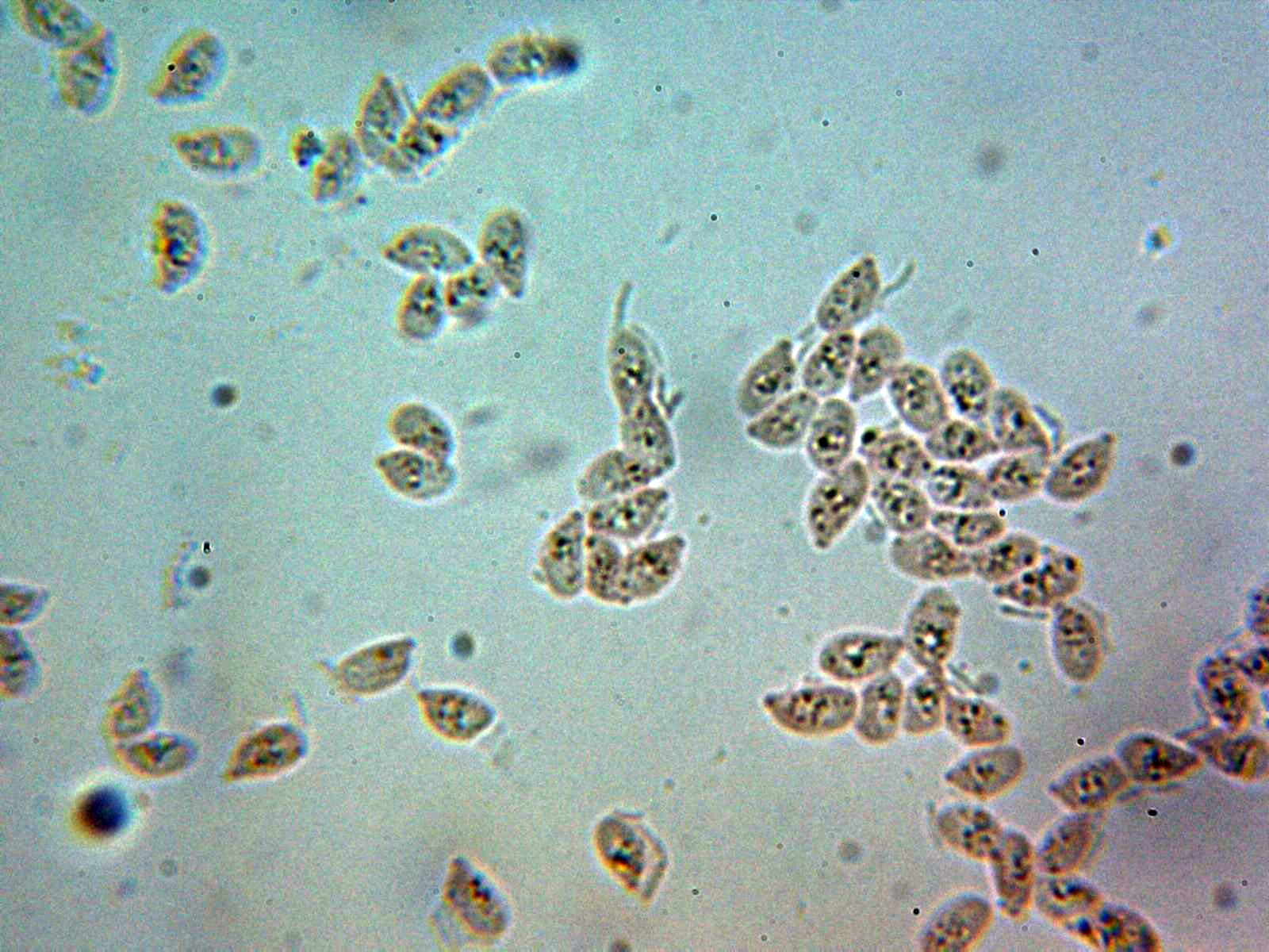 Esporas en agua destilada, con algunas de ellas ya germinando: