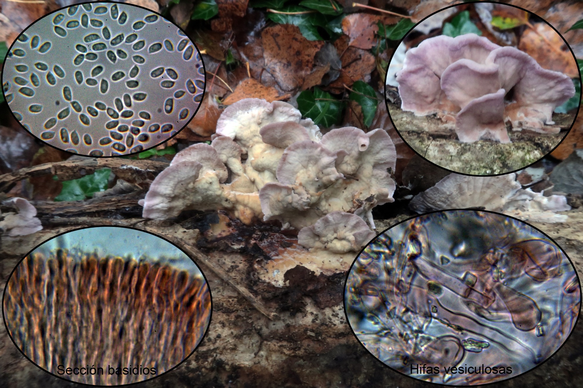 En todo su esplendor, con sus típicos tonos púrpura, y sus características hifas vesiculosas en el subhimenio, el Chondrostereum purpureum