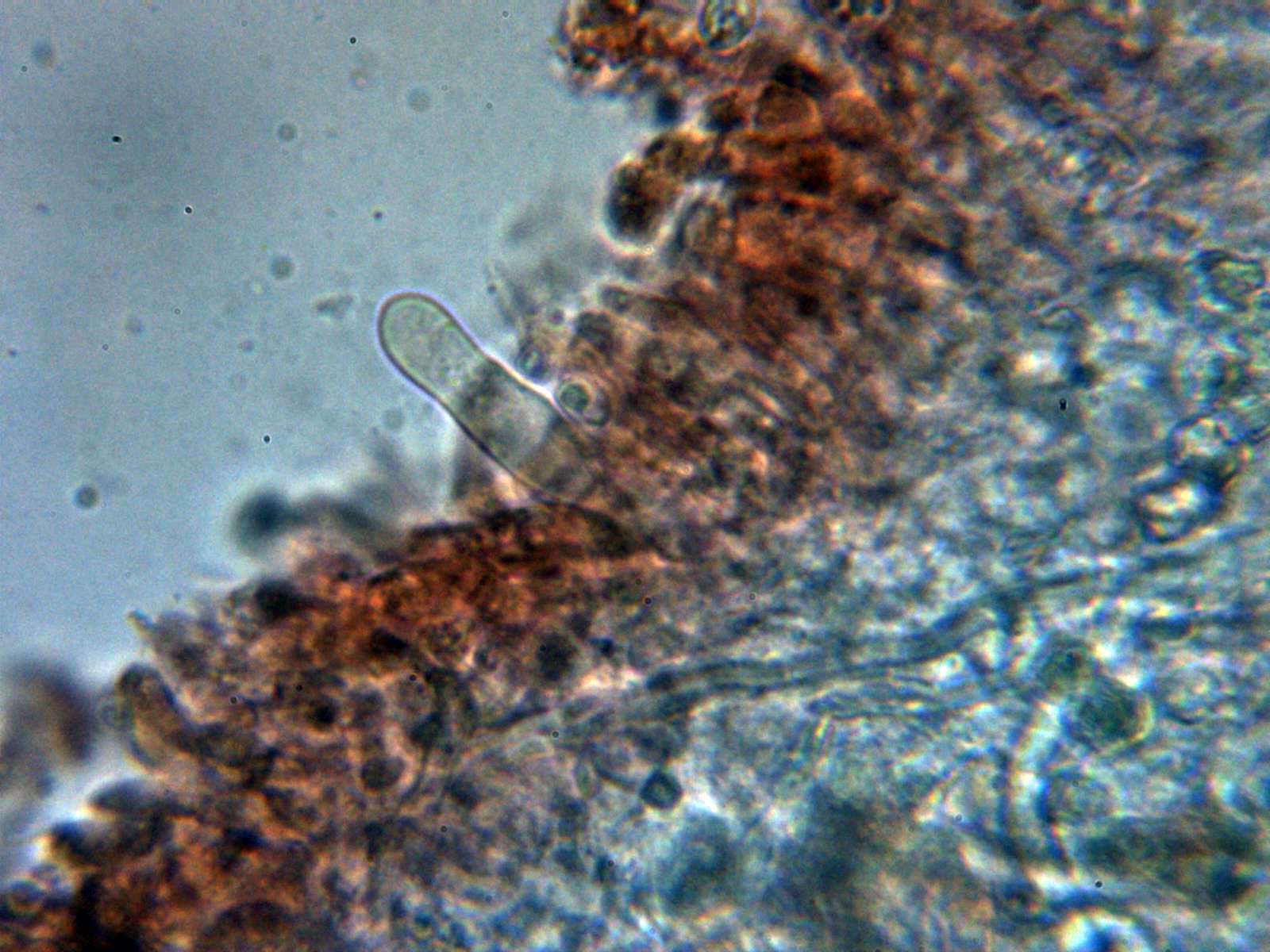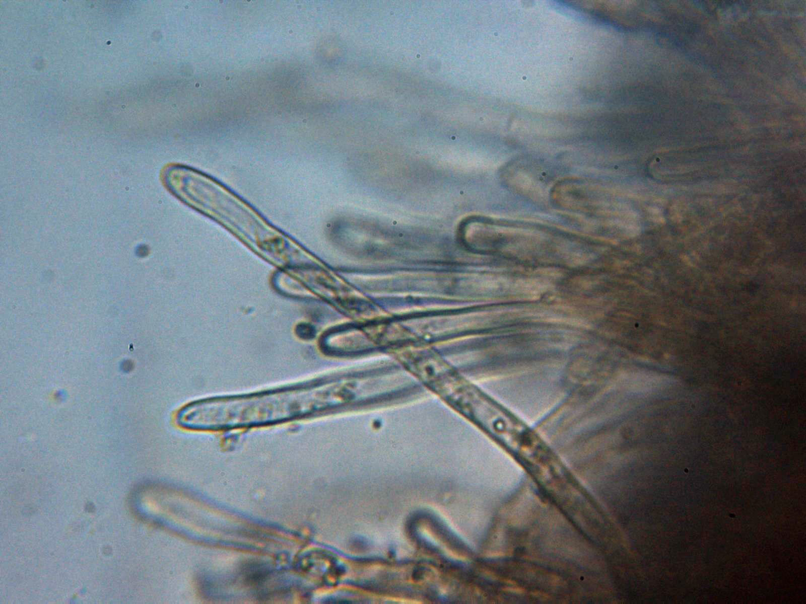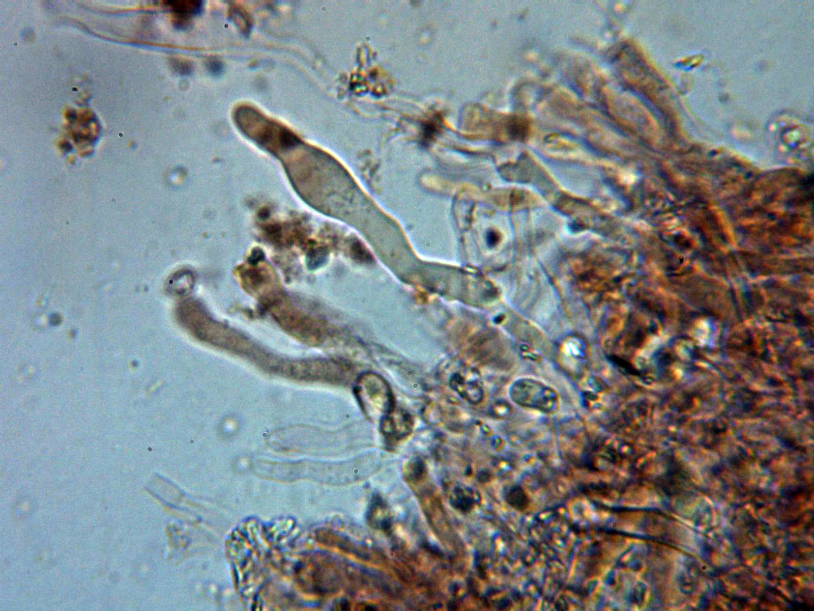Presencia de gloeocistidios, por encima del gloeocistidio de la primera imágen se puede observar una gruesa fíbula (muy difíciles de observar en el resto del estudio).
