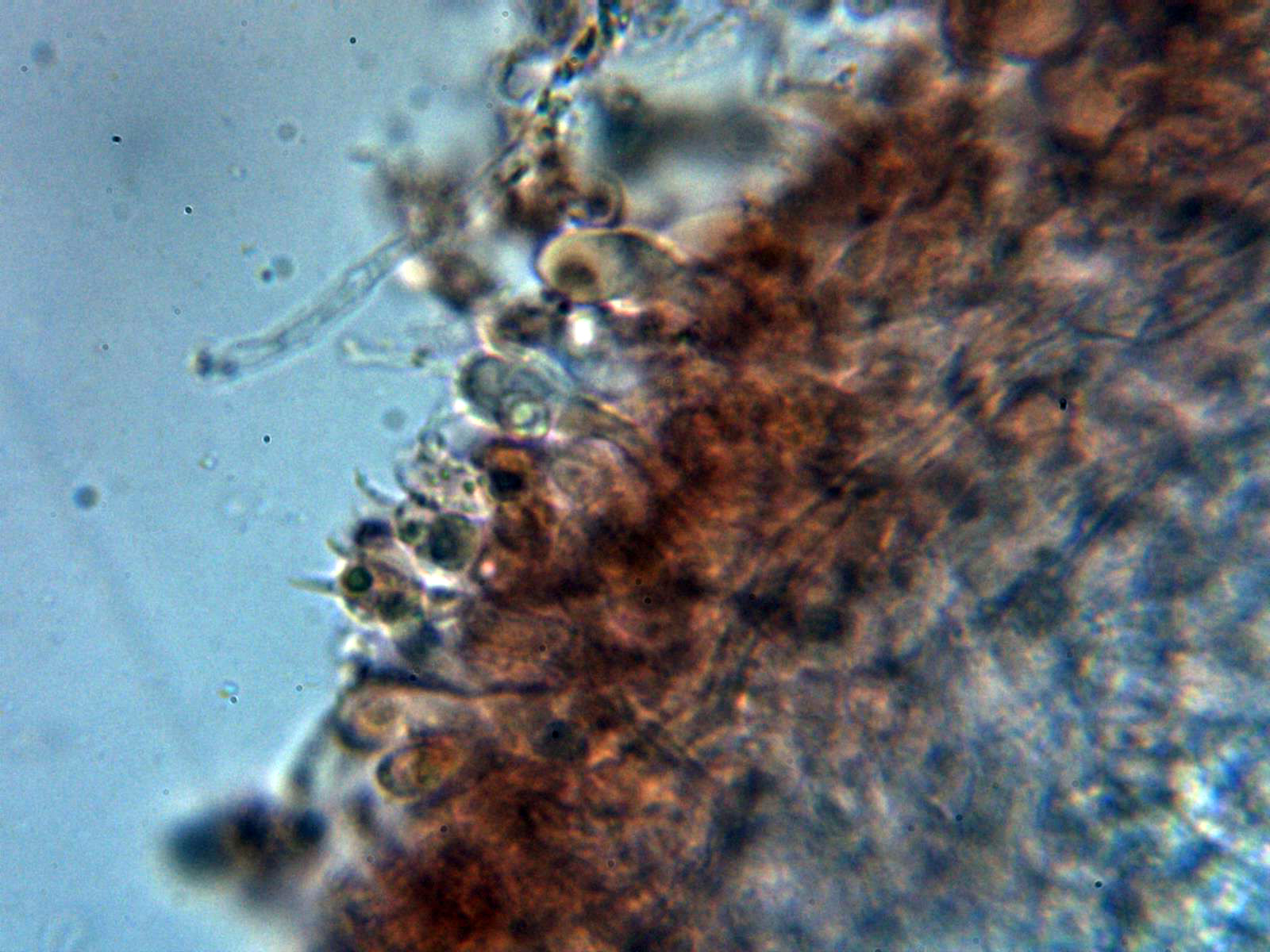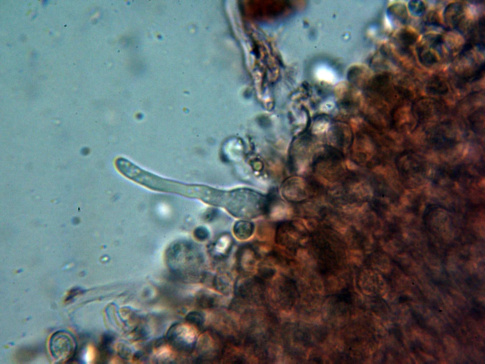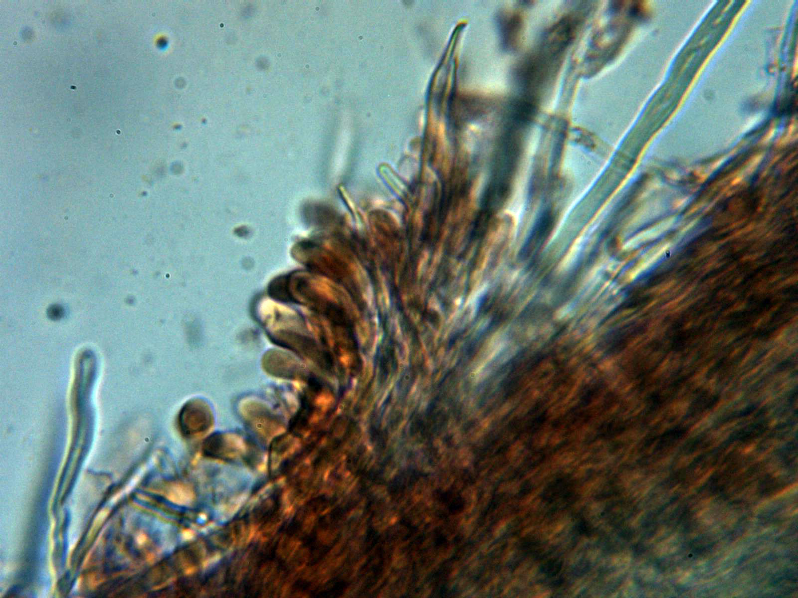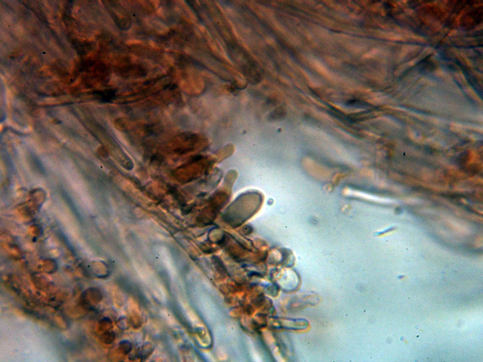 Presencia de gloeocistidios, por encima del gloeocistidio de la primera imágen se puede observar una gruesa fíbula (muy difíciles de observar en el resto del estudio).
