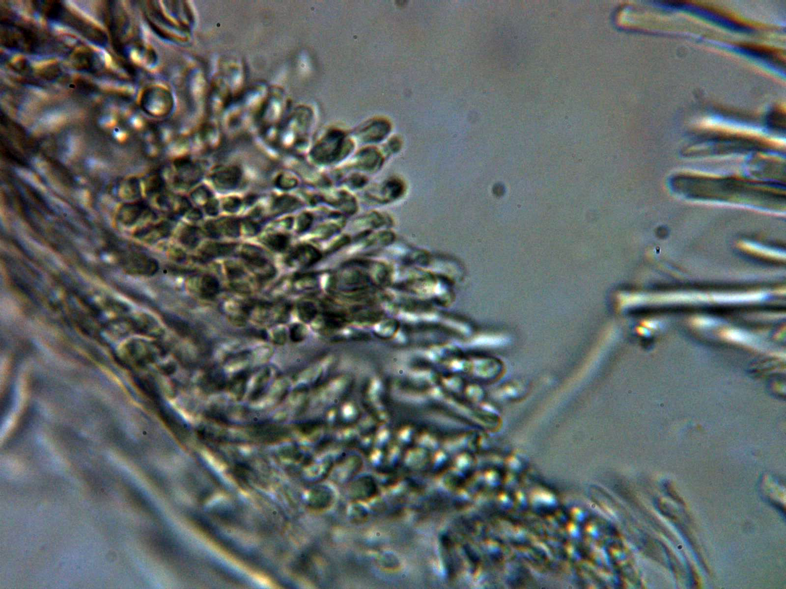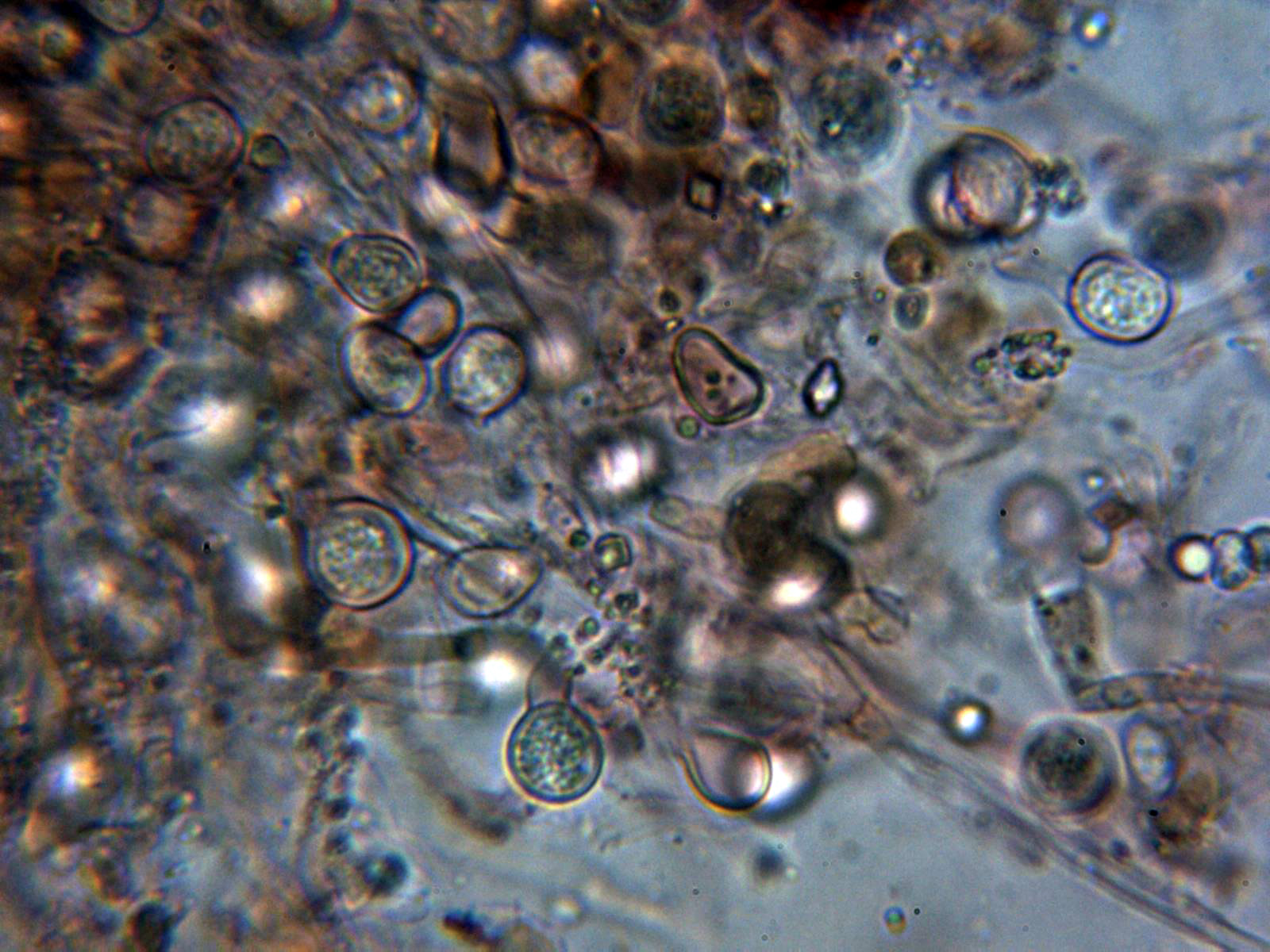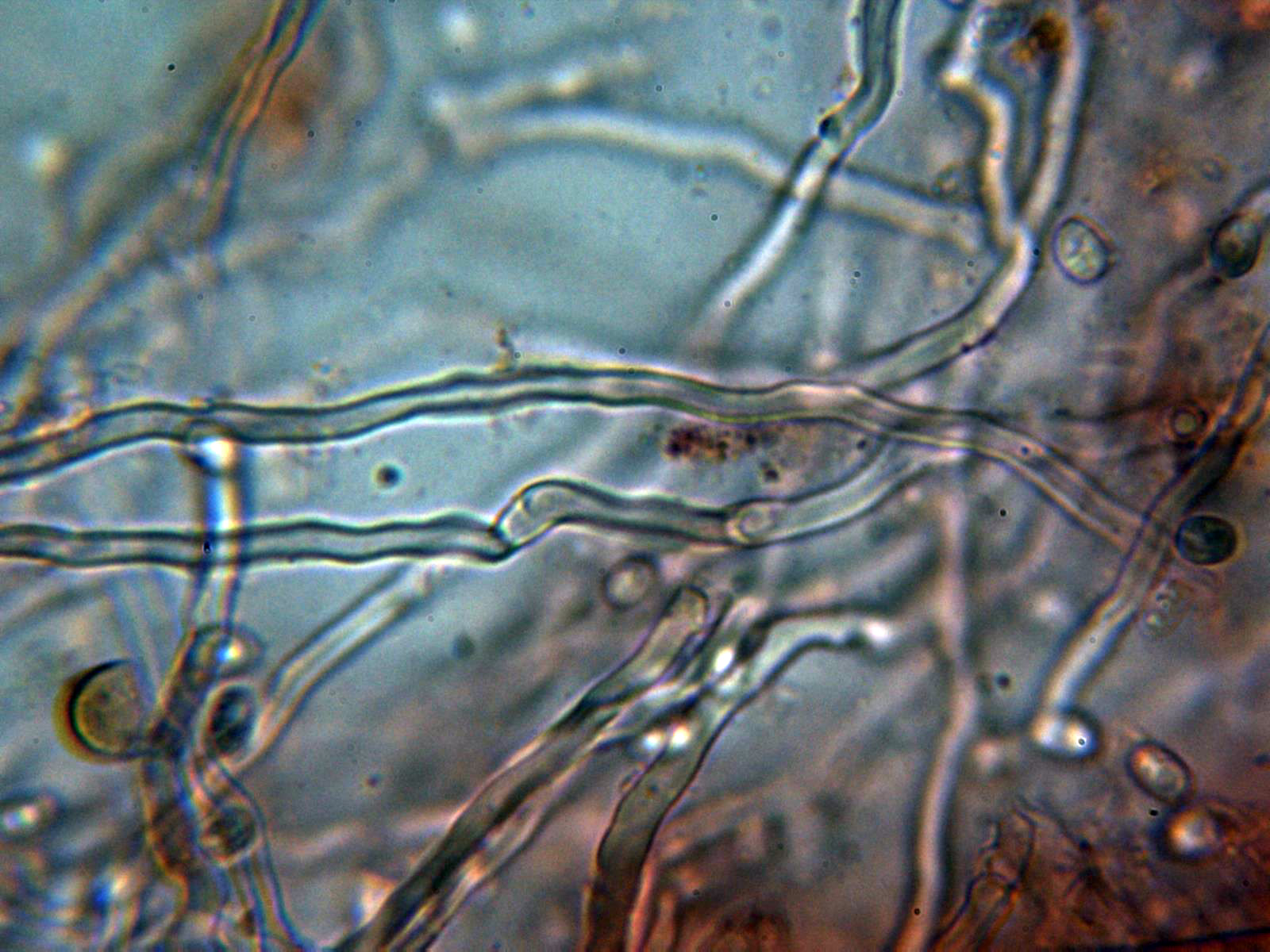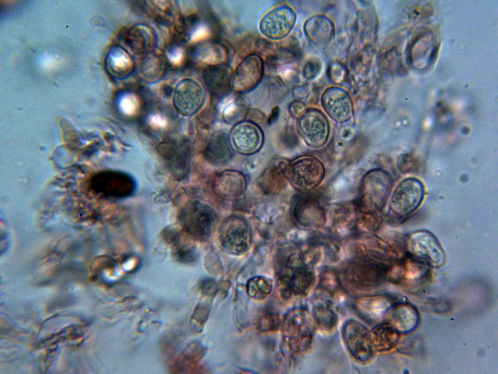 Abundantes clamidosporas presentes en las muestras preparadas, en especial al acercarnos a la base o al borde del sombrero.