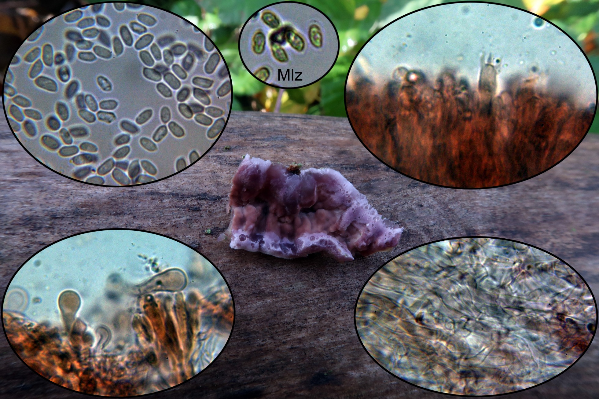 Las hifas vesiculosas en el subhimenio así como los tonos púrpuras del basidioma lo delatan: