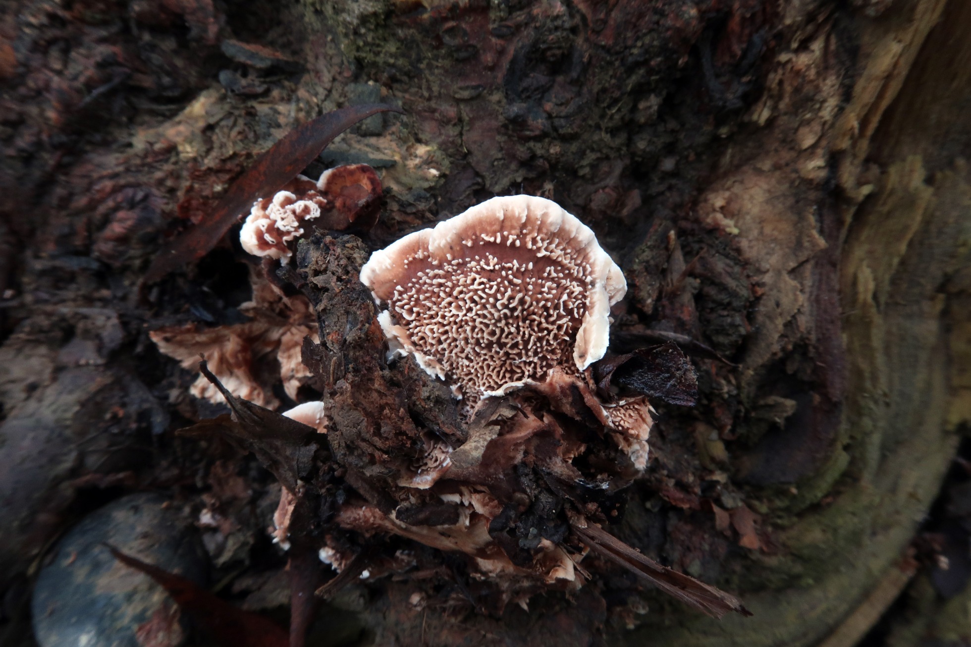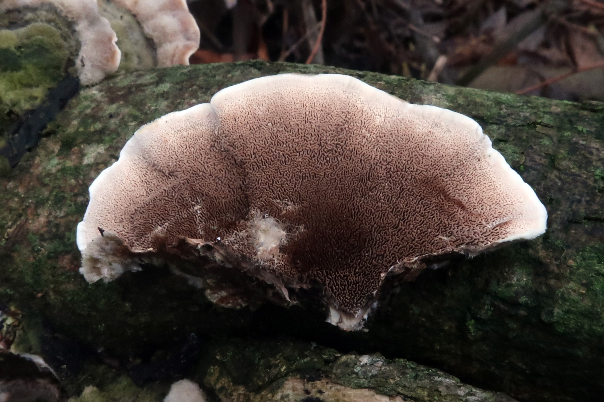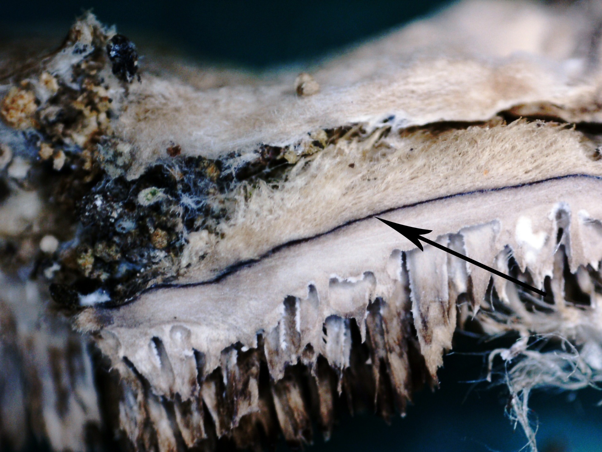 Una de las características que sirven para identificar a la Cerrena unicolor a pie de campo es la línea negra que separa la zona pileica de la zona carnosa del sombrero: