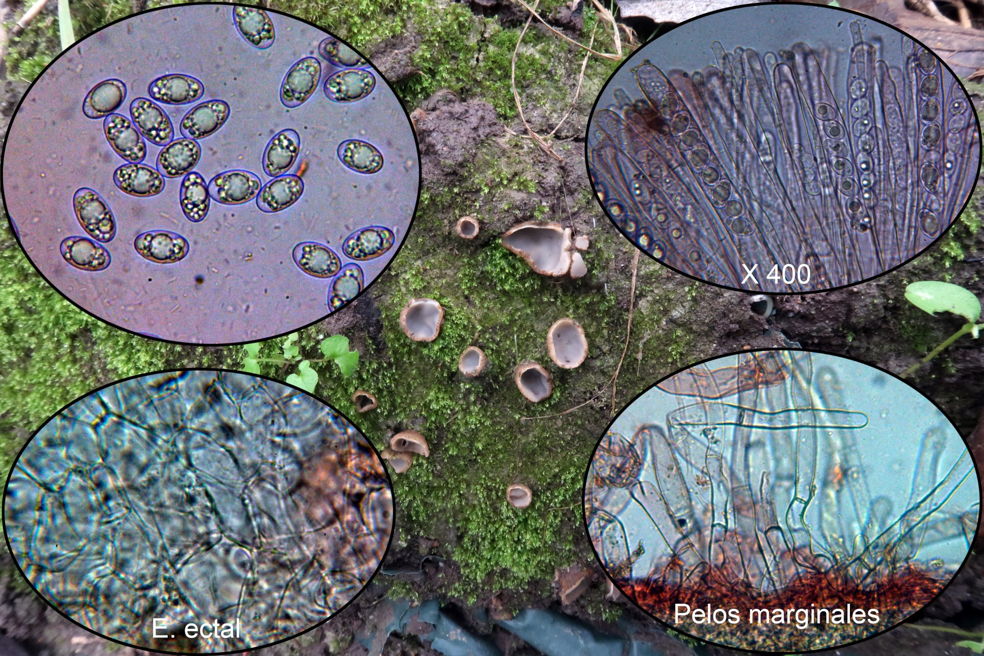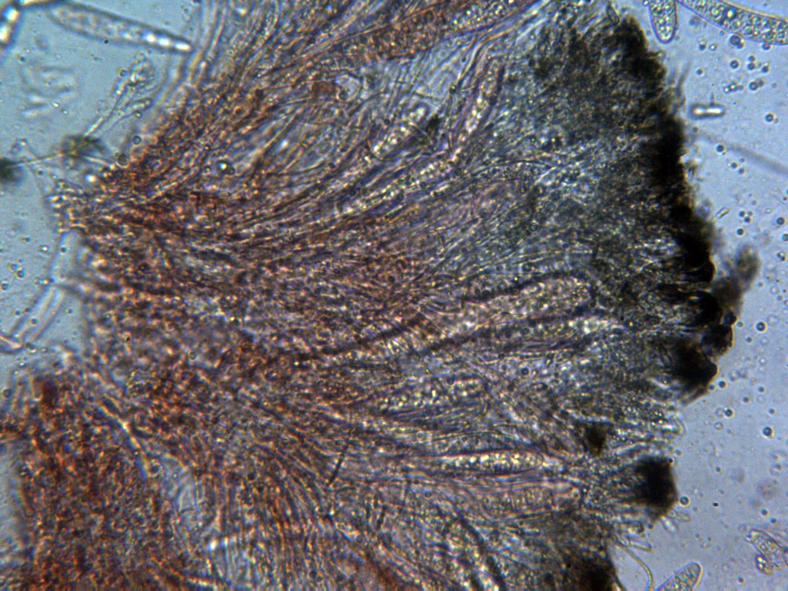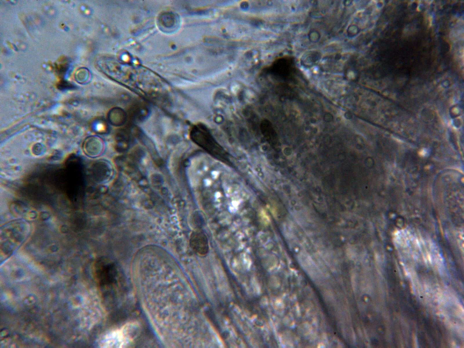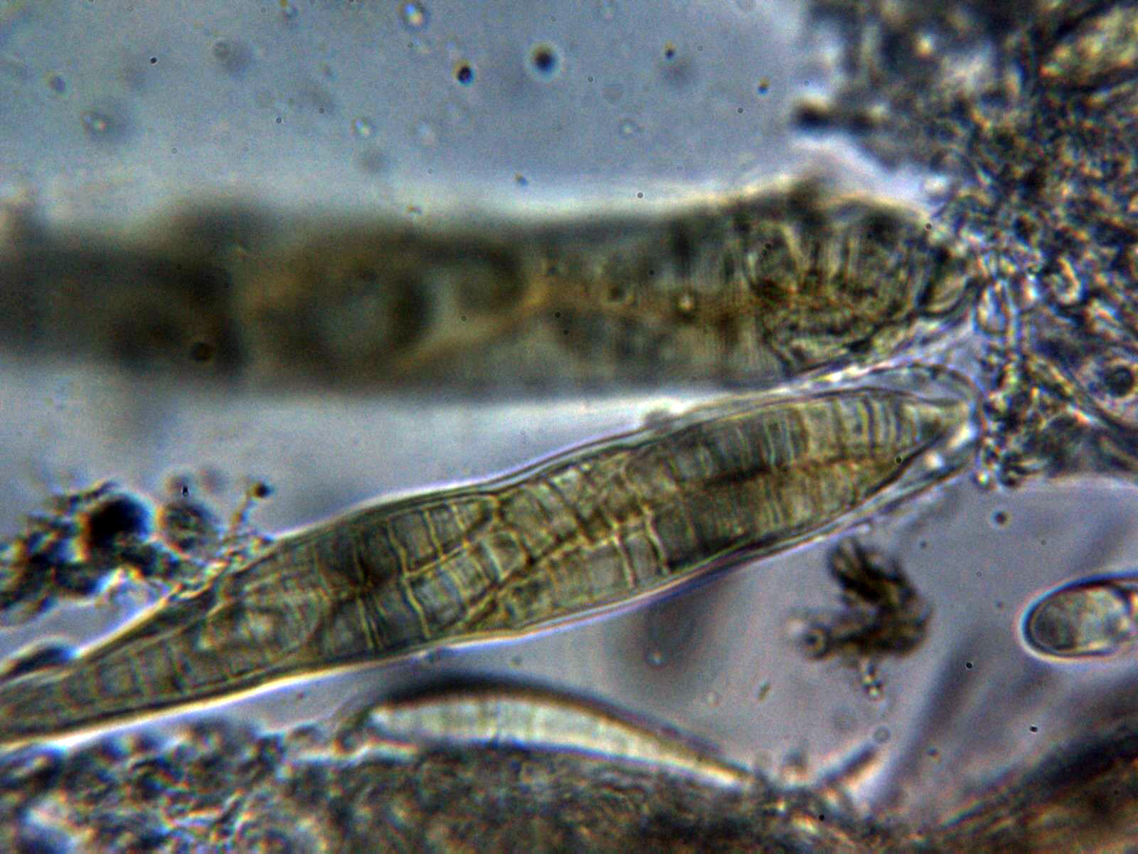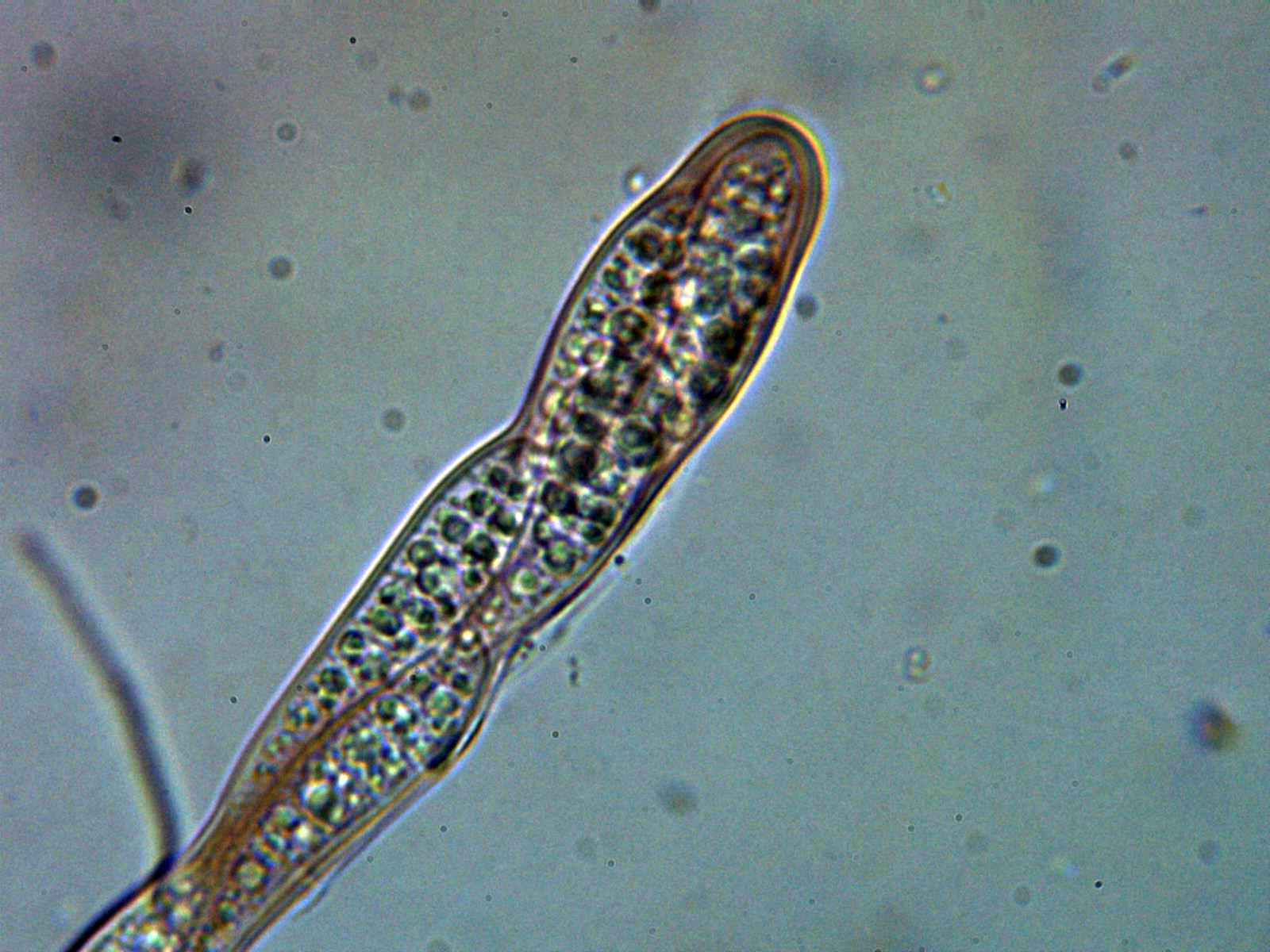 Ascas y paráfisis en agua con un marcado pigmento oscuro en la parte superior que le confiere su color negruzco:
