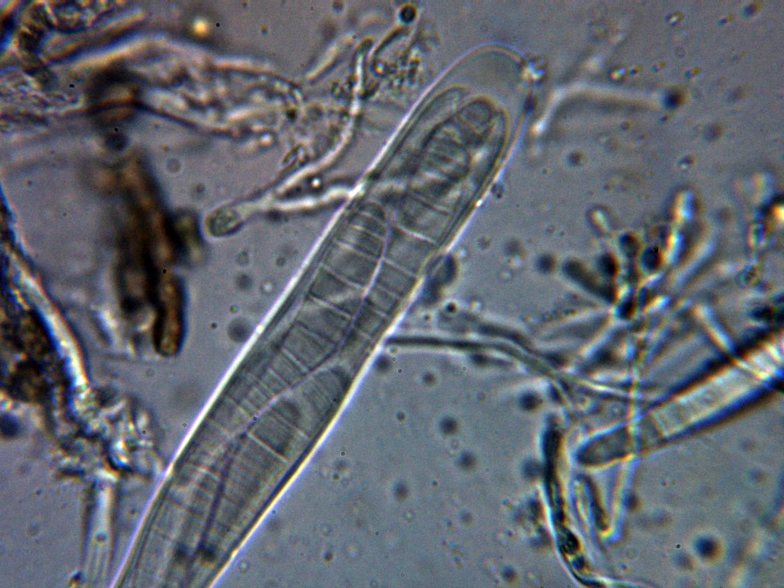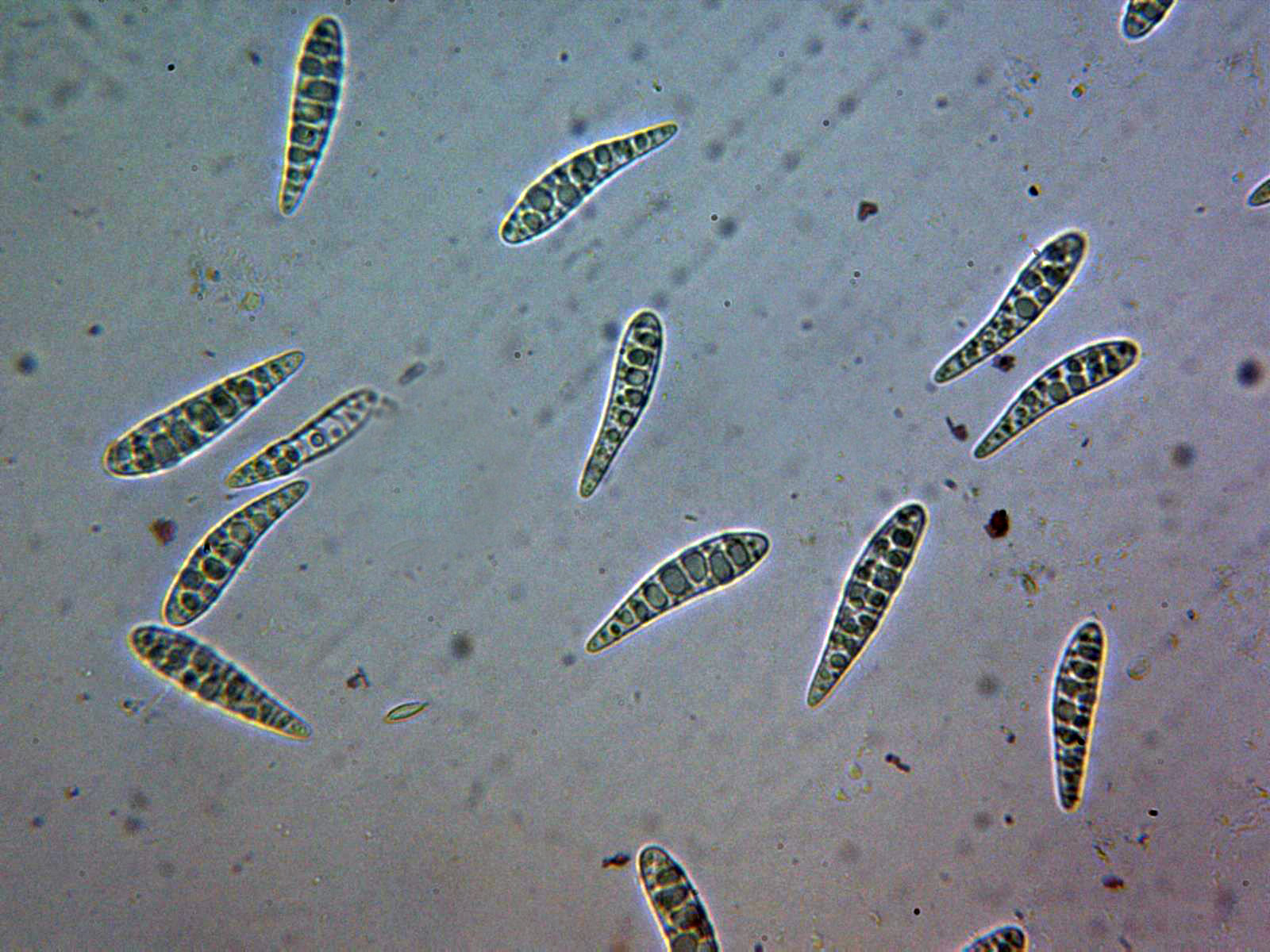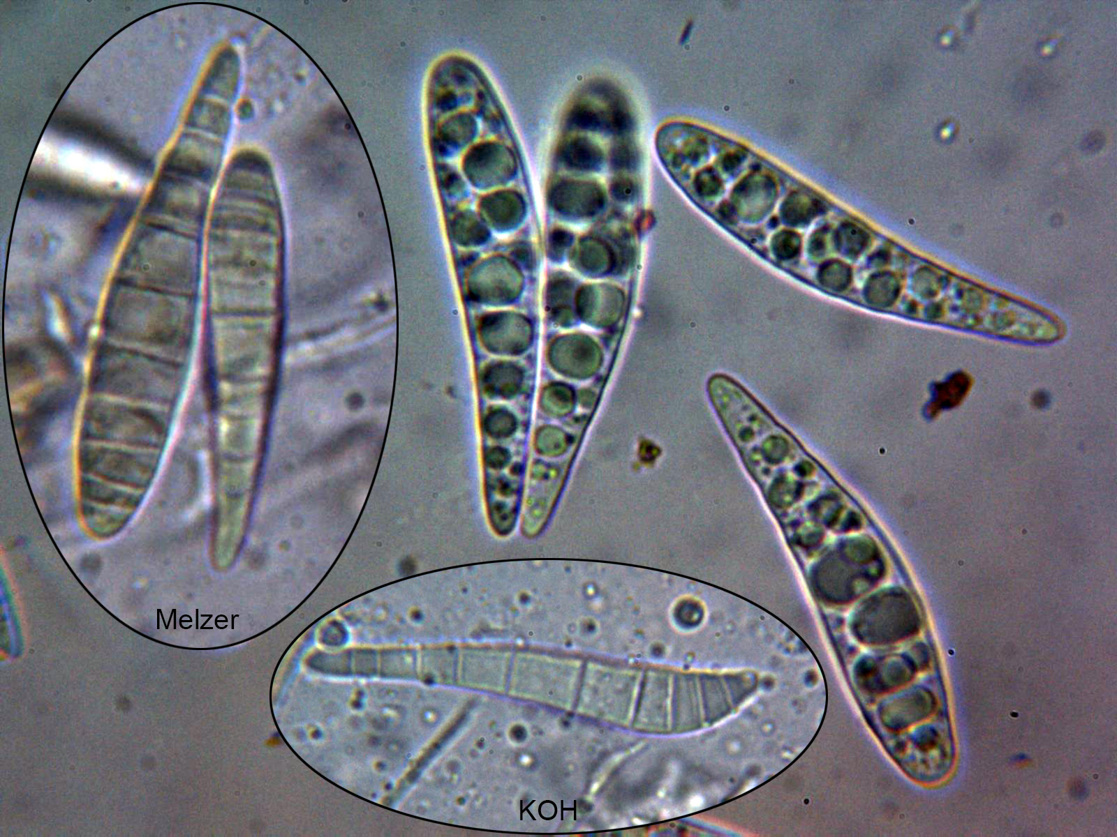 Y las esporas a 1000 aumentos, a destacar los 9 o 10 septos transversales muy visibles en KOH y en Reactivo de Melzer: