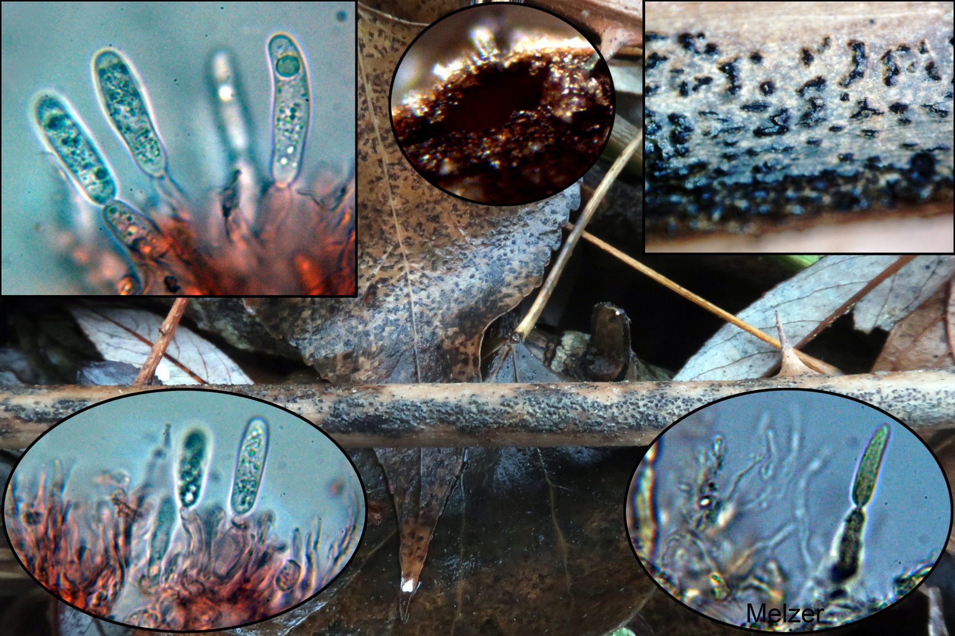 Una Botryosphaeriaceae sobre un tronco de Rubus ulmifolius que me trajo de cabeza, las Claves de "Studies in Mycology" de Septiembre de 2013, atendiendo a la conidiogénesis y por la presencia de paráfisis me llevaban al género Sphaeropsis, cuando ya estoy a punto de dejarlo como Sphaeropsis sp, me doy cuenta de que a día de hoy no hay ninguna de ellas referenciada sobre Rubus y tampoco sobre Rosáceas, lo que parecía llevarme a un callejón sin salida, y en este momento me vino la inspiración y dado que en la zona abunda y mucho la Botryosphaeria dothidea, busqué información de su anamorfo con el cuál parece coincidir perfectamente, se trataría pues de la forma imperfecta, asexual o conidial, es decir el anamorfo de la Botryosphaeria dothidea, en este caso muy bien referenciado sobre Rubus sp.