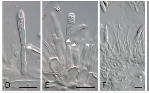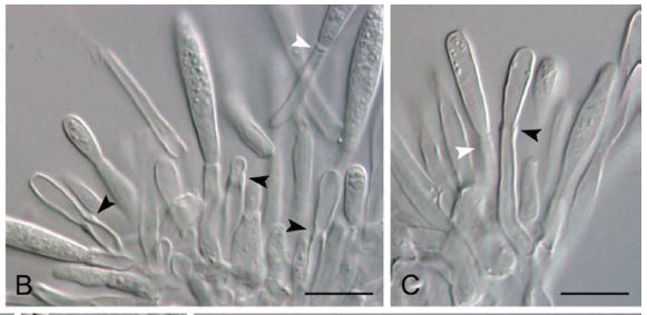 Y las hifas conidiógenas y a la derecha las paráfisis: