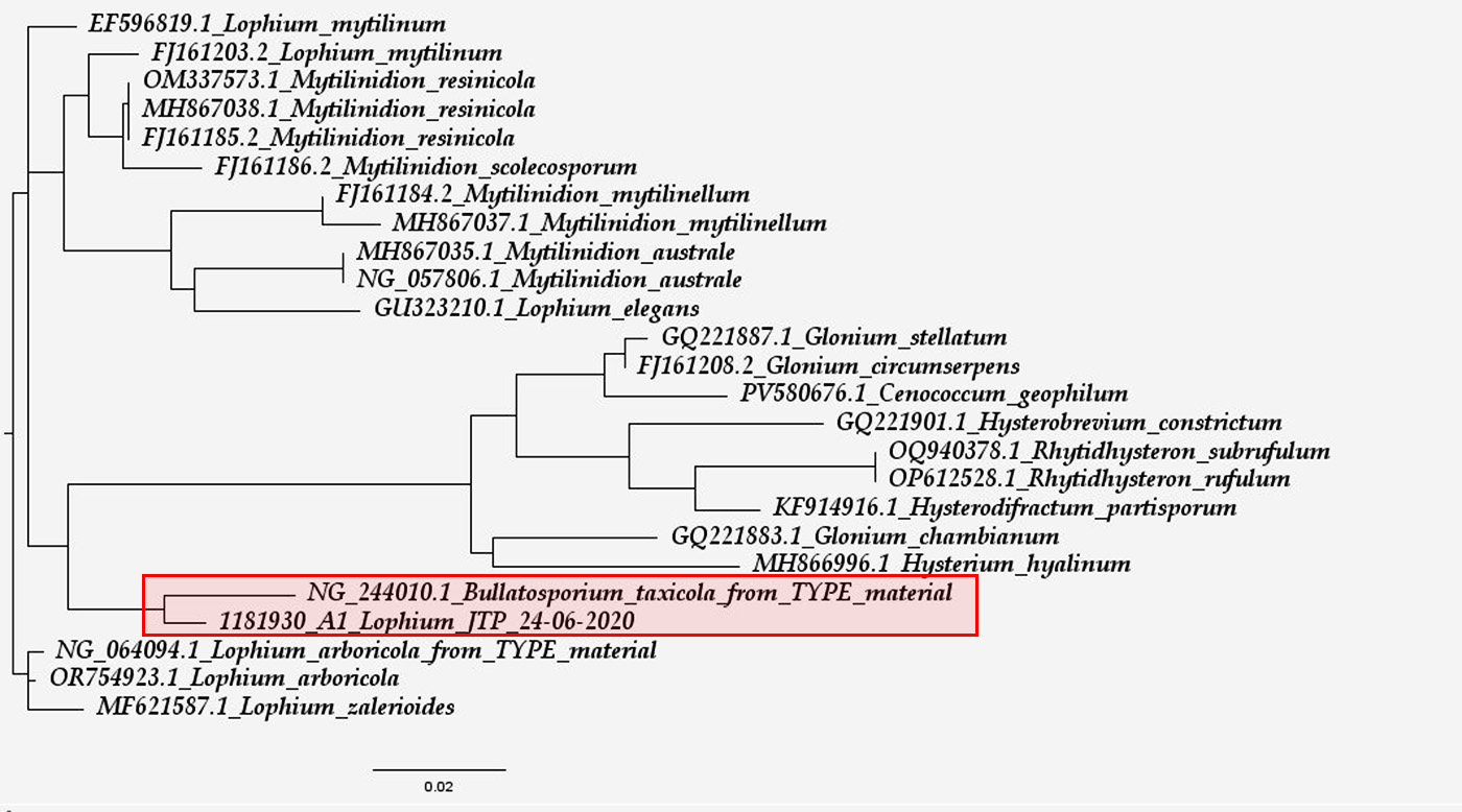 Aquí ya se alinea mi especie con un nuevo género monoespecífico creado en 2024 por Andreasen & Nordén, se trata de la secuencia de la especie tipo, el Bullatosporium taxicola, aunque un poco alejado de este, quedando como especie más cercana a nivel molecular el Lophium arboricola, y ya un poco más alejados unos Mytilinidion, el Mytilinidion mytilinum, el Mytilinidion resinicola, el Mytilinidium mytilinellum y el Mytilinidion australe, del Mytilinidion tortile del que sospeché desde un primer momento ni rastro en el Blast, con lo que se encuentra muy lejos a nivel molecular de mi propuesta, tocará pues editar el tema.