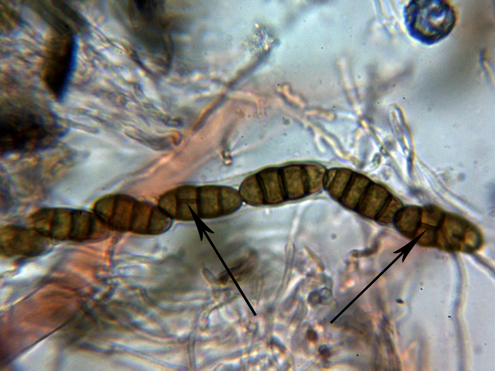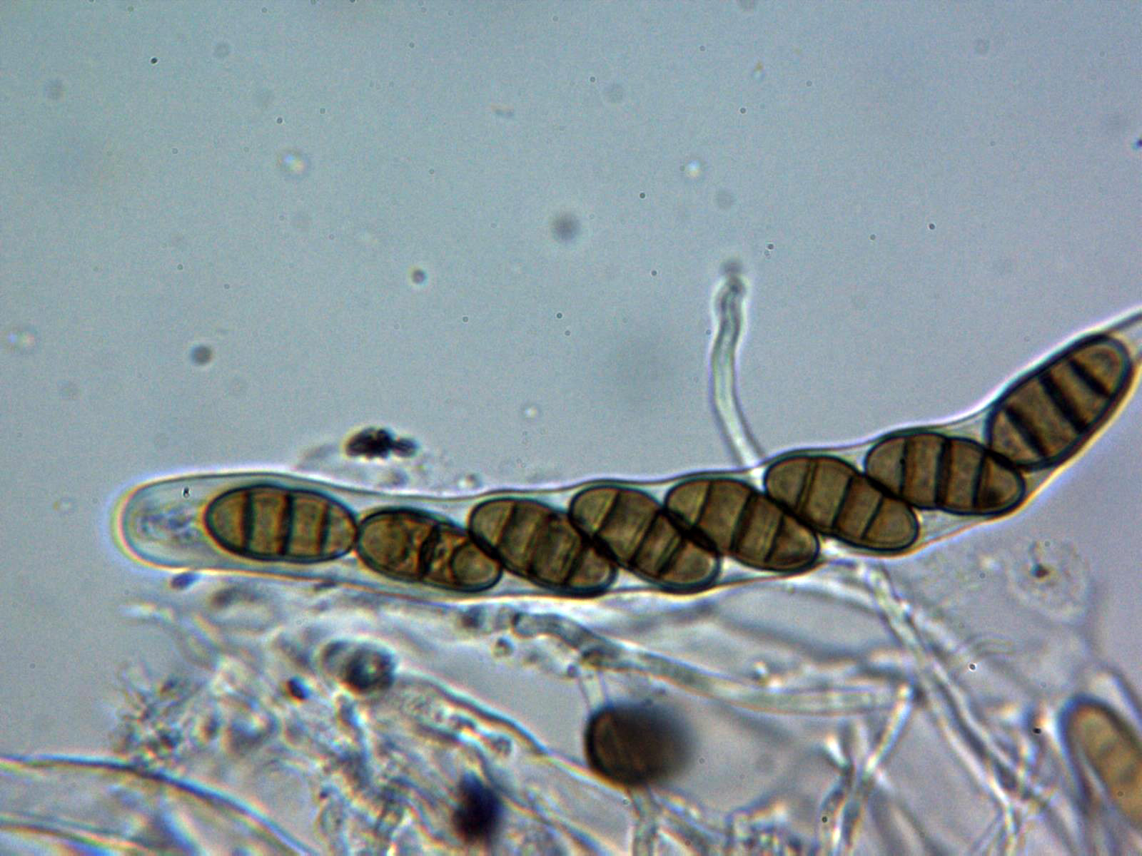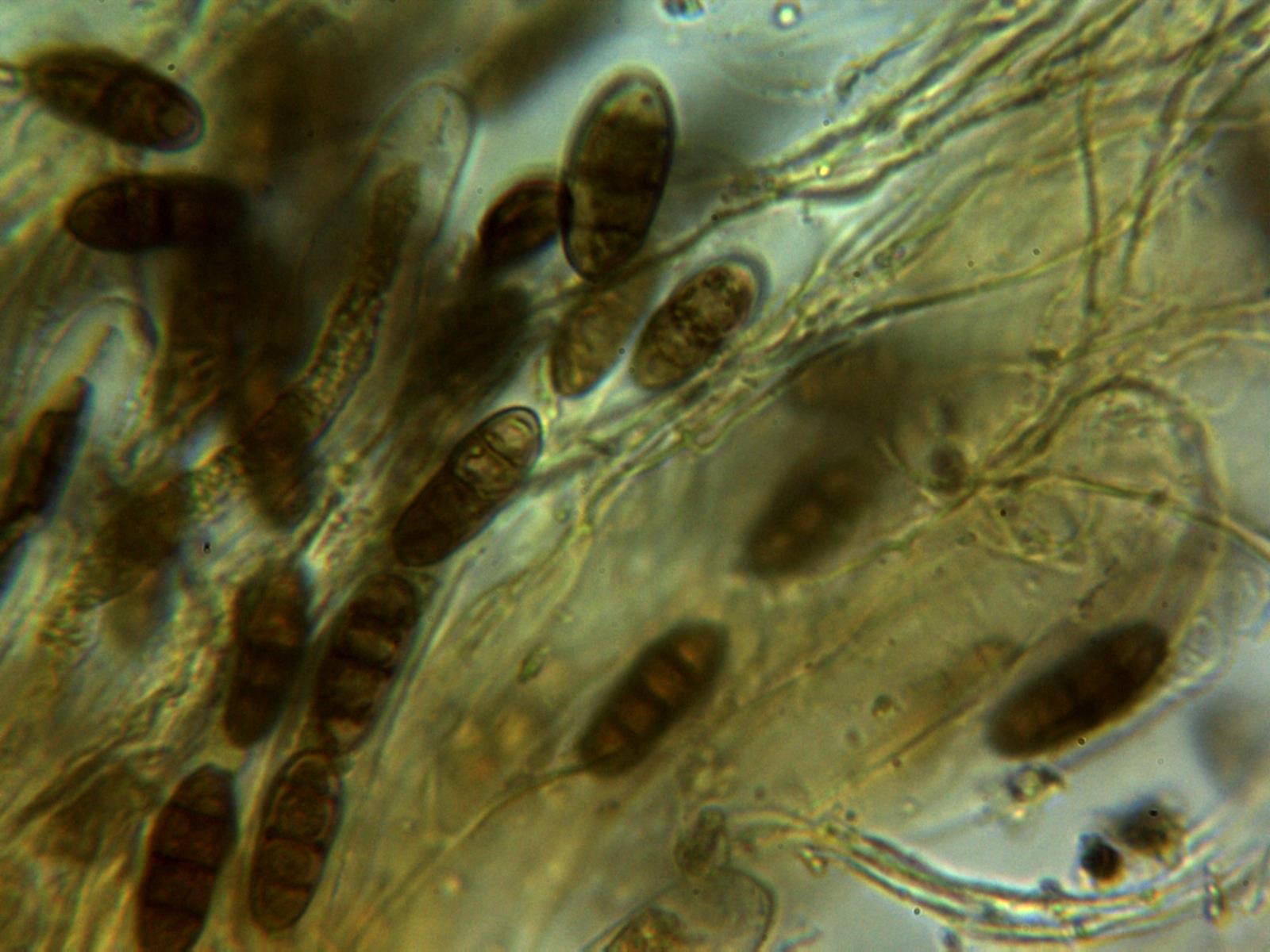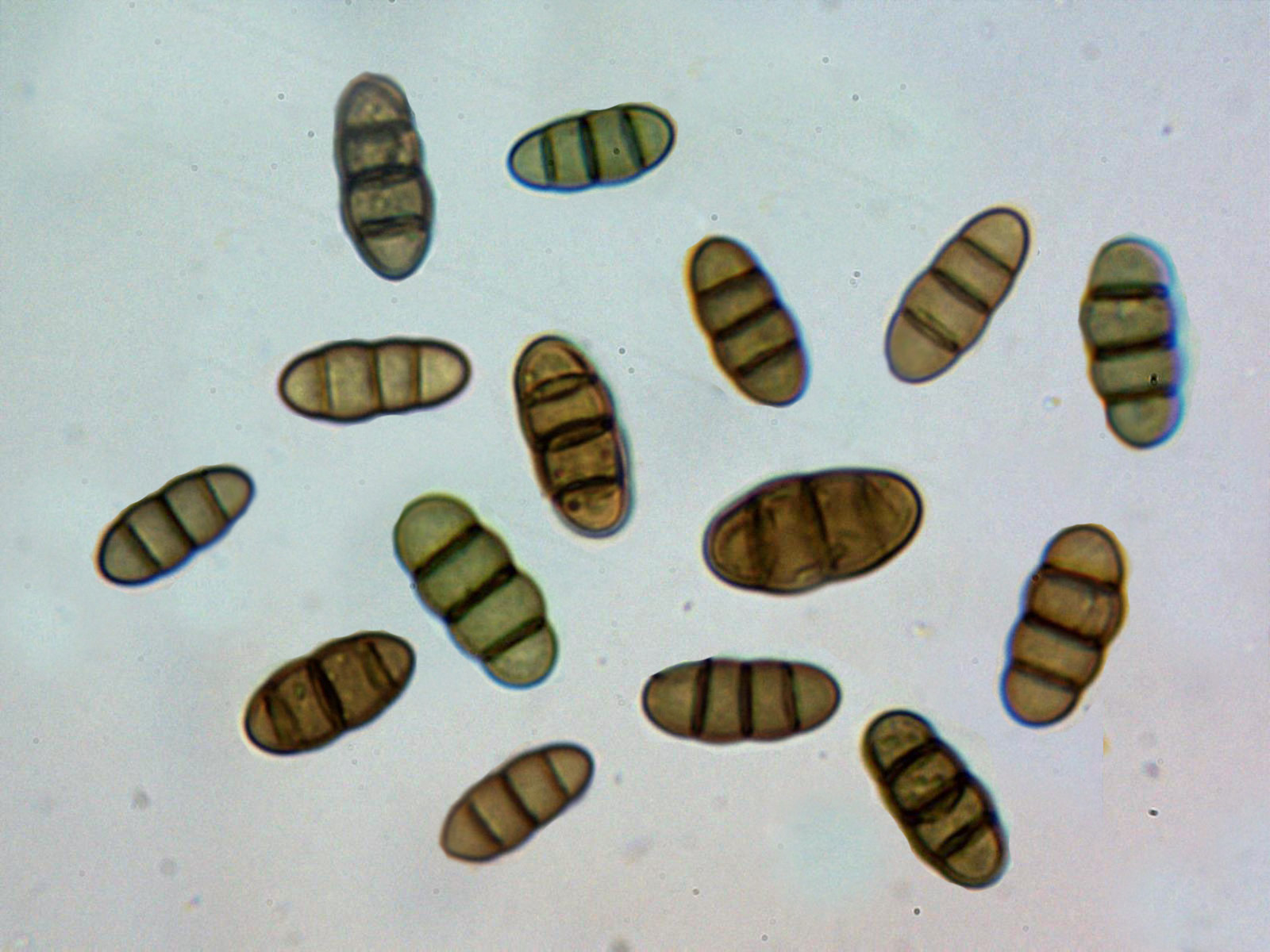 Ascosporas de color marrón con tres septos muy marcados, con constreñimiento en los mismos, con algún pequeño septo longitudinal en algunas esporas dentro del asca. Las esporas con unas medidas de: