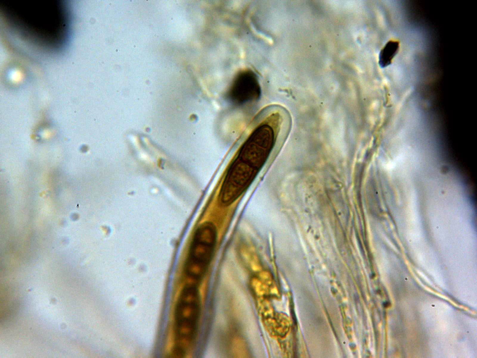 Y aquí viene el elemento de la discordia, en un par de esporas dentro del asca se observa un corto septo longitudinal: