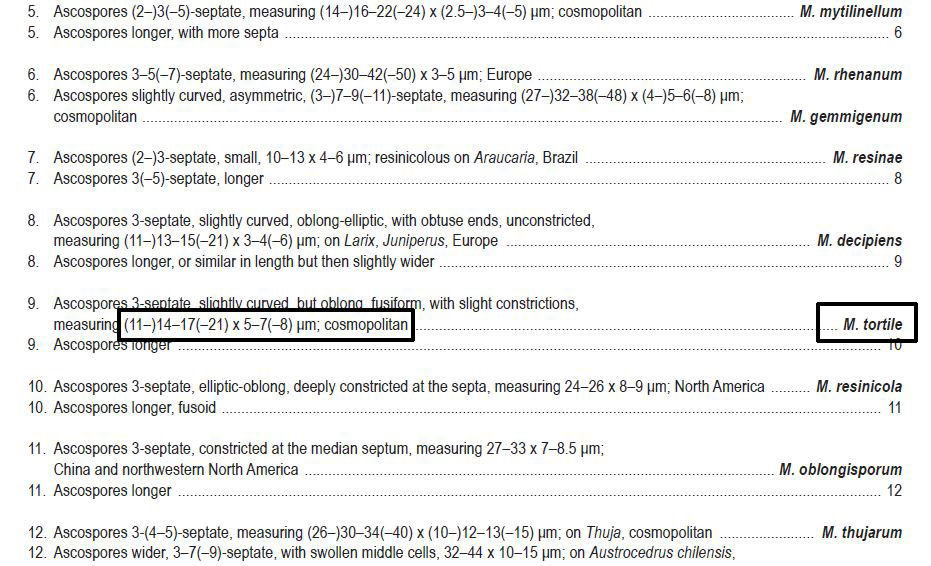 Parece muy claro que mi propuesta no se trata de un Lophium, con un aspecto macro muy distinto y una microscopía si cabe mucho mas distinta aún, con esporas filiformes, así que debía centrar mis esfuerzos en Mytilinidium.