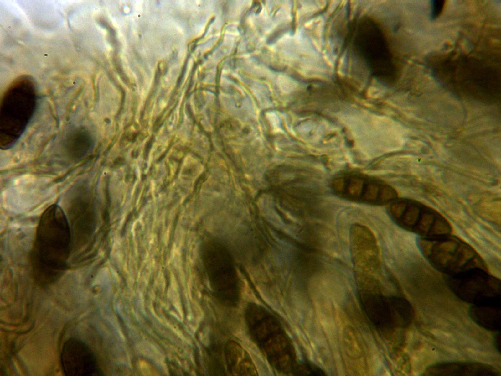 Paráfisis filiformes, abundantes y muy ramificadas, de entre 1,4 a 2,4 µm. de ancho, hialinas en agua y con contenido que se tiñe de verde con reactivo de Melzer.