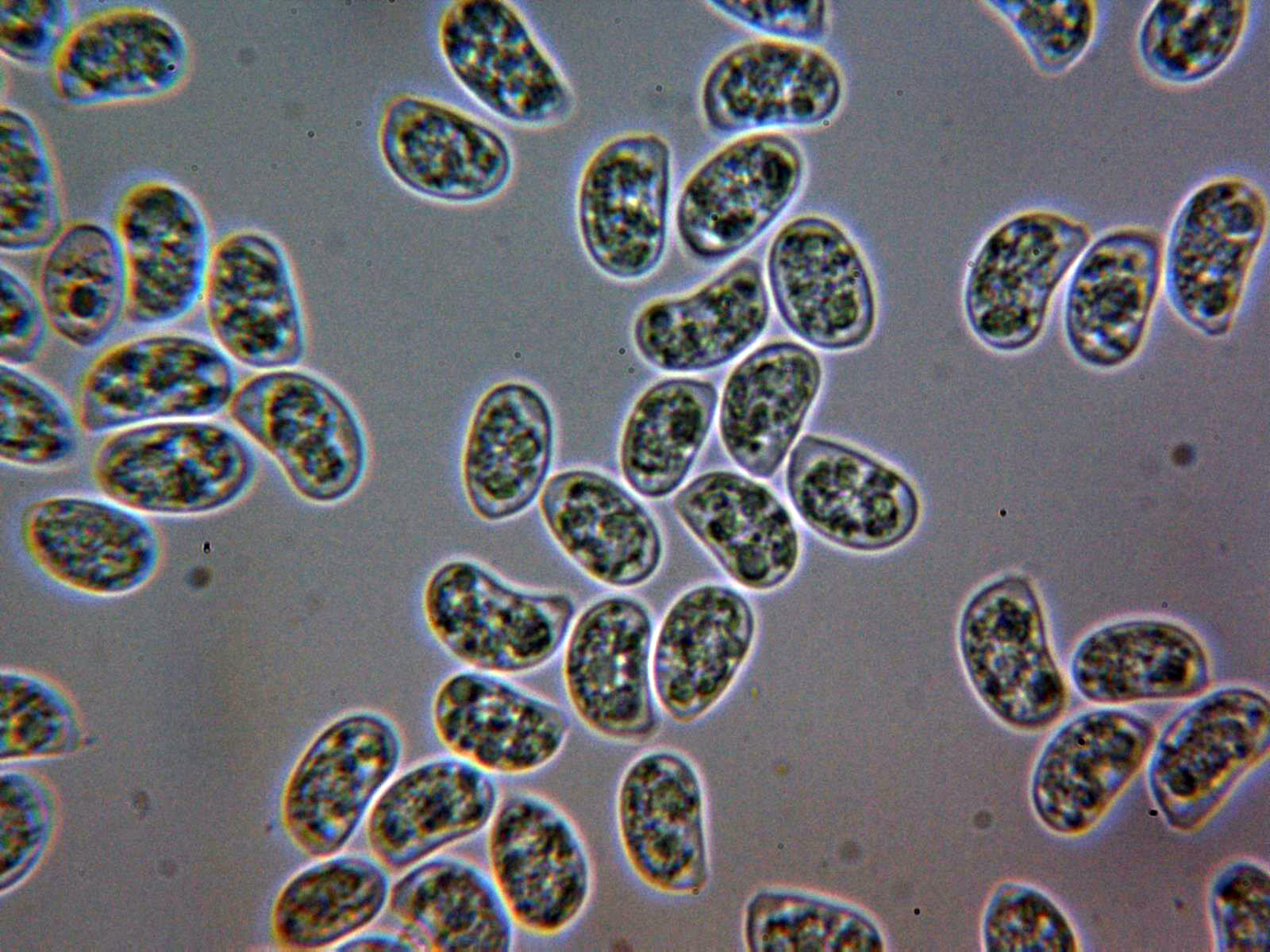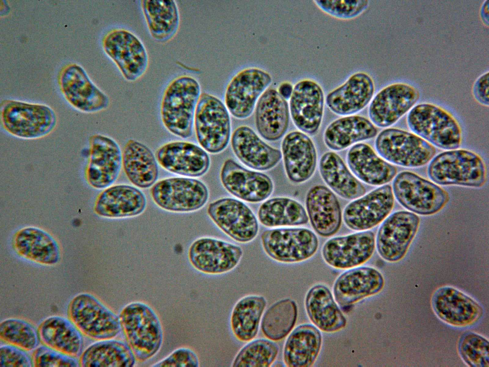 Esporas entre oblongas y algo alantoides, hialinas, de pared fina y contenido granuloso en su interior, con unas medidas de: