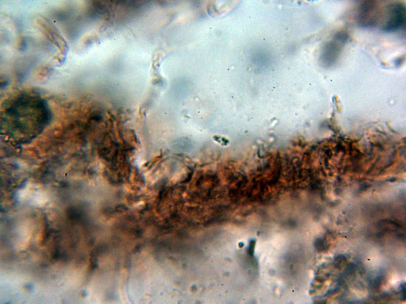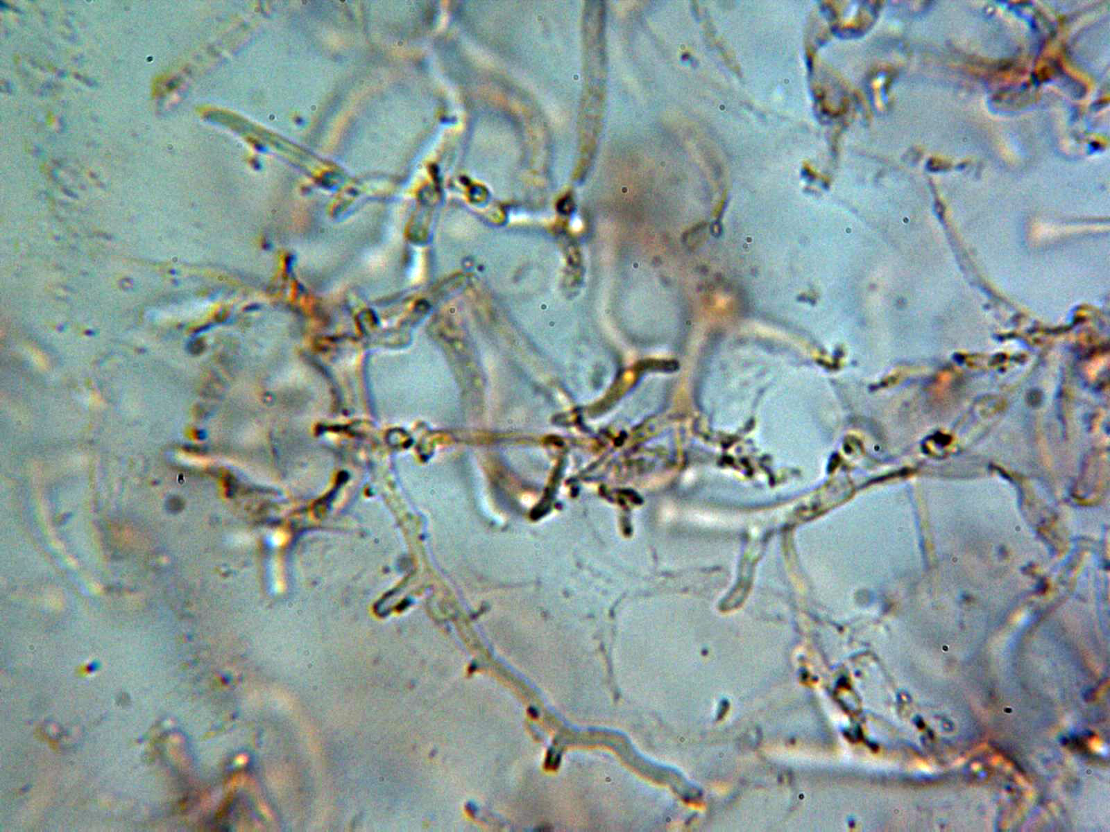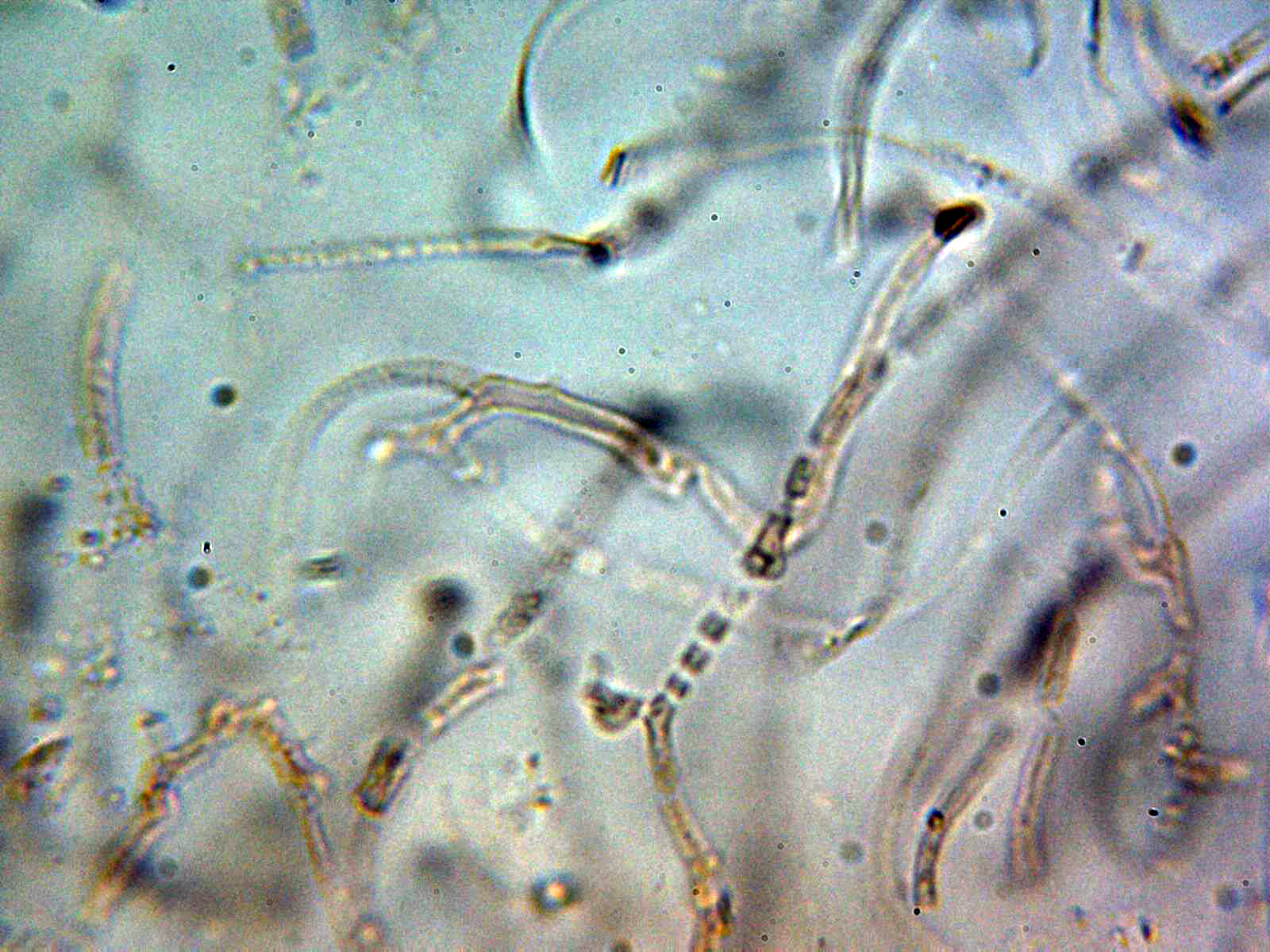 Por debajo de estas hifas una capa de hifas filamentosas gelatinizadas y con una anchura de entre 2,2 a 3,1 µm.