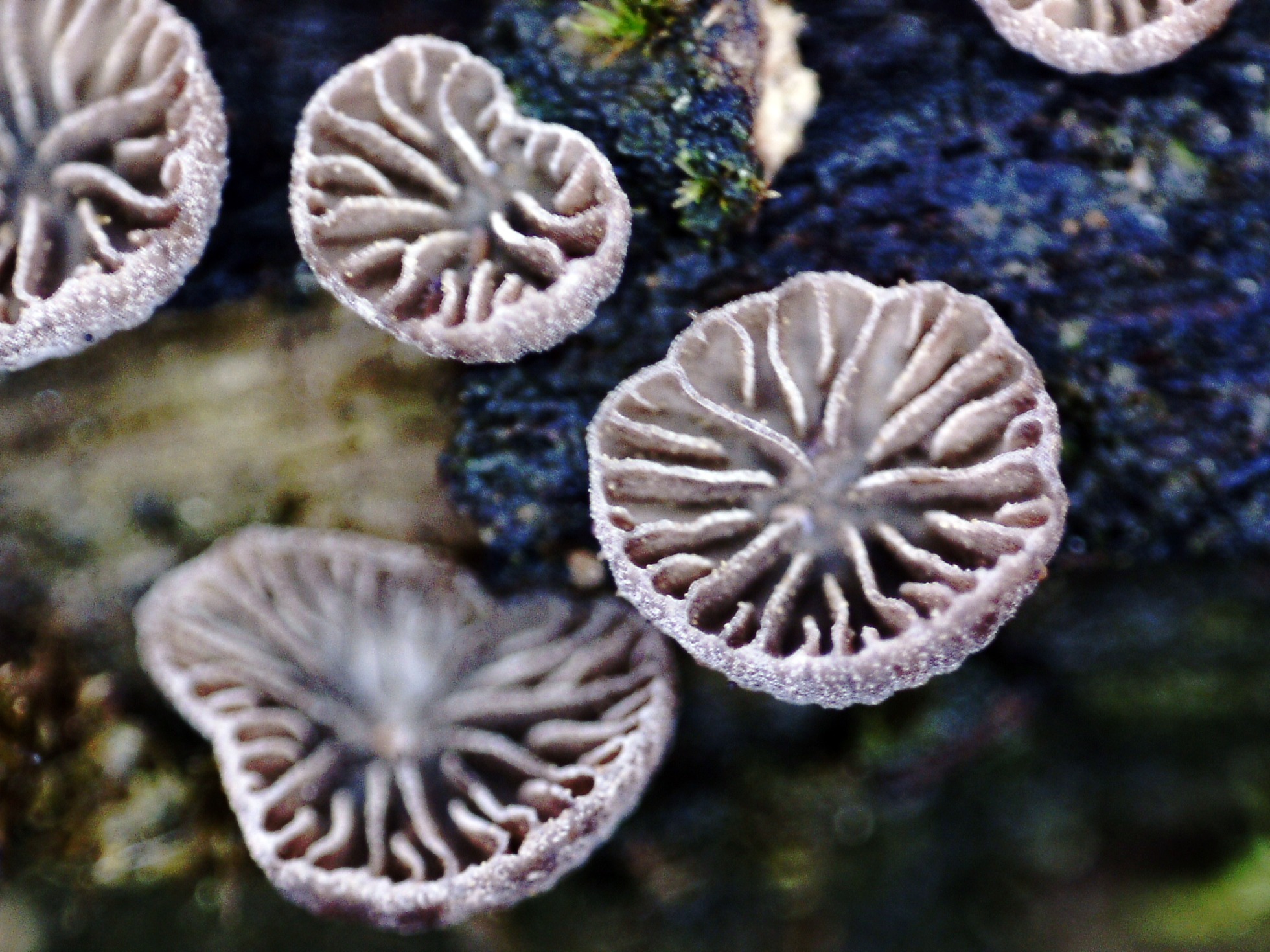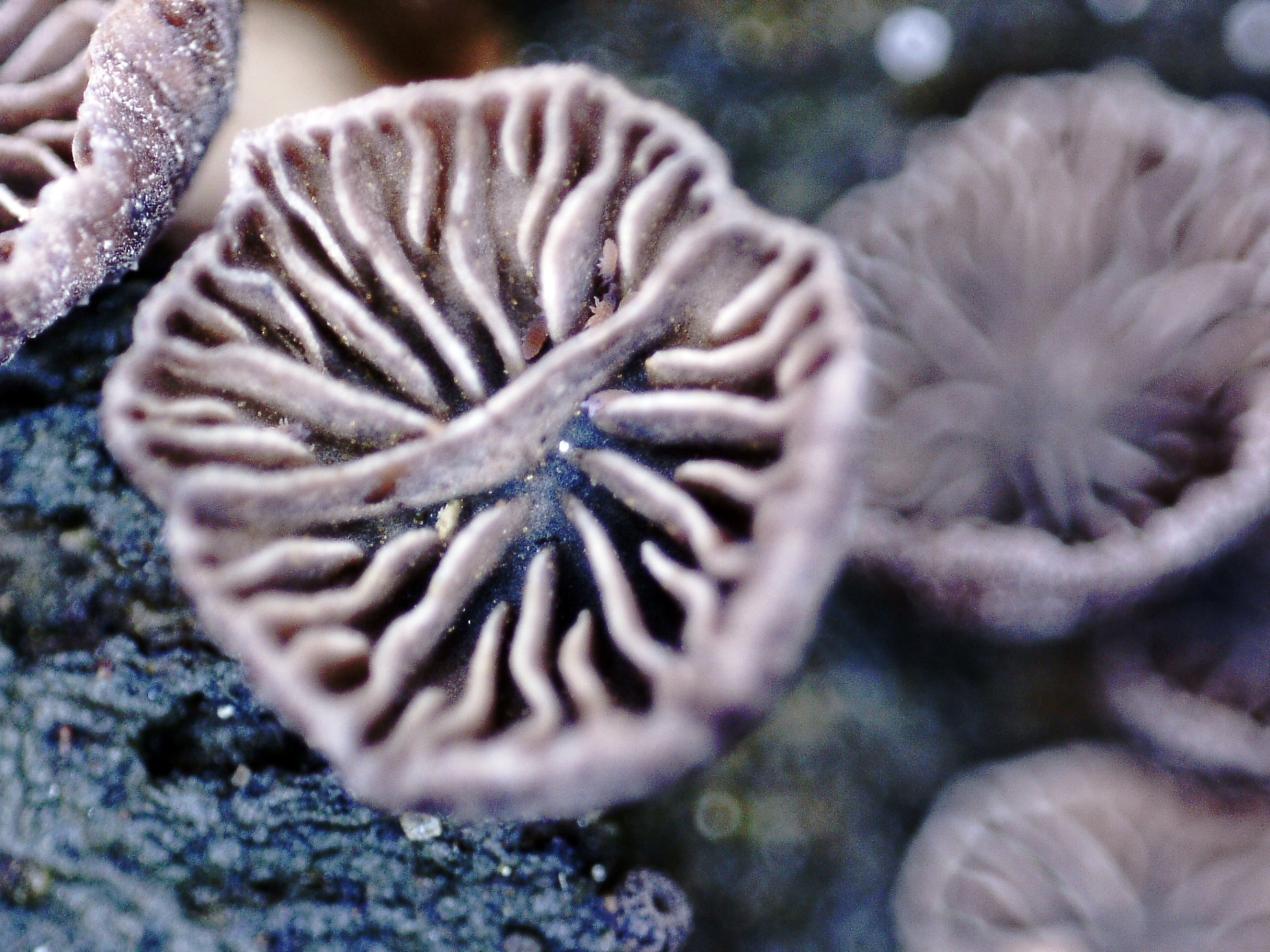 gris plateado, más o menos marrón u oscuro, margen blanco; cutícula floja, delgada; contexto hialino, constituido por hifas gelatinosas; laminillas estrechas, desiguales, que irradian desde el centro, más bien distante, negro, borde entero, gris ceniza; basidios davados (25 x 5µm.); cistidios ausentes; esporas hialinas, liso, cilíndrico-ovoide, ligeramente curvado, obtuso en ambas puntas (8 x 3 µm.).