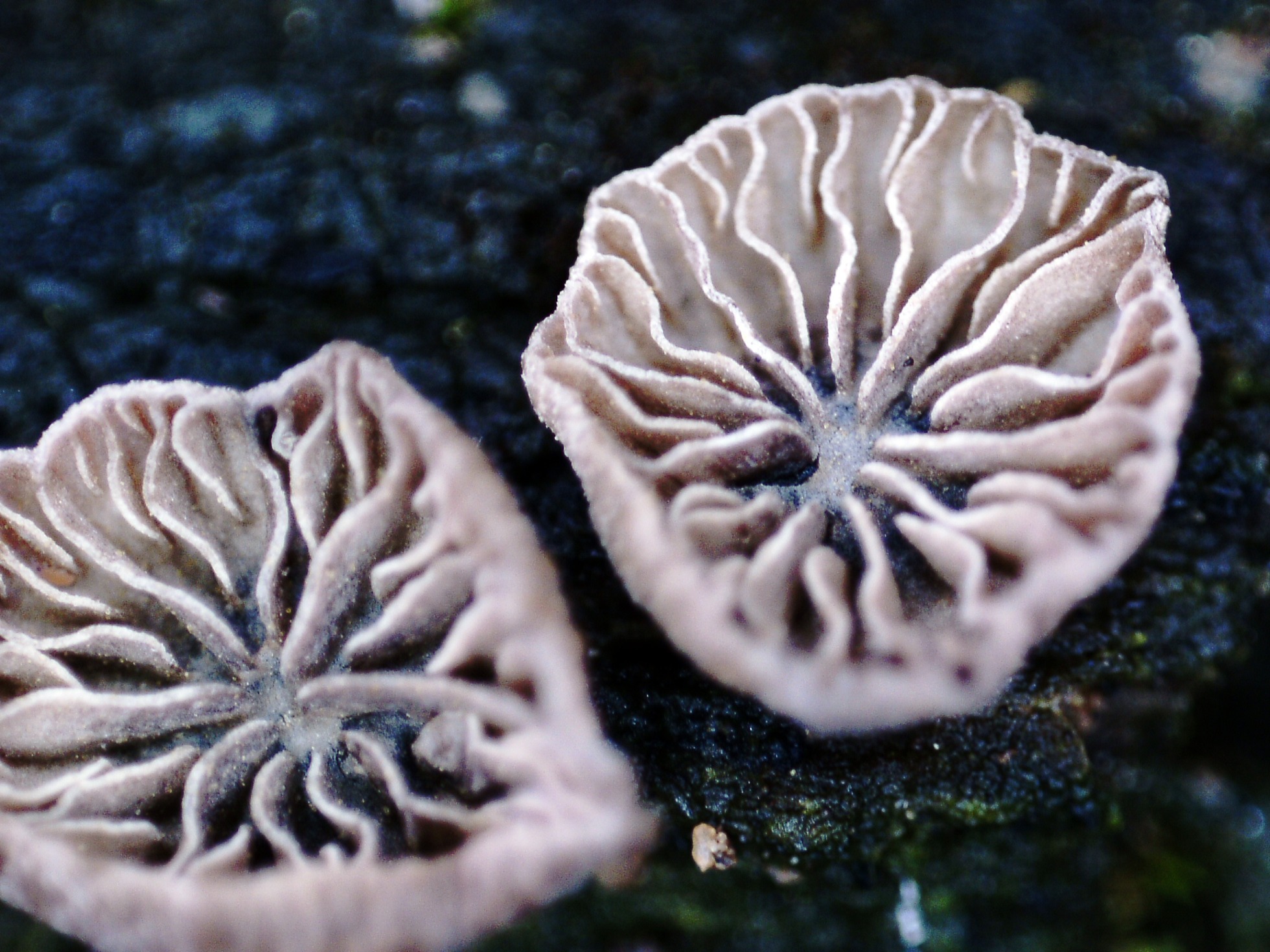 Pequeños ejemplares de entre 2,2 y 4,9 mm. de diámetro, de color marrón grisáceo con forma de concha y el borde ondulado por el efecto de las láminas.