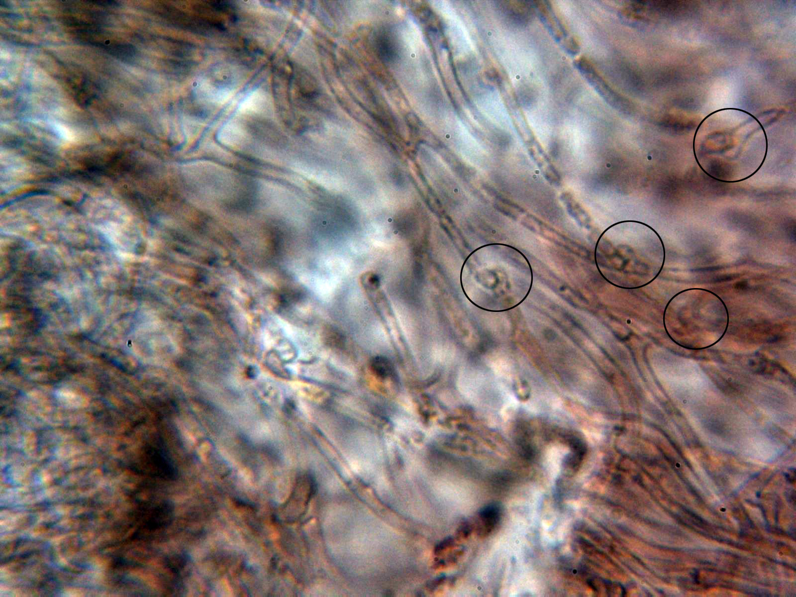 Todo el contexto de la pileipellis con abundantes fíbulas: