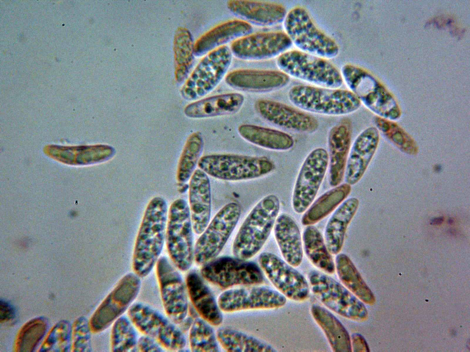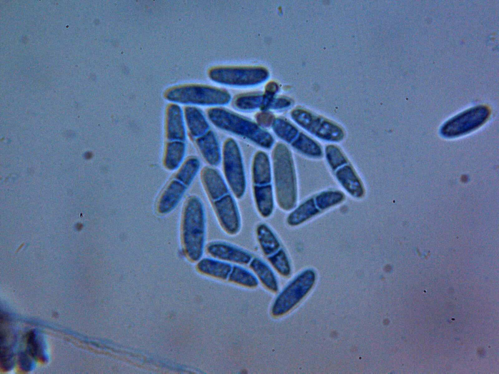 Las esporas en Azul de Lactofenol, donde se observa un septo en su parte central: