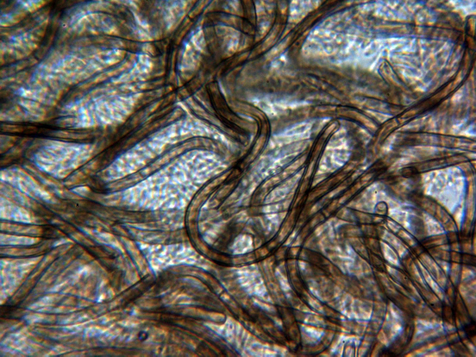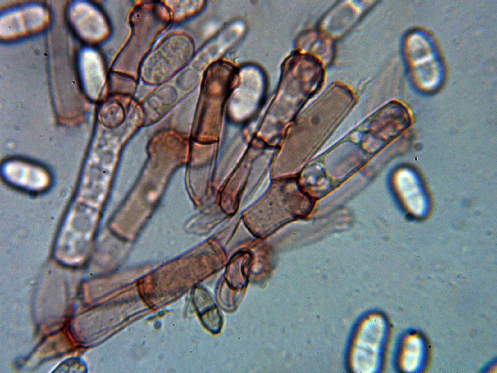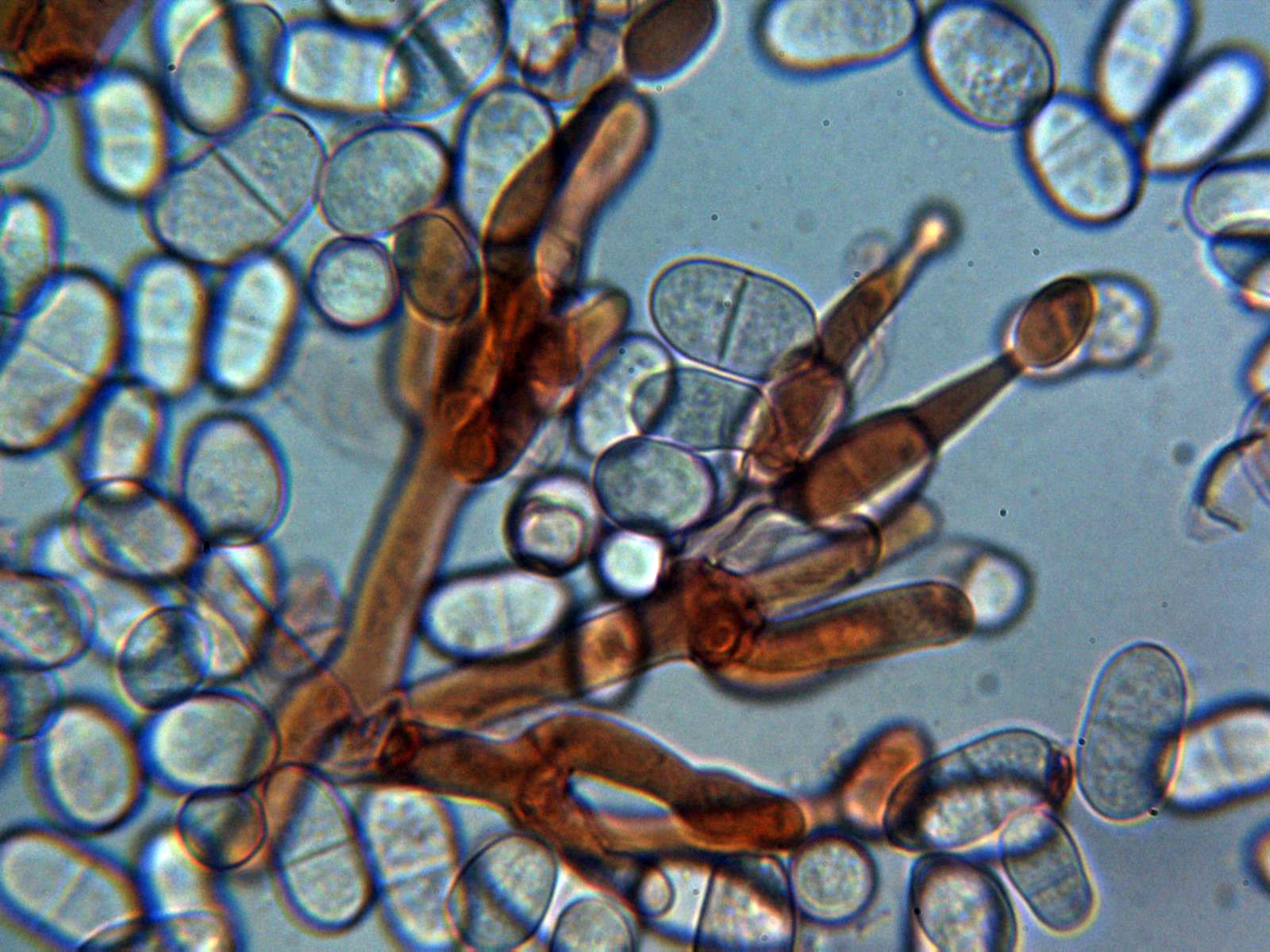 Hifas de pared ancha con septos simples y pigmento de color marrón.