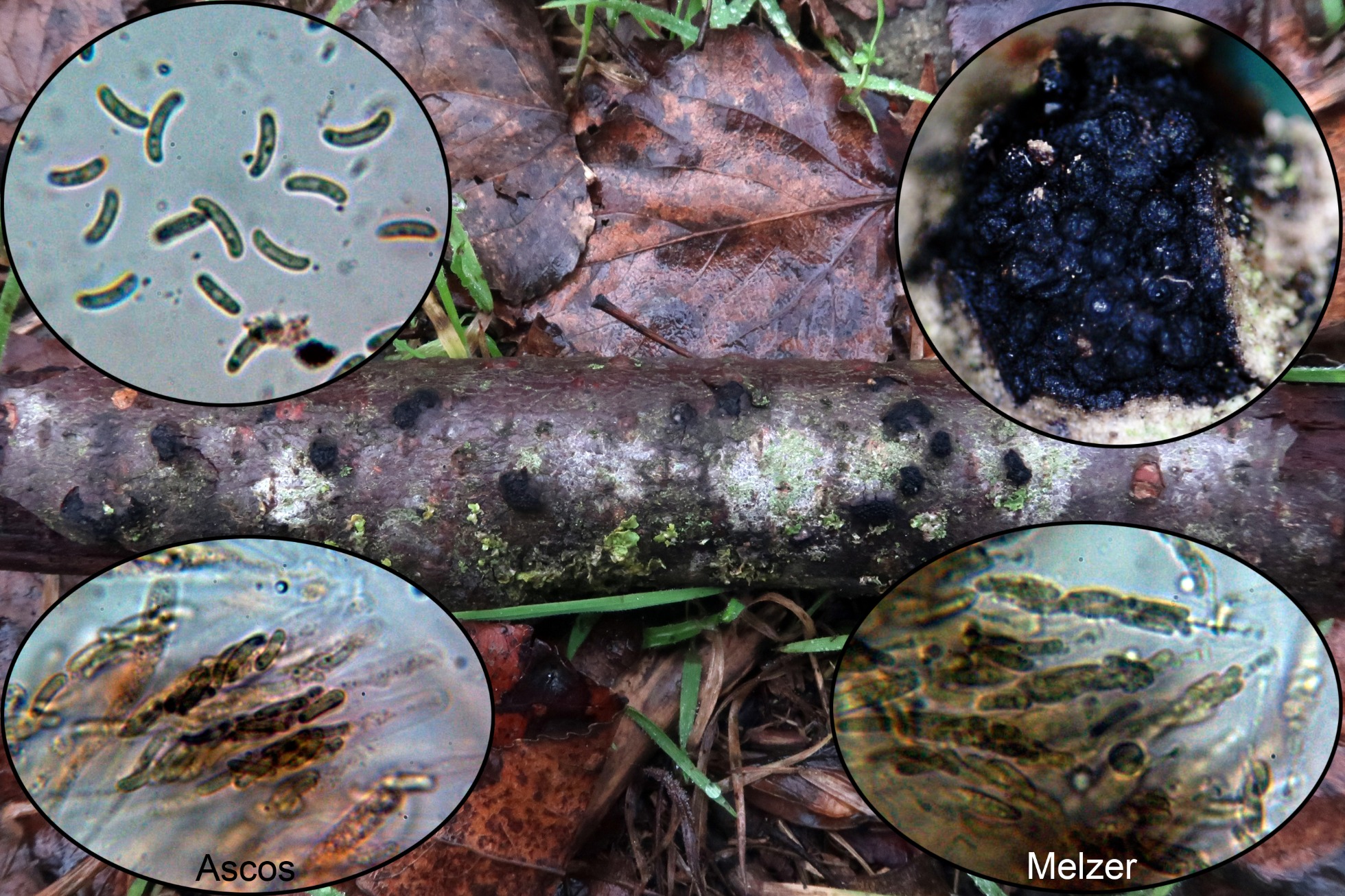 Una Eutypella del 29 de Noviembre de 2020, que a tenor de sus medidas esporales me generó bastantes dudas, el análisis molecular determinó que se trataba con una coincidencia del 100% de Eutypella cerviculata (GU062246)