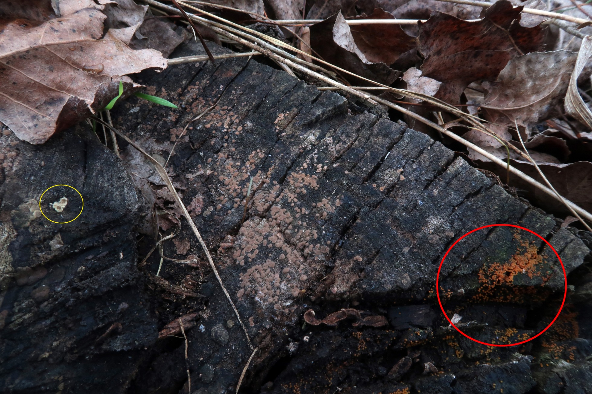 En el círculo rojo los ejemplares de Nectria peziza, por su aspecto y las características microscópicas, Baral opinó que probablemente se trataría del anamorfo de Lasiobelonium variegatum, propuesta muy plausible ya que en el círculo amarillo he marcado unos apotecios que podrían coincidir perfectamente con Lasiobelonium (por desgracia estos no los apercibí en el momento de la recogida y se quedaron en el tronco), nos habrían disipado dudas.