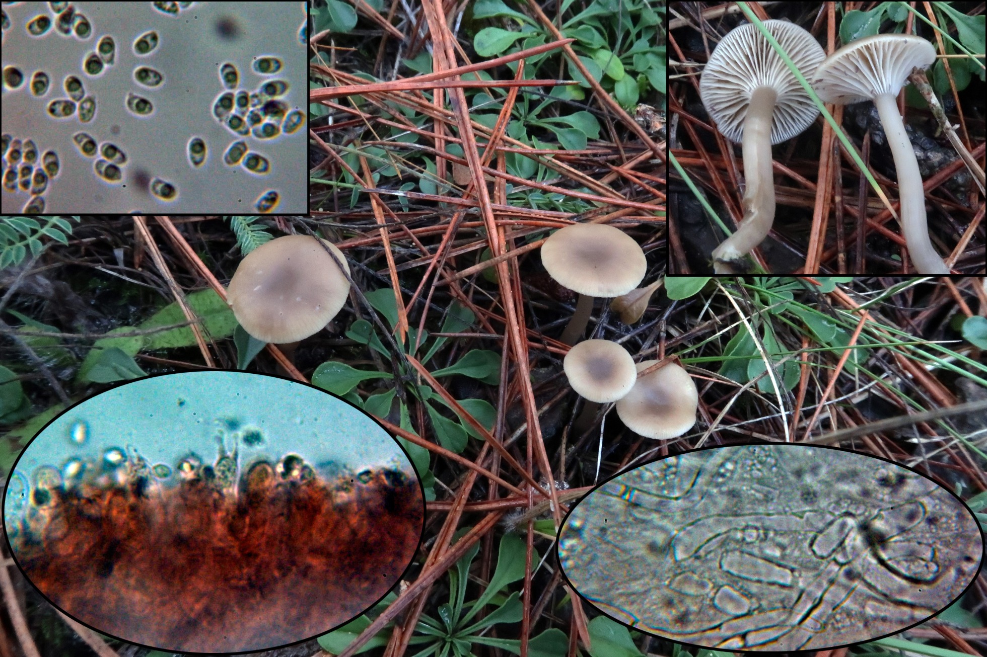 Y para terminar unas pequeñas setillas fotografiadas el 25 de Octubre de 2020, por el sombrero deprimido y las láminas decurrentes pensé en un pequeño Clitocybe, como que la microscopía no me terminaba de encajar con el género, opté por el análisis molecular, la secuenciación ITS determinó que coincidía con dos, 100 % Tephrocybe striaepilea (KP192647) y 100 % T. platypus (KC962411).