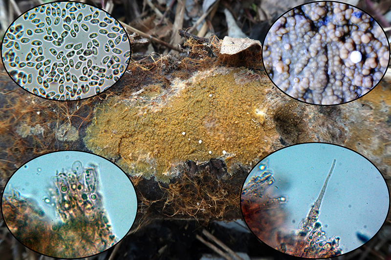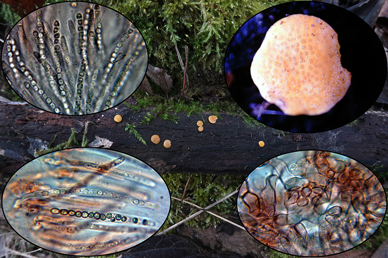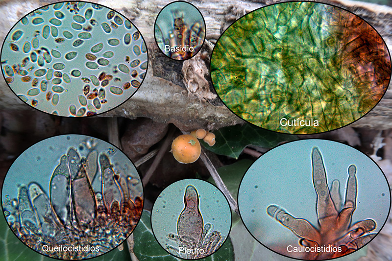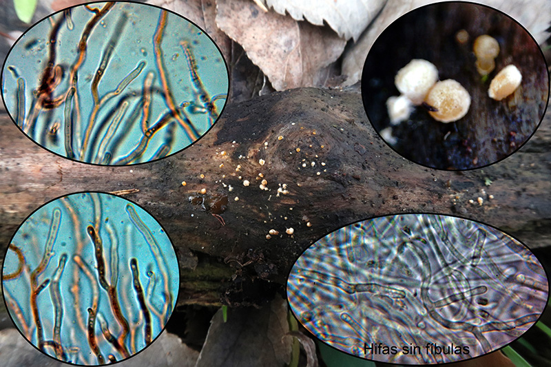 Un Dacrymyces, dado su pequeño tamaño (entre 0,8 y 1,1 mm.) y la ausencia de fíbulas, las claves del género me llevan a solo 2, el Dacrymyces intermedius y el Dacrymyces minor, aunque no pude obtener esporas el tamaño apunta mas al Dacrymyces minor (el Dacrymyces intermedius presenta un tamaño aún menor), para algunos el Dacrymyces minor es una variedad del Dacrymyces stillatus, asi que de momento este se queda como Dacrymyces cf. minor