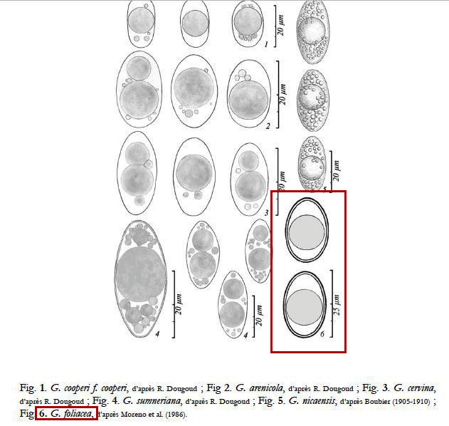 Añado una imágen del mismo autor con una comparativa de la morfología esporal de las distintas especies del género, donde he remarcado las de la Geopora foliacea.