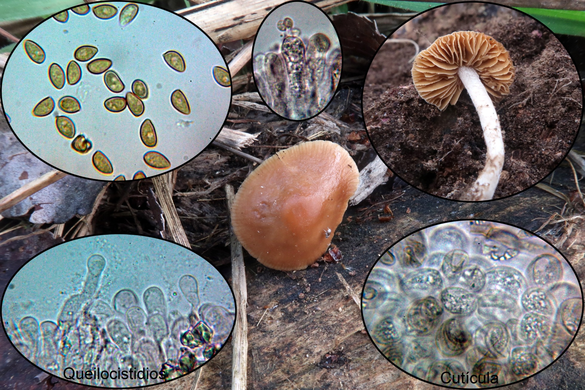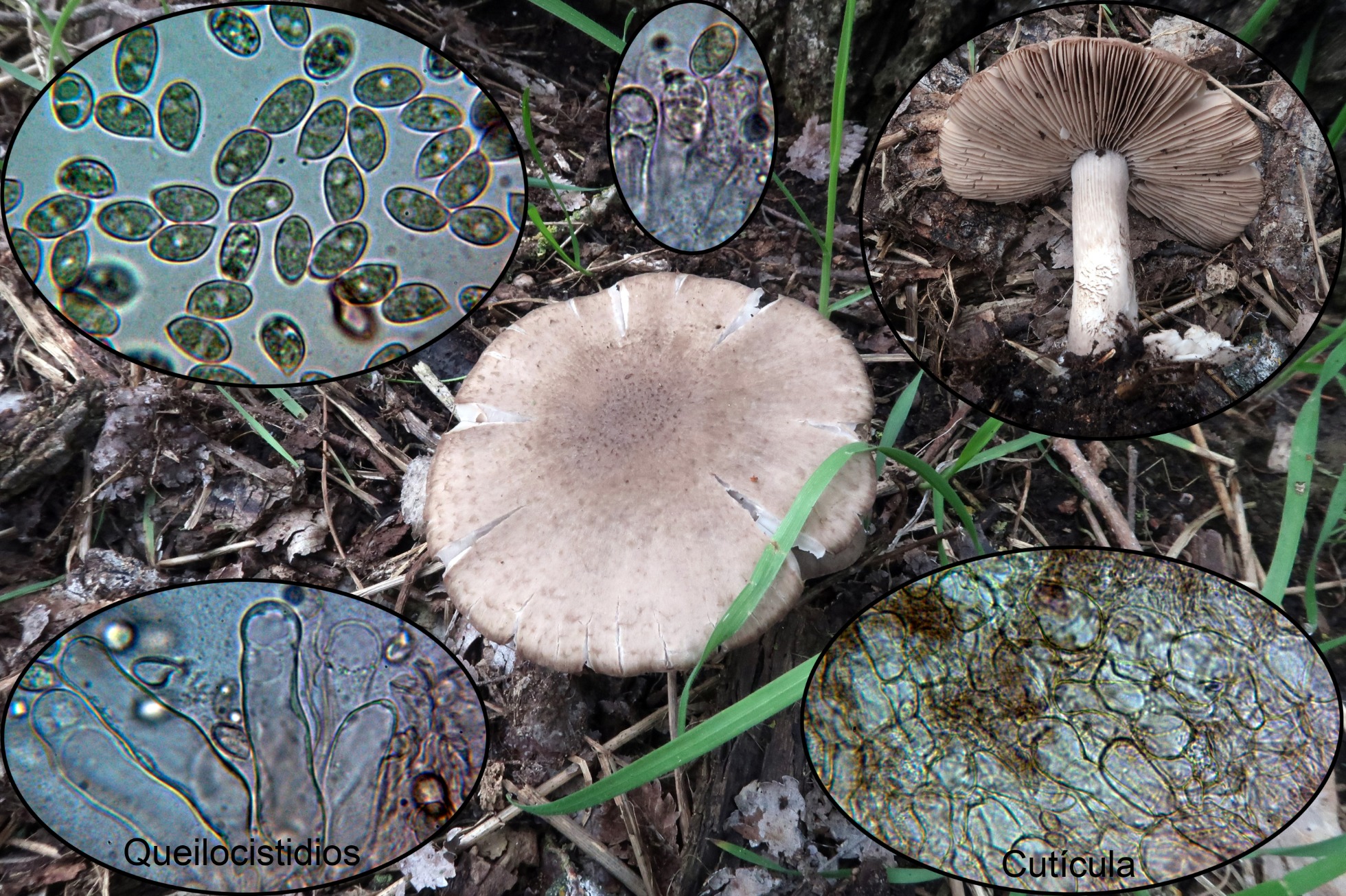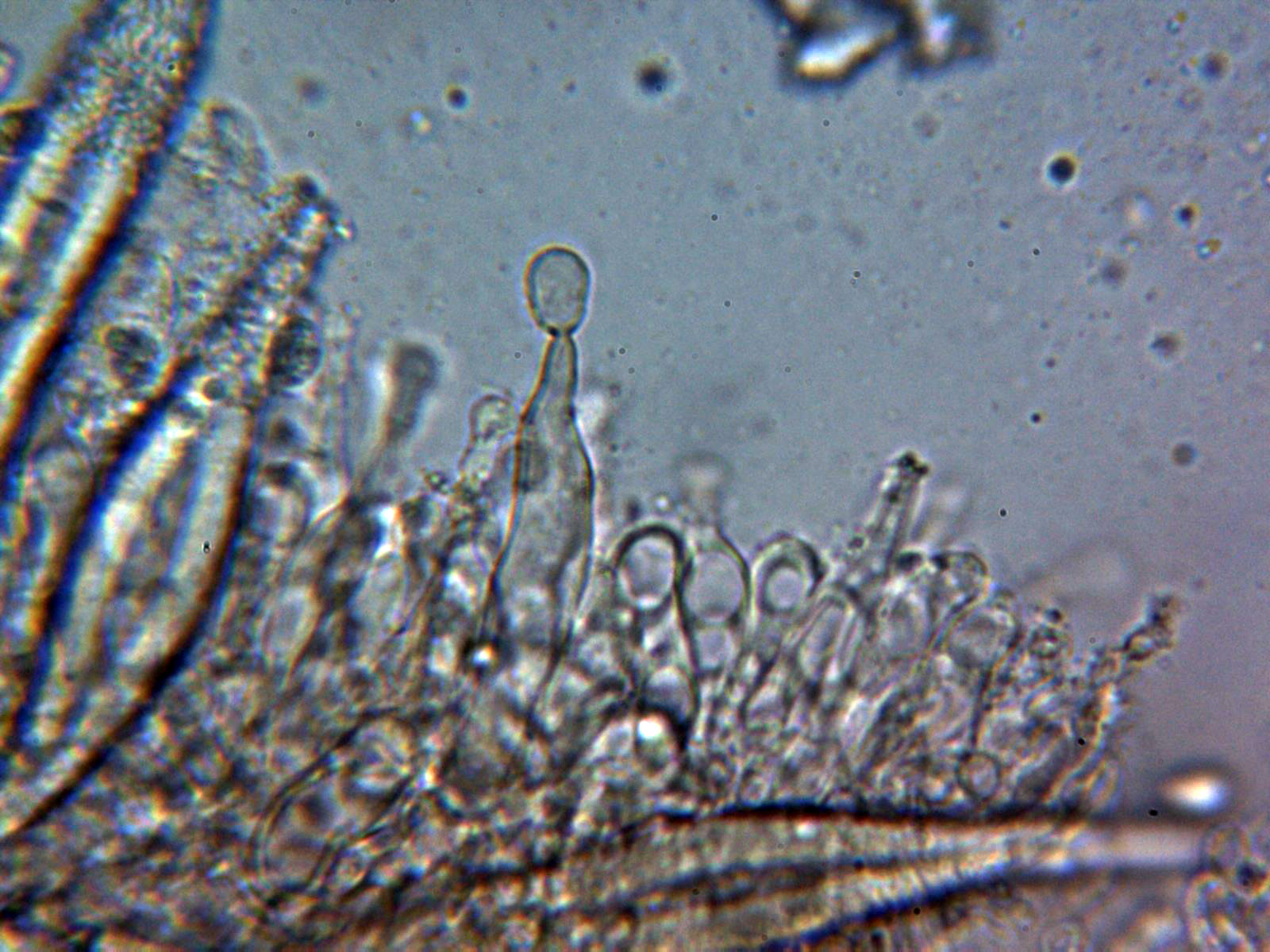 Seguimos con una Hohenbuehelia, siguiendo la Revisión del género de 2018 de Giovanni Consiglio y Ledo Setti, con la pileipellis sin pileogliosfex, con grandes queilocistidios metuloides con unas medidas de 51.1 - 66.7 × 10.5 - 13.7 µm. (según las claves de 33-61 x 9,8-13 µm.), estos queilocistidios mezclados con Queilogliosfex, y esporas con una media en mi caso de 7.4 × 4.9 µm. muy cerca de la indicada en las claves de 7,5 x 4,7 µm. y con un cociente Q = (1.3) 1.4 - 1.6 (1.8), totalmente acorde con las claves Q= 1,40-1,88, conducen solo a la Hohenbuehelia mastrucata, se trataría para mí de un "cromo nuevo".