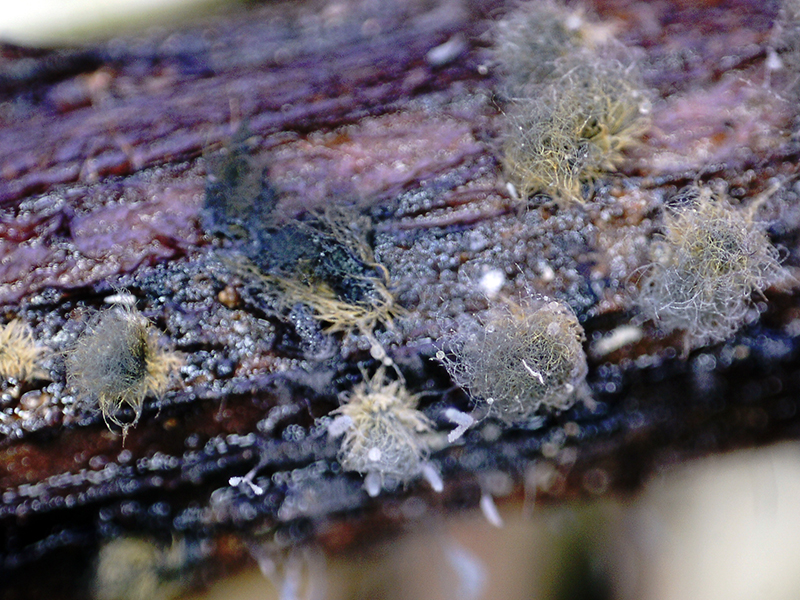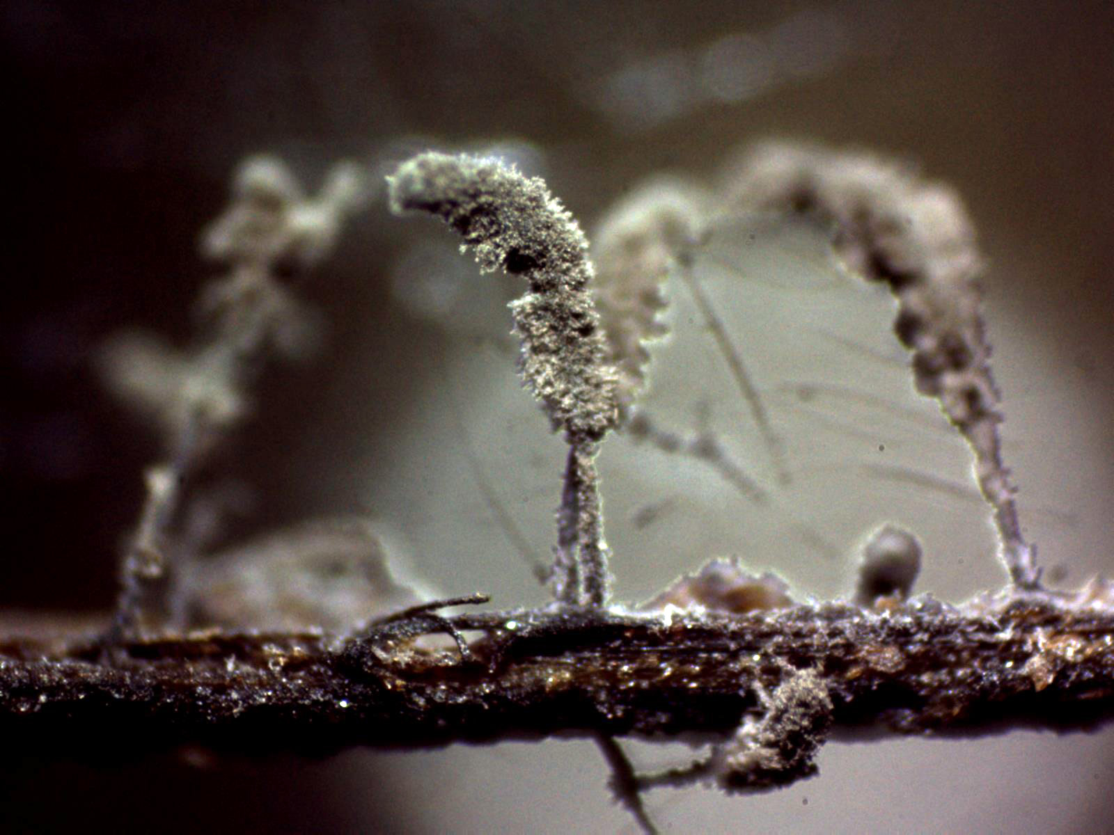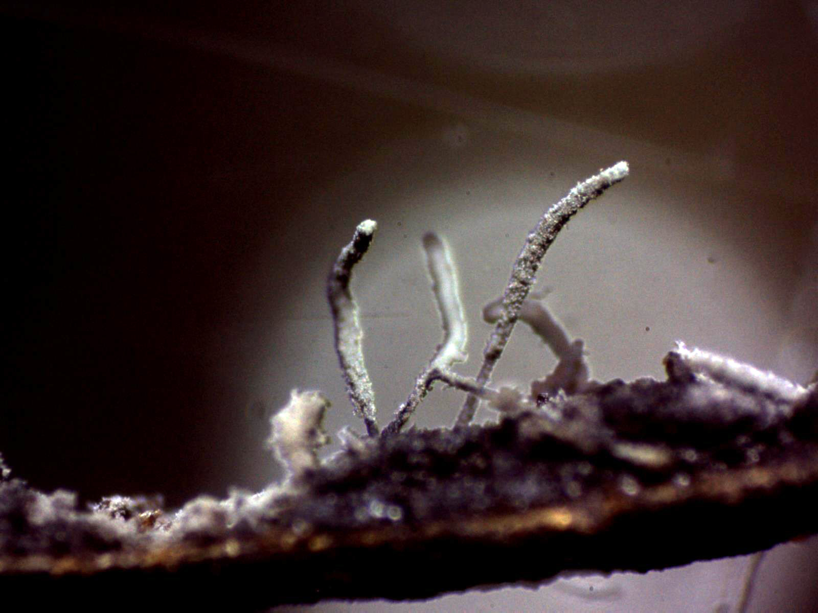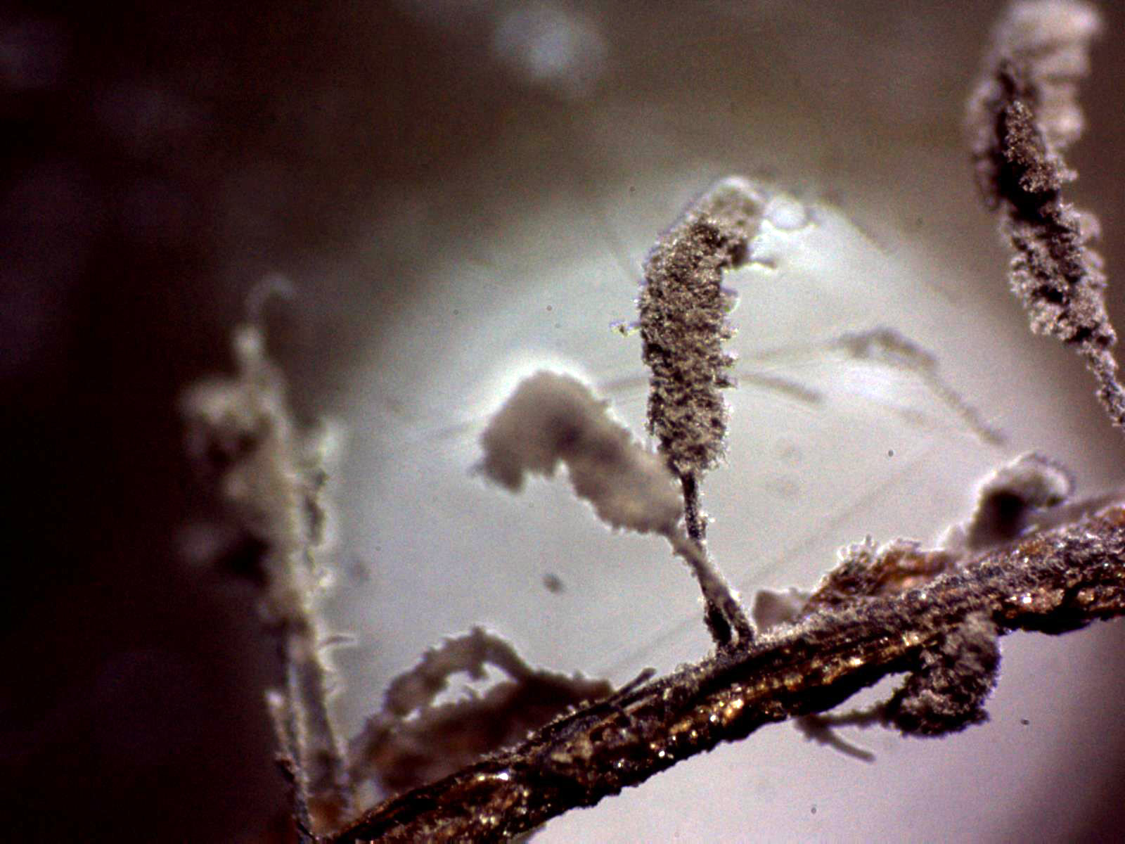 Unos diminutos ascomicetos peludos, con forma esférica y color marrón verdoso, con unas medidas de entre 0,9 a 1,7 mm. de diámetro total, brotando en un pequeño tronco de arbusto indeterminado procedente de las labores de limpeza en un campo de cultivo, cerca de un cauce contínuo de agua destinado al regadío.