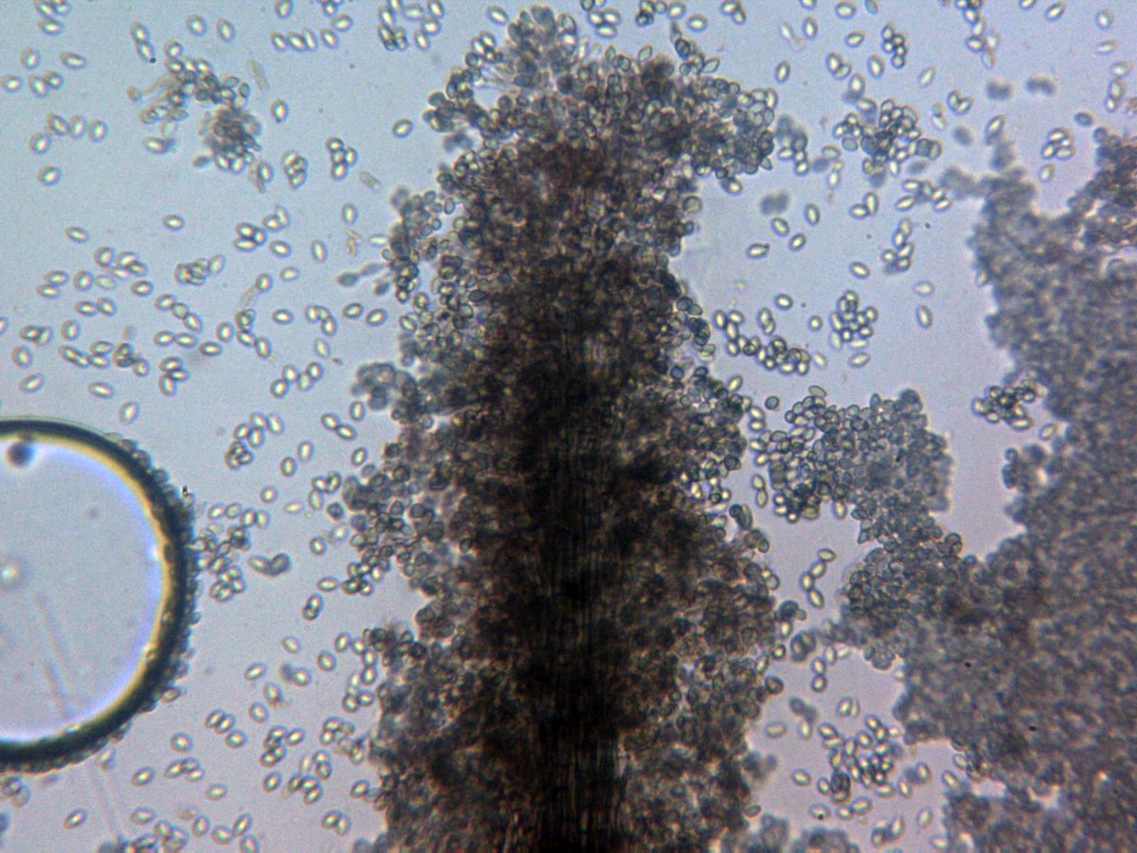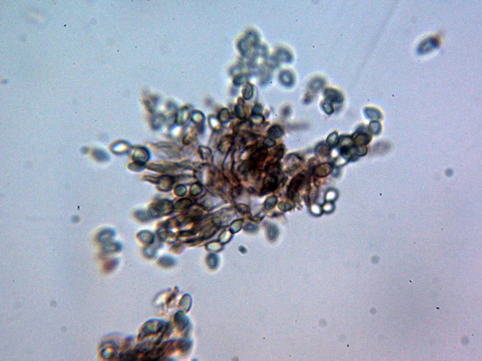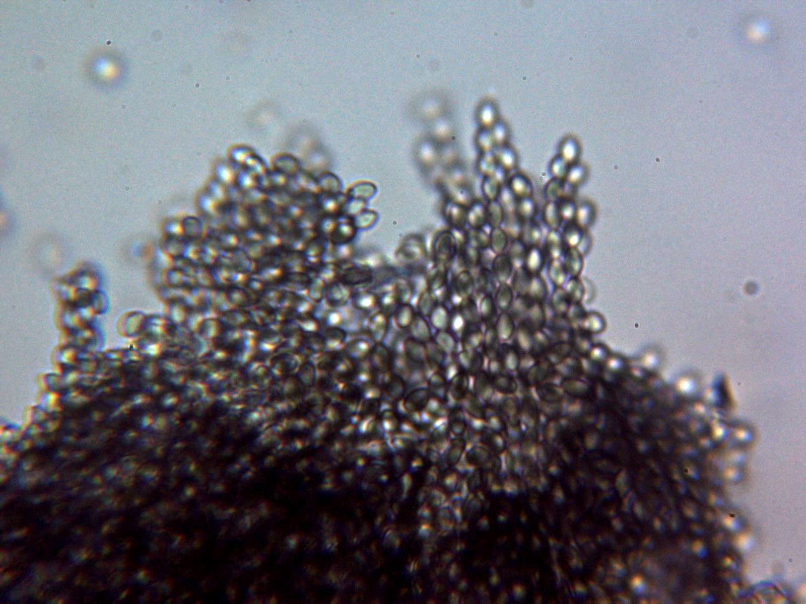 Al comprimir la muestra al eclosionar, del interior surgen una gran cantidad de esporas, aunque no pude observar ascos con esporas en su interior, esto puede ser debido a la gran fragilidad de los mismos.