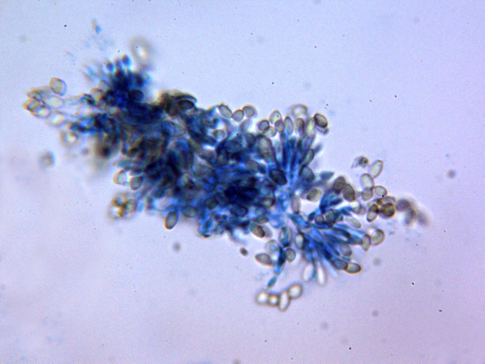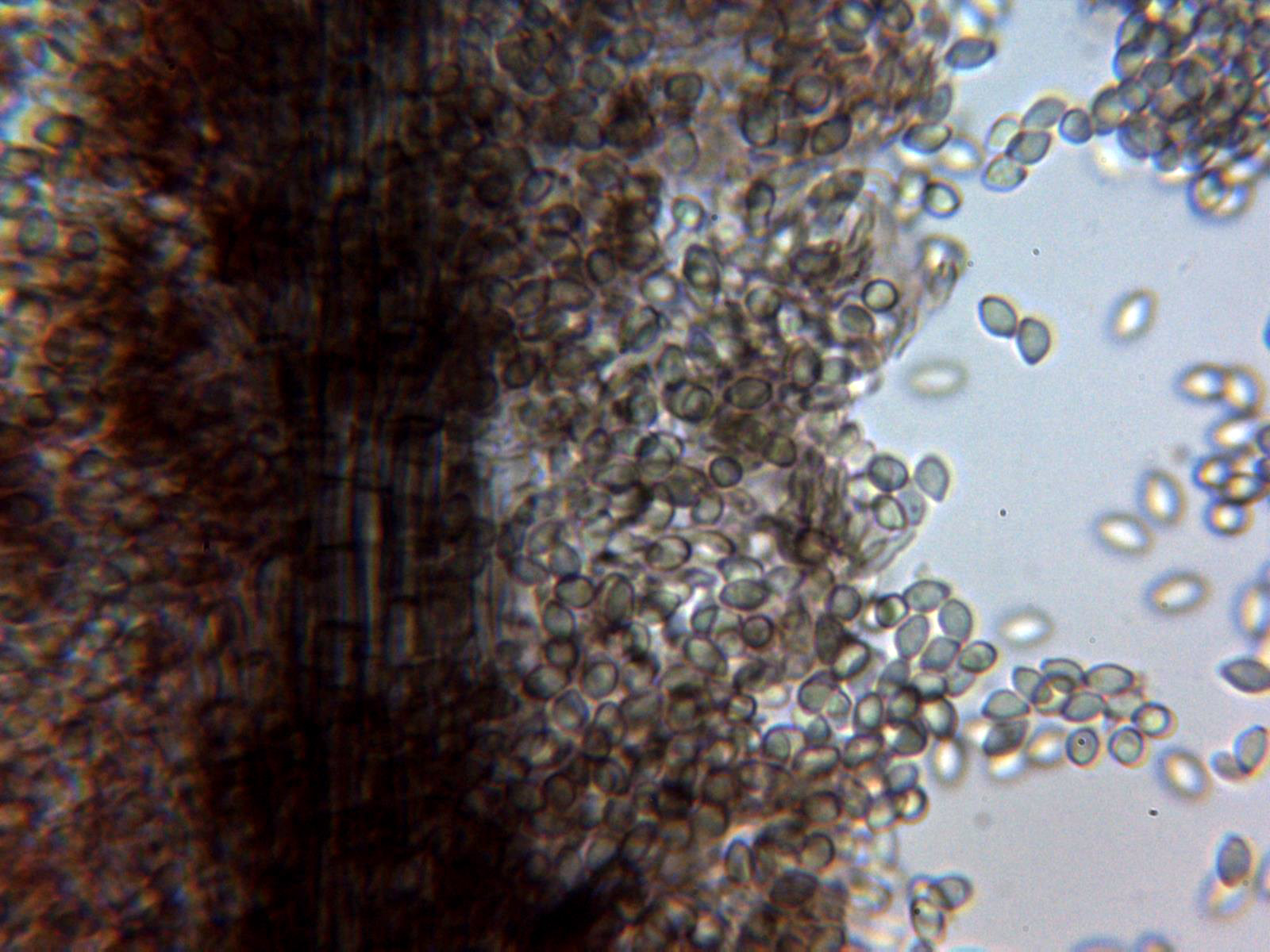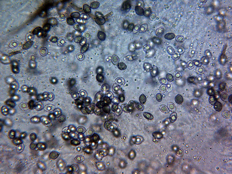 Al comprimir la muestra al eclosionar, del interior surgen una gran cantidad de esporas, aunque no pude observar ascos con esporas en su interior, esto puede ser debido a la gran fragilidad de los mismos.