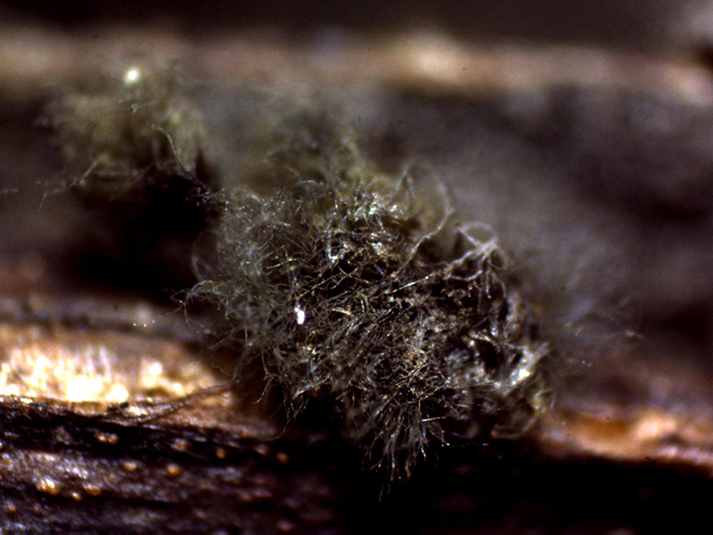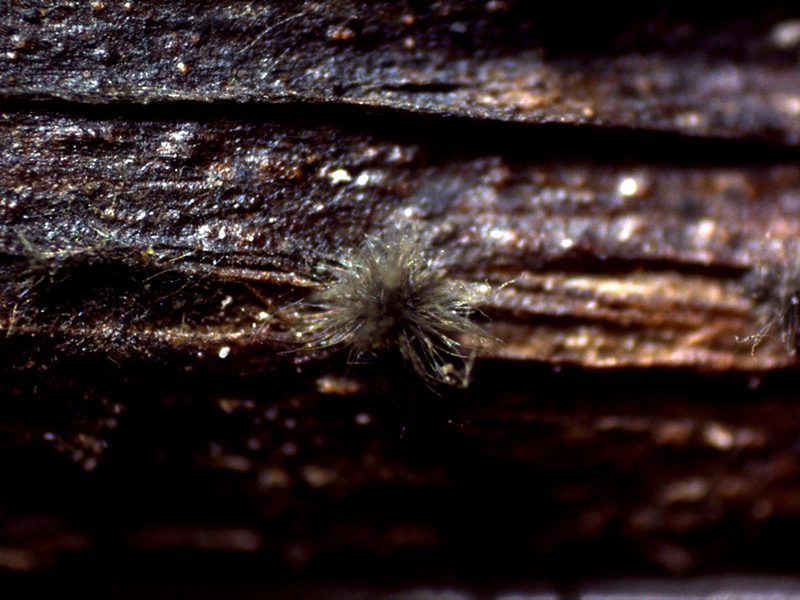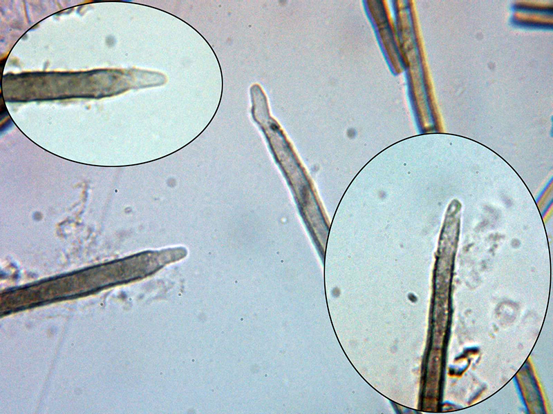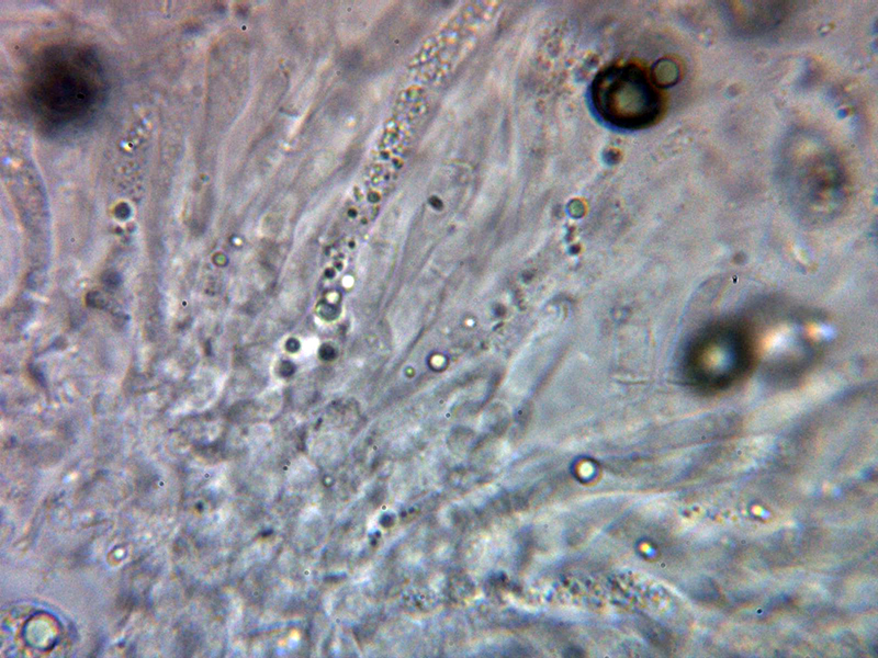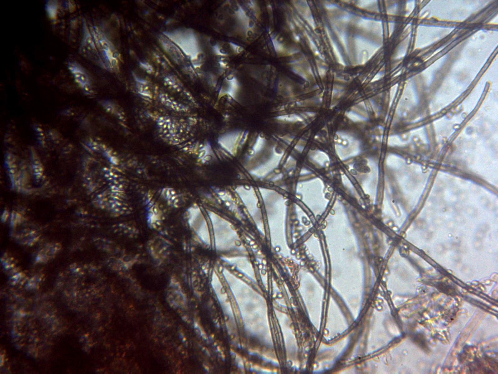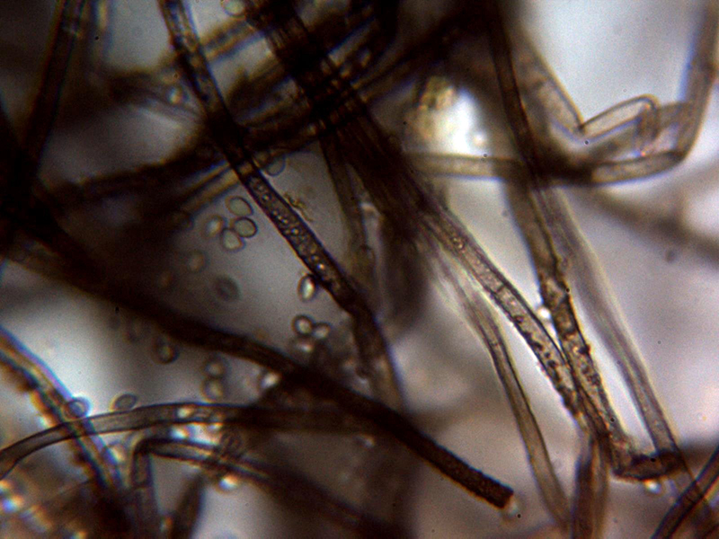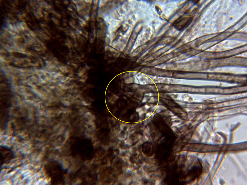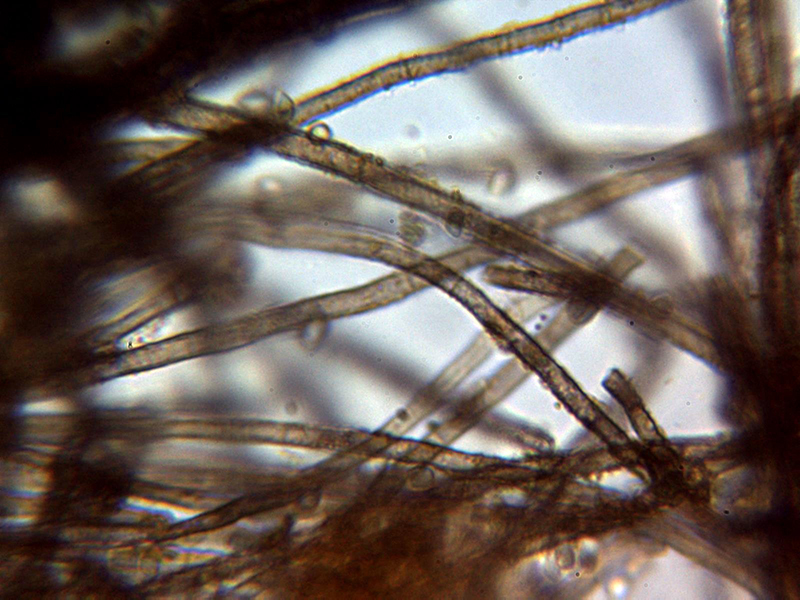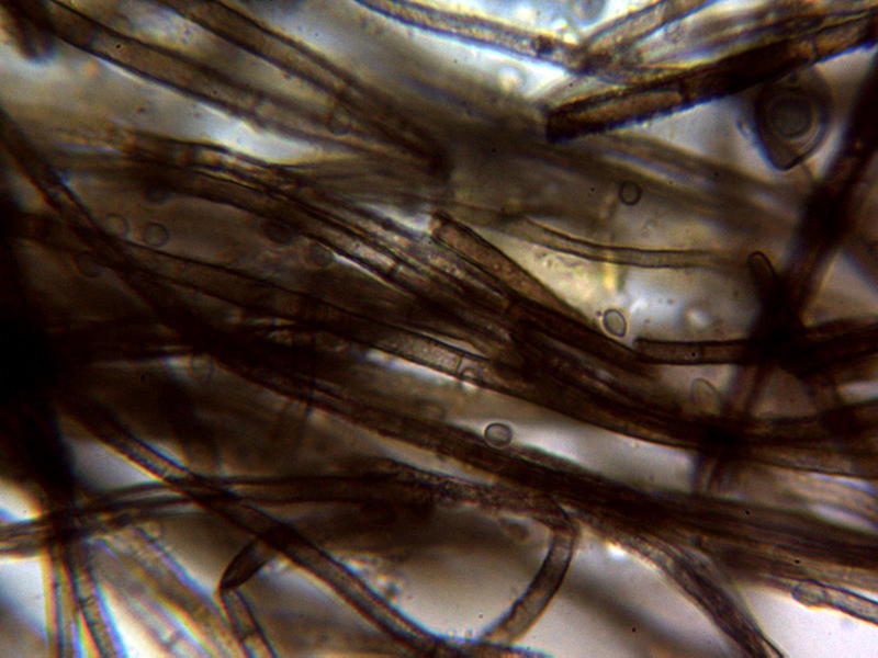 Toda la superficie externa repleta de largos pelos marrones al microscopio, con una anchura de entre 2,1 a 4,3 µm. con muchos septos, algunos bifurcados en la base, sin ramificaciones dicotómicas, con el ápice hialino y terminado con formas redondeadas. La superficie de las hifas mayoritariamente con finas granulaciones.