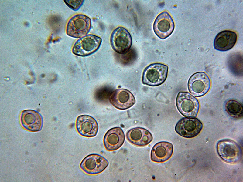 Ascosporas de forma entre ovoide y cortamente elipsoide, con los extremos apuntados y en muchos casos como si las hubieran pellizcado, como en forma de limón, entre hialinas y de color marrón oscuro, probablemente debido al distinto estado de maduración, con una o dos grandes gotas lípidas en su interior y con abundantes granulaciones mas pequeñas, las medidas de esta ascosporas de: